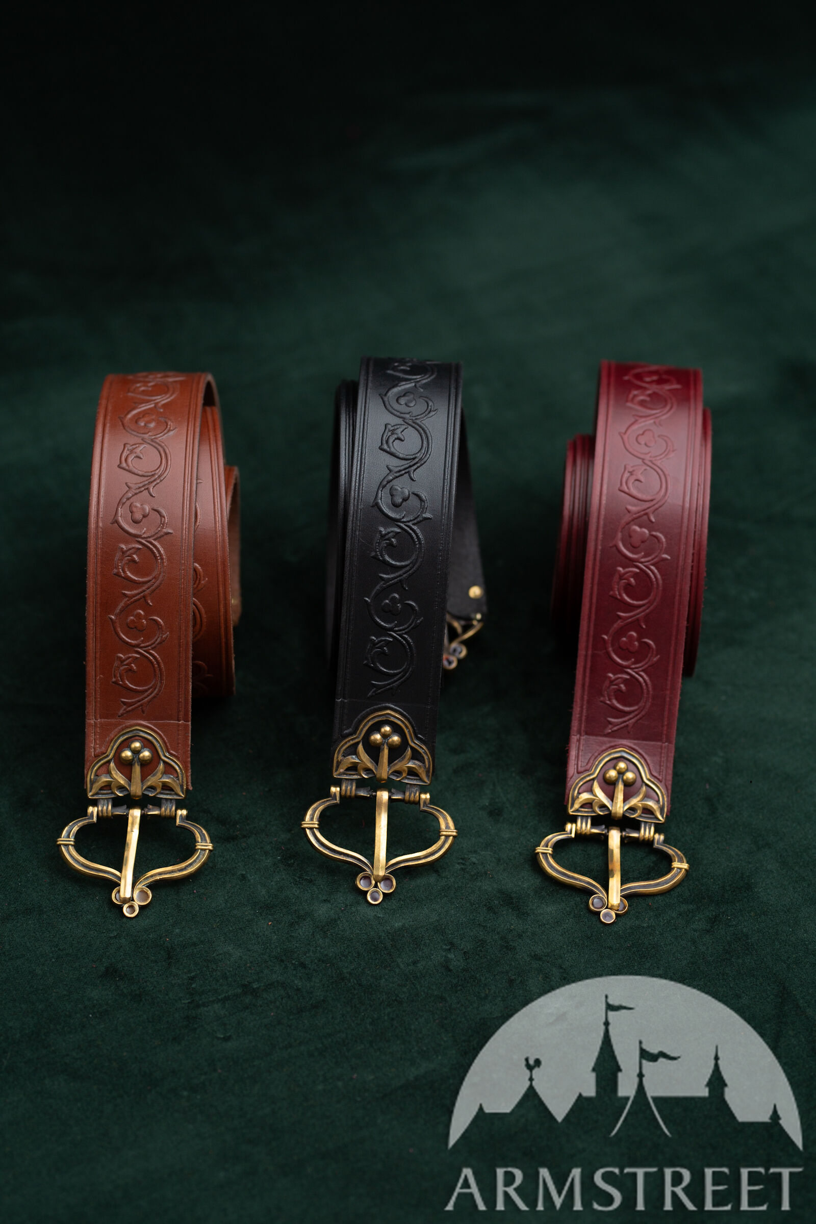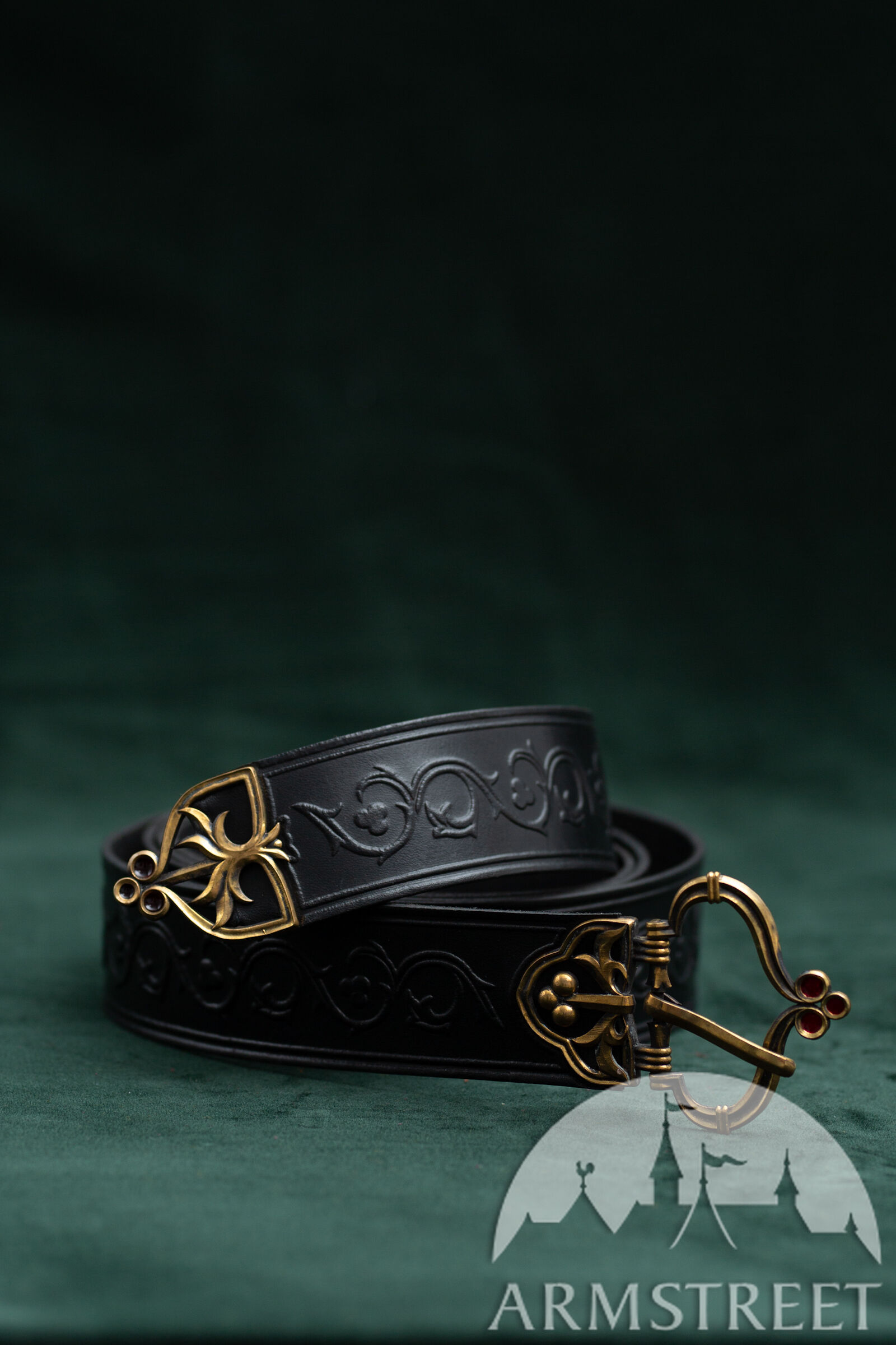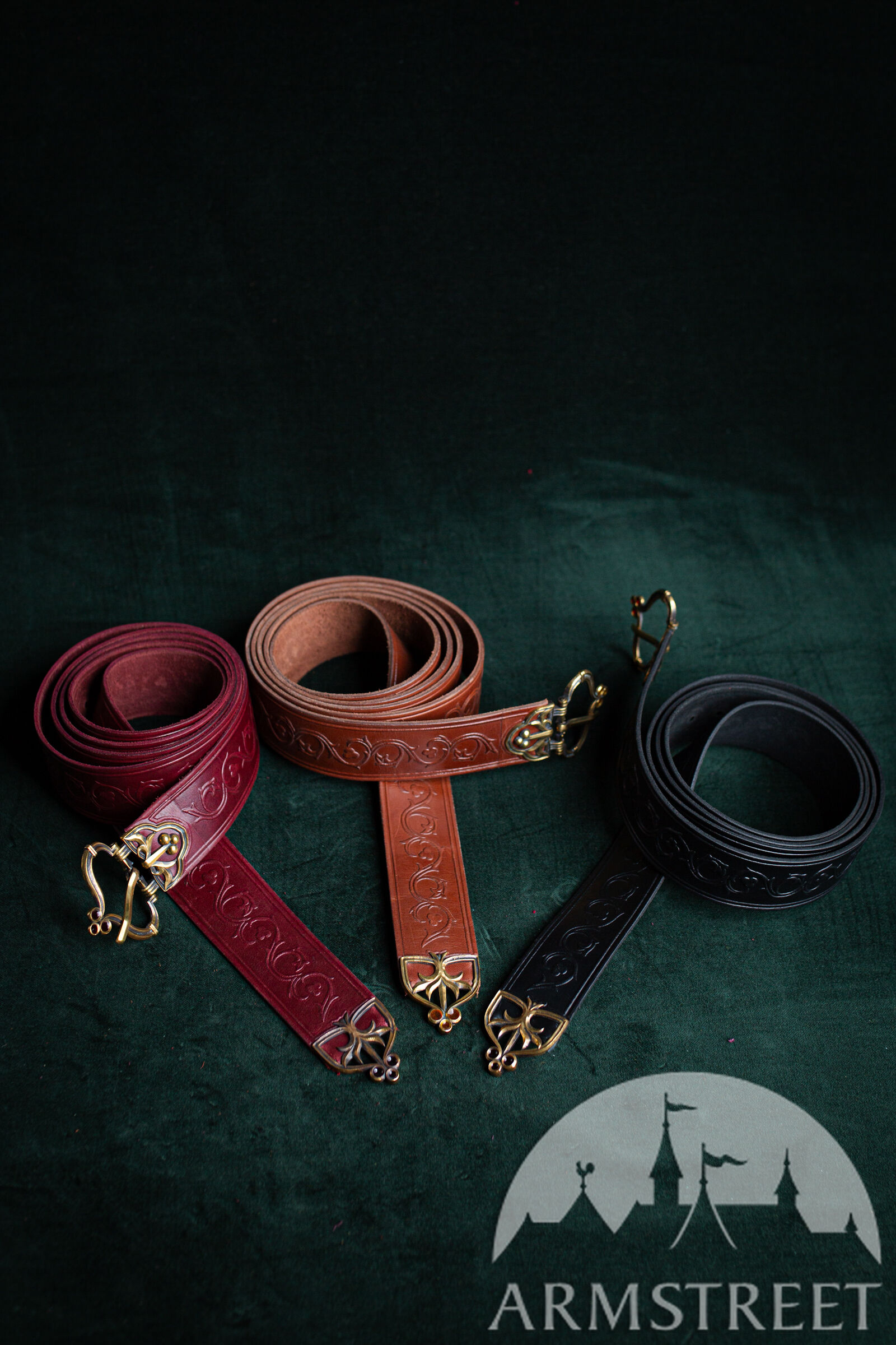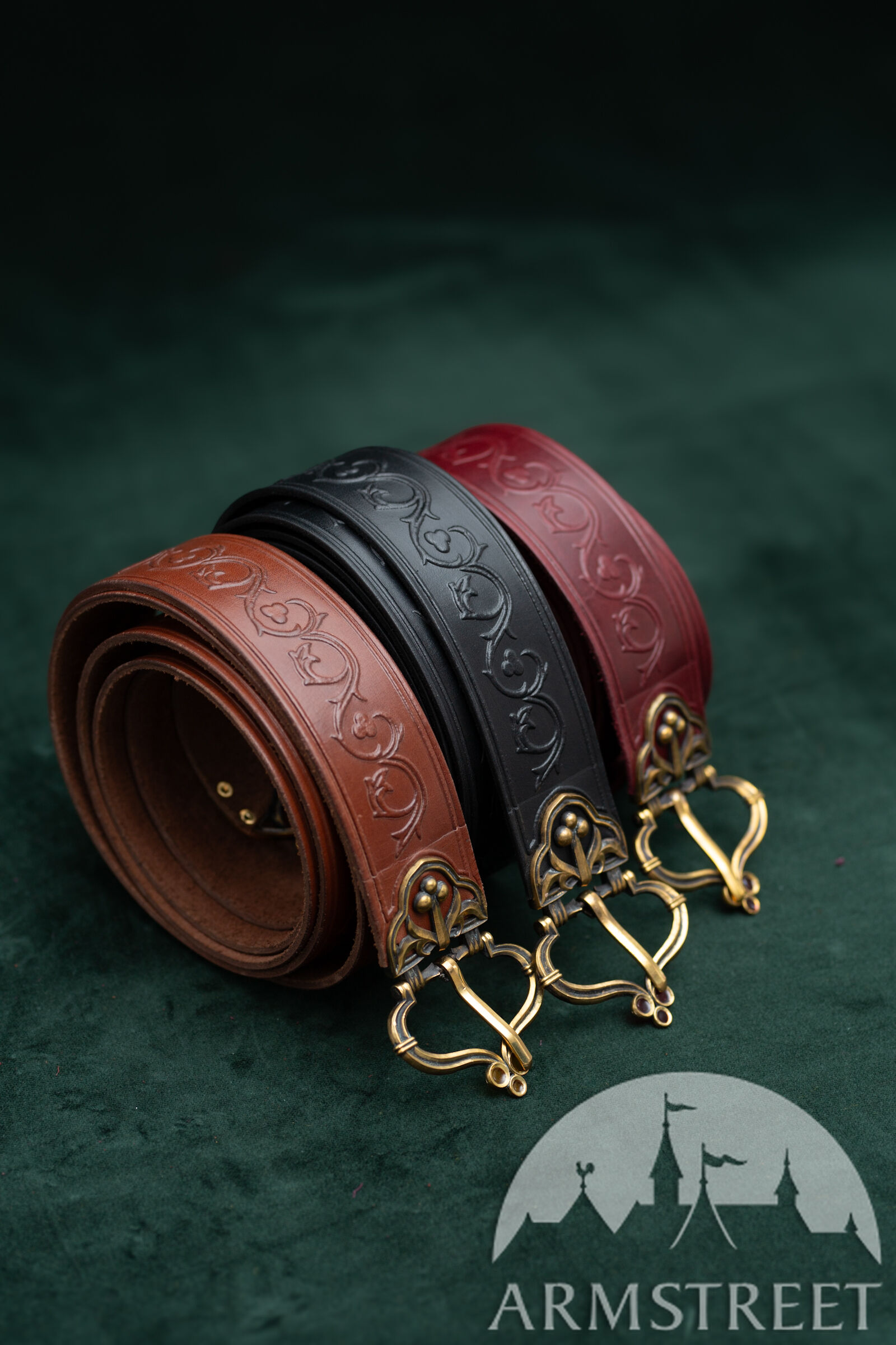 Le cuir naturel de haute qualité est orné d'un gaufrage floral inspiré de sources historiques. Cette ceinture est disponible dans une variété de couleurs pour s'harmoniser avec les couleurs de votre maison, vos autres accessoires ou simplement pour vous offrir la jolie nuance de vert que vous recherchez depuis longtemps. La boucle et l'embout sont conçus spécialement pour cette ceinture, et chaque élément s'harmonise parfaitement, contribuant ainsi à l'ensemble. Des touches d'émail sont ajoutées aux deux éléments en laiton moulé de cette ceinture de style médiéval ; à la lumière, vous remarquerez leur transparence. Sous certains angles et éclairages, ces petits détails s'illumineront de couleurs, ajoutant encore plus de magie à votre allure déjà remarquable. Cette ceinture de chevalier est légèrement plus large et de longueur fixe.
