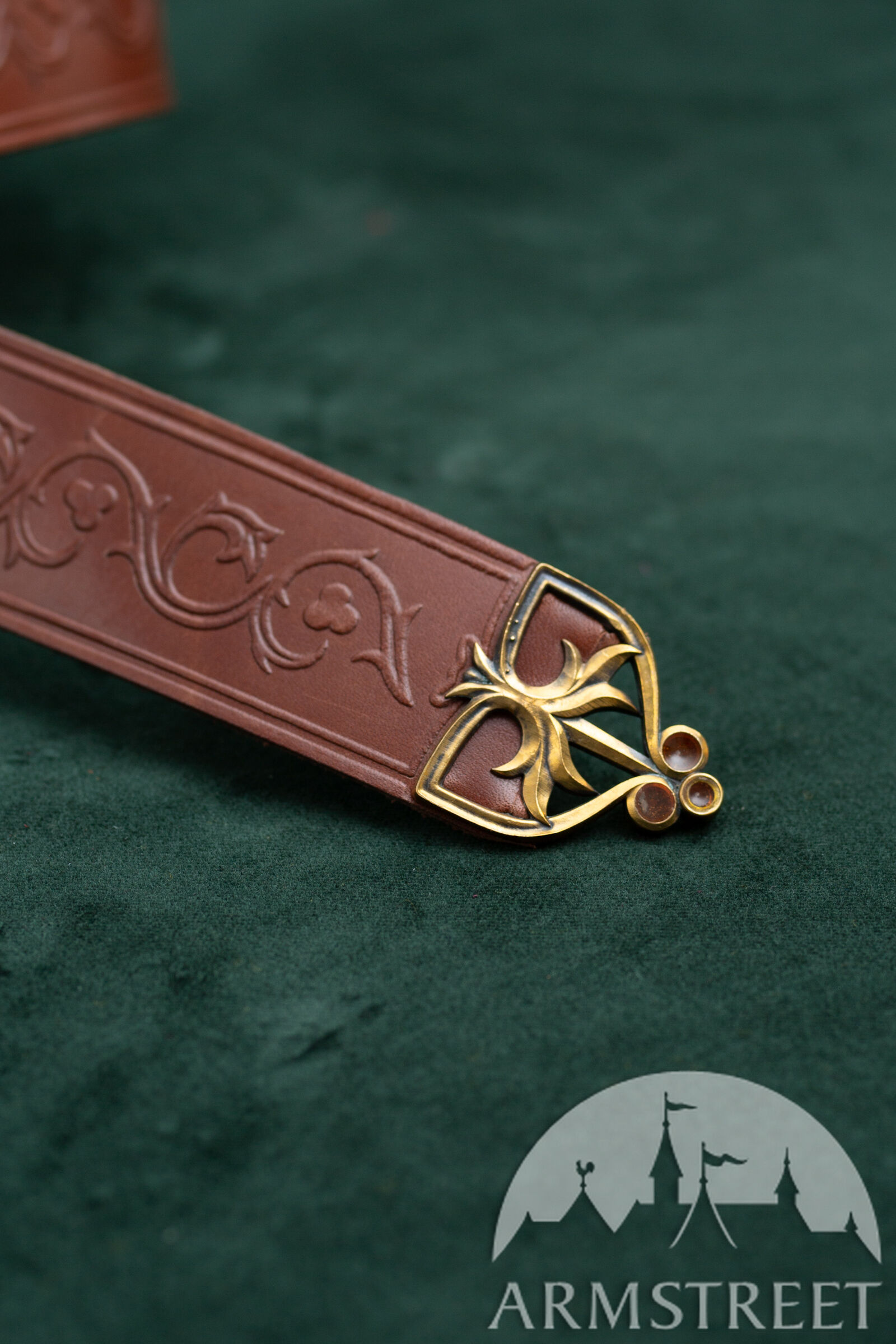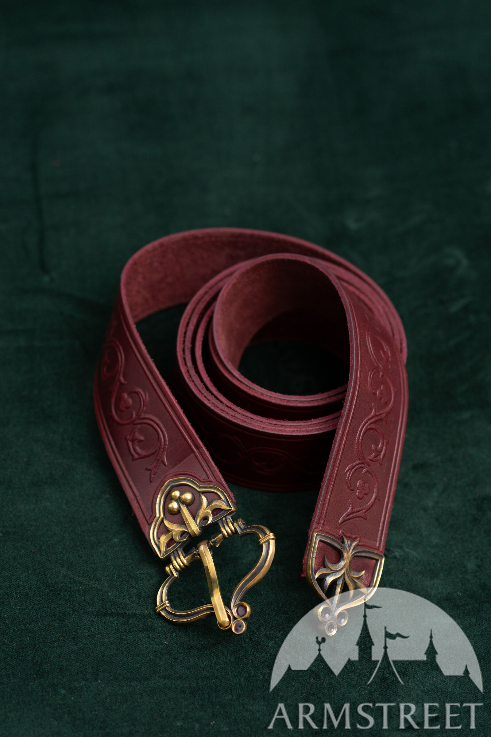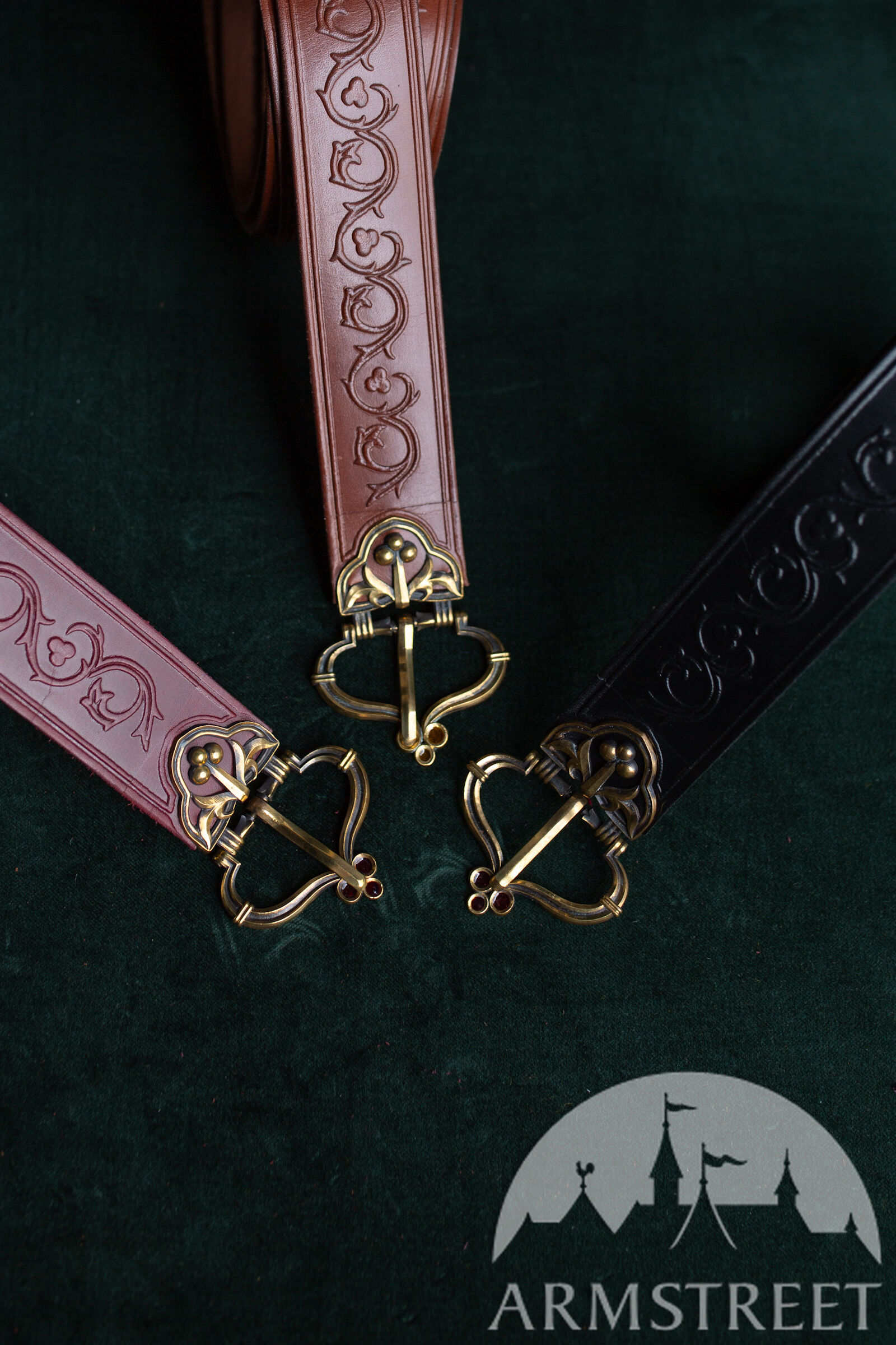 Le cuir naturel de haute qualité est orné d'un gaufrage floral inspiré de sources historiques. Cette ceinture est disponible dans une variété de couleurs pour s'harmoniser avec les couleurs de votre maison, vos autres accessoires ou simplement pour vous offrir la jolie nuance de vert que vous recherchez depuis longtemps. La boucle et l'embout sont conçus spécialement pour cette ceinture, et chaque élément s'harmonise parfaitement, contribuant ainsi à l'ensemble. Des touches d'émail sont ajoutées aux deux éléments en laiton moulé de cette ceinture de style médiéval ; à la lumière, vous remarquerez leur transparence. Sous certains angles et éclairages, ces petits détails s'illumineront de couleurs, ajoutant encore plus de magie à votre allure déjà remarquable. Cette ceinture de chevalier est légèrement plus large et de longueur fixe.
