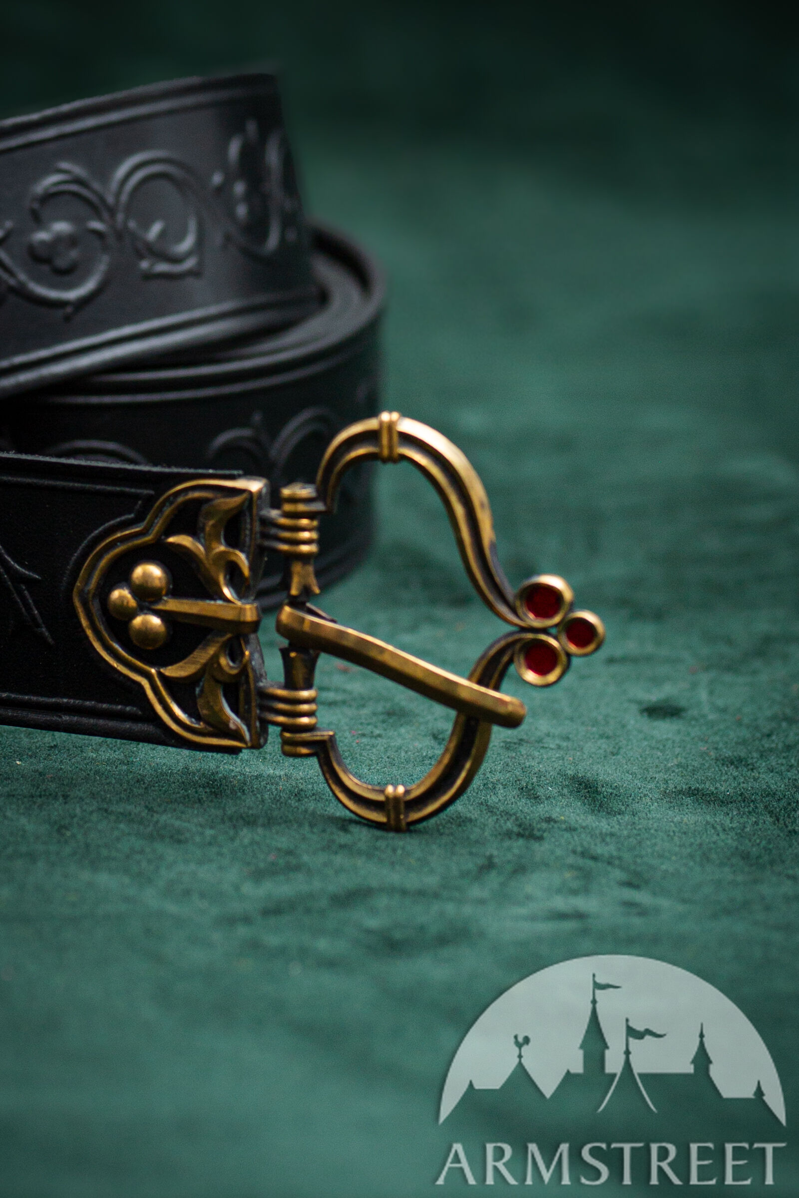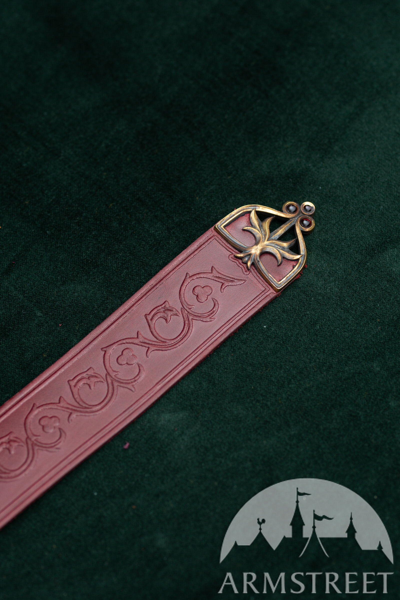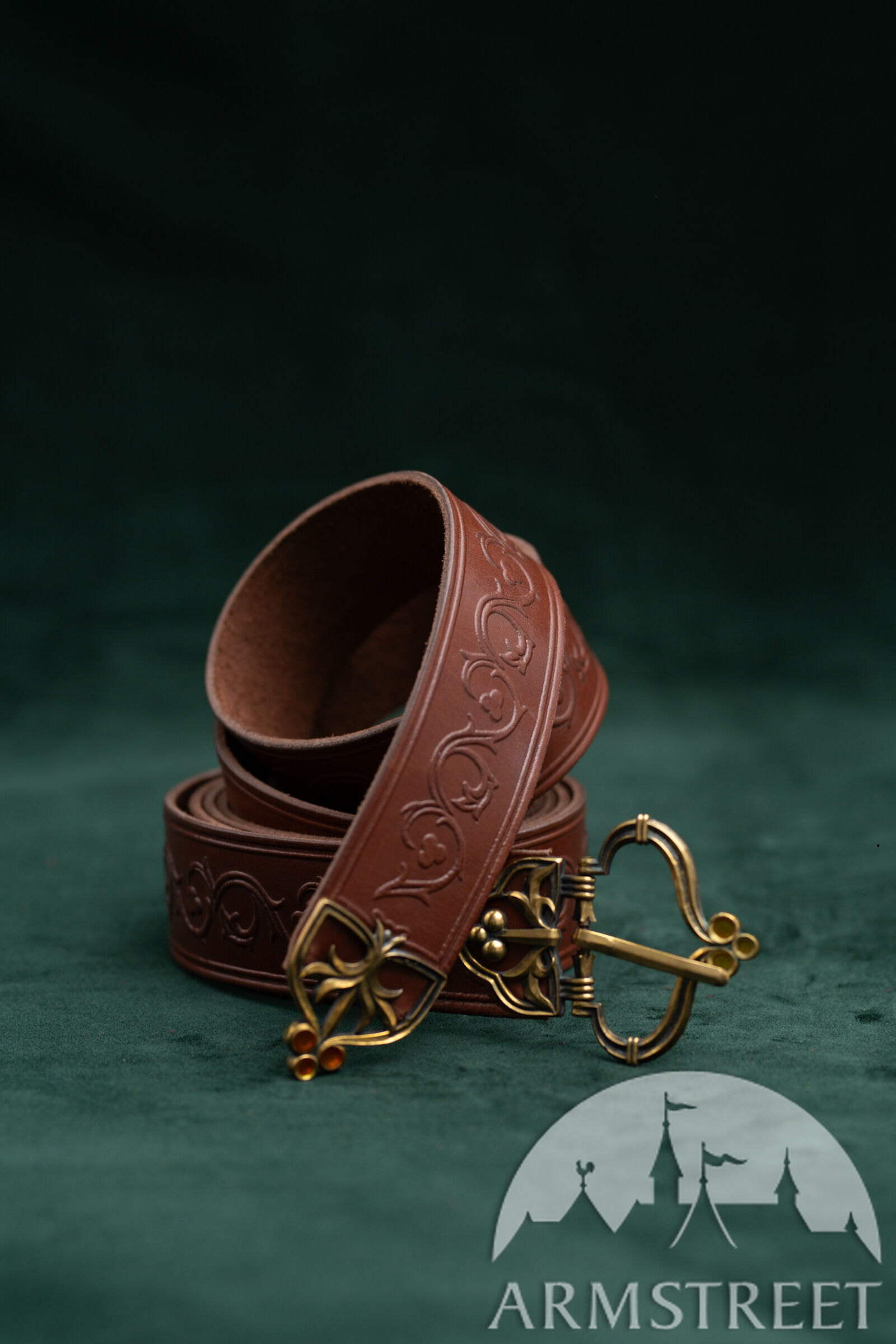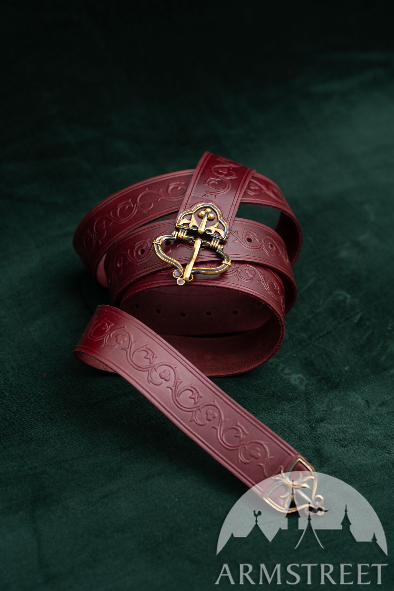 Le cuir naturel de haute qualité est orné d'un gaufrage floral inspiré de sources historiques. Cette ceinture est disponible dans une variété de couleurs pour s'harmoniser avec les couleurs de votre maison, vos autres accessoires ou simplement pour vous offrir la jolie nuance de vert que vous recherchez depuis longtemps. La boucle et l'embout sont conçus spécialement pour cette ceinture, et chaque élément s'harmonise parfaitement, contribuant ainsi à l'ensemble. Des touches d'émail sont ajoutées aux deux éléments en laiton moulé de cette ceinture de style médiéval ; à la lumière, vous remarquerez leur transparence. Sous certains angles et éclairages, ces petits détails s'illumineront de couleurs, ajoutant encore plus de magie à votre allure déjà remarquable. Cette ceinture de chevalier est légèrement plus large et de longueur fixe.