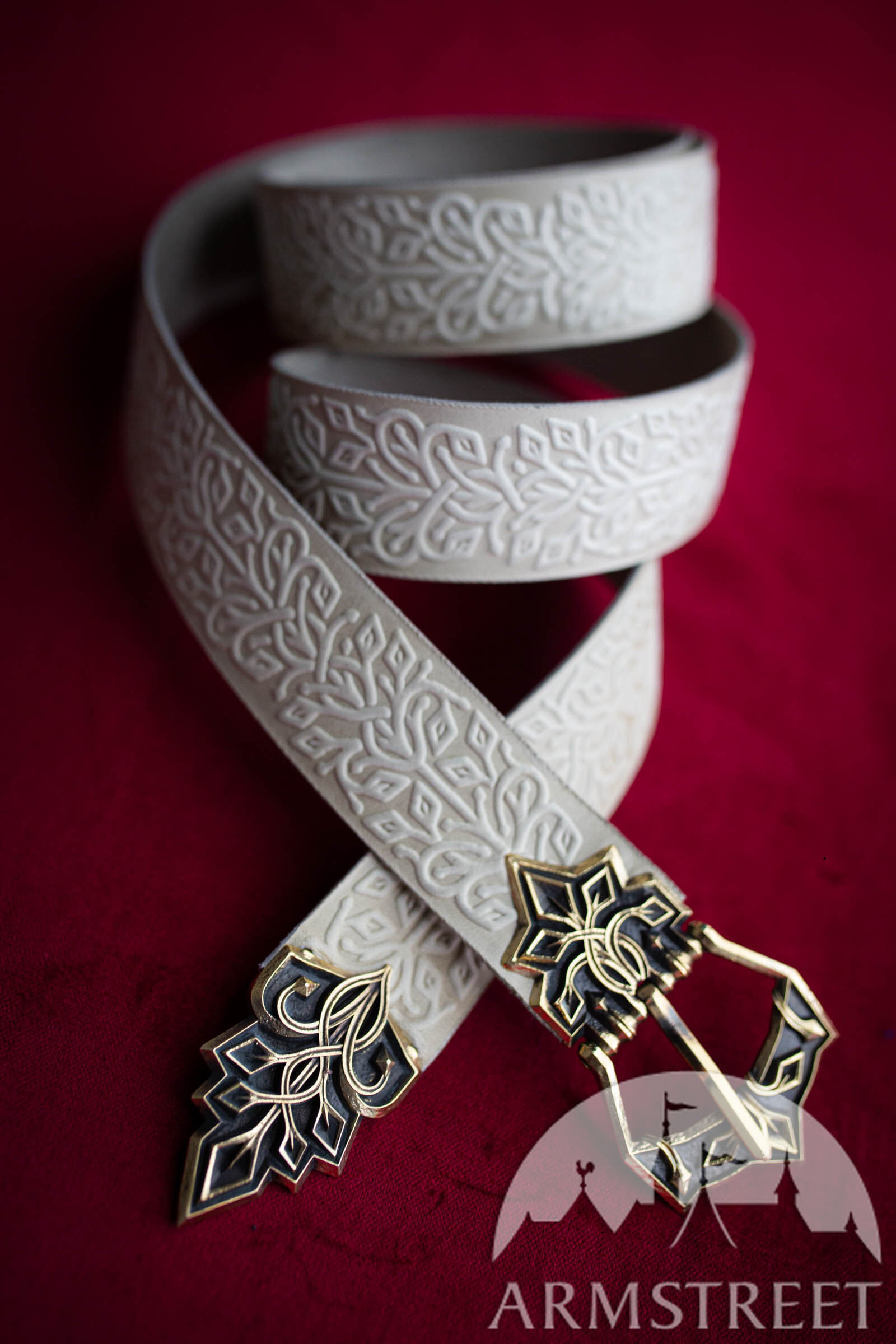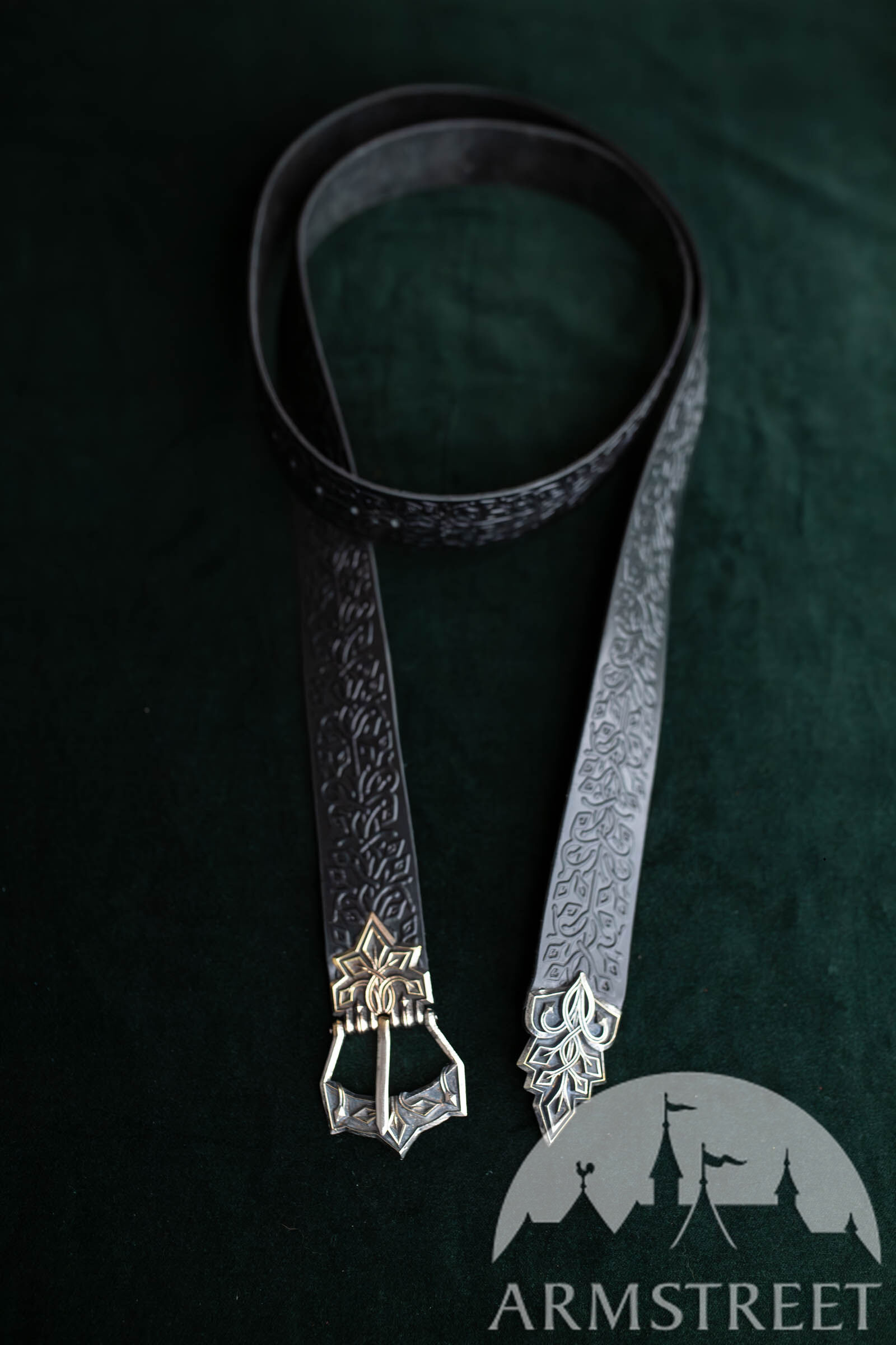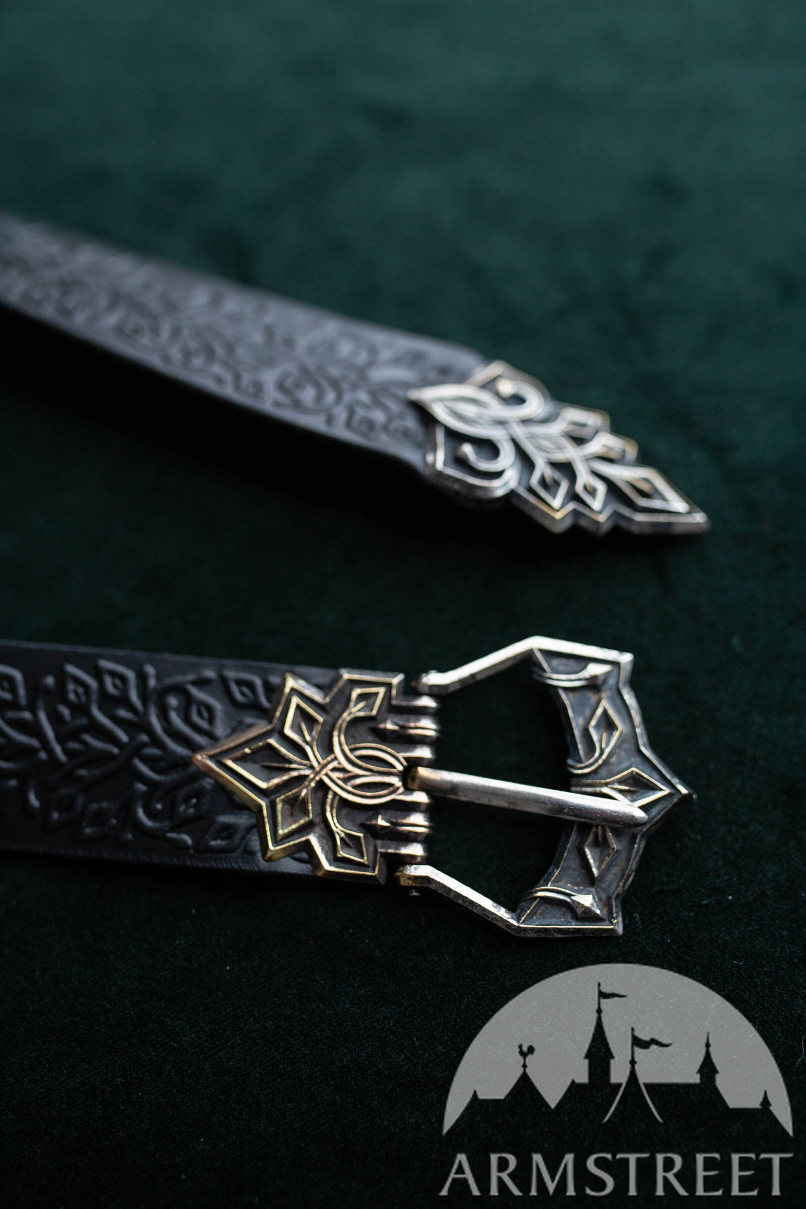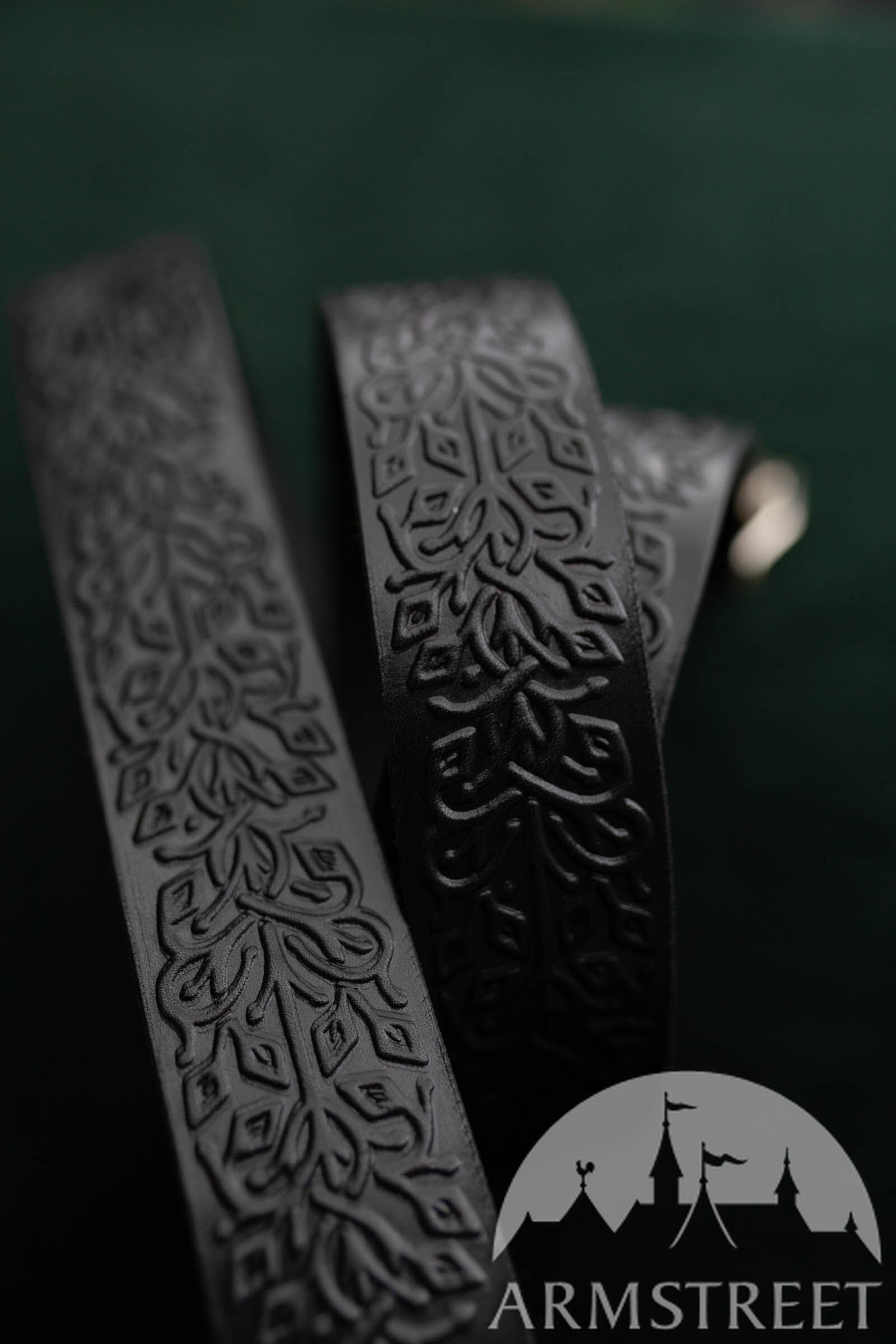 La ceinture est constituée d'une seule pièce de cuir de haute qualité, profondément embossée d'un motif en forme de vigne. Cette ceinture de longueur fixe est assez large, ce qui lui confère une réelle présence dans votre costume. Le motif a été conçu par notre équipe d'artistes, qui s'est inspiré des bordures des manuscrits médiévaux. Vous pouvez également le reconnaître grâce au même gaufrage que celui trouvé sur notre sac « Le Loup Noir ». La boucle de cette ceinture a été fabriquée en interne par ArmStreet, ainsi que l'extrémité de la ceinture. Elles ont le même motif de feuilles sur le laiton coulé pour assurer un look assorti au reste de la ceinture.