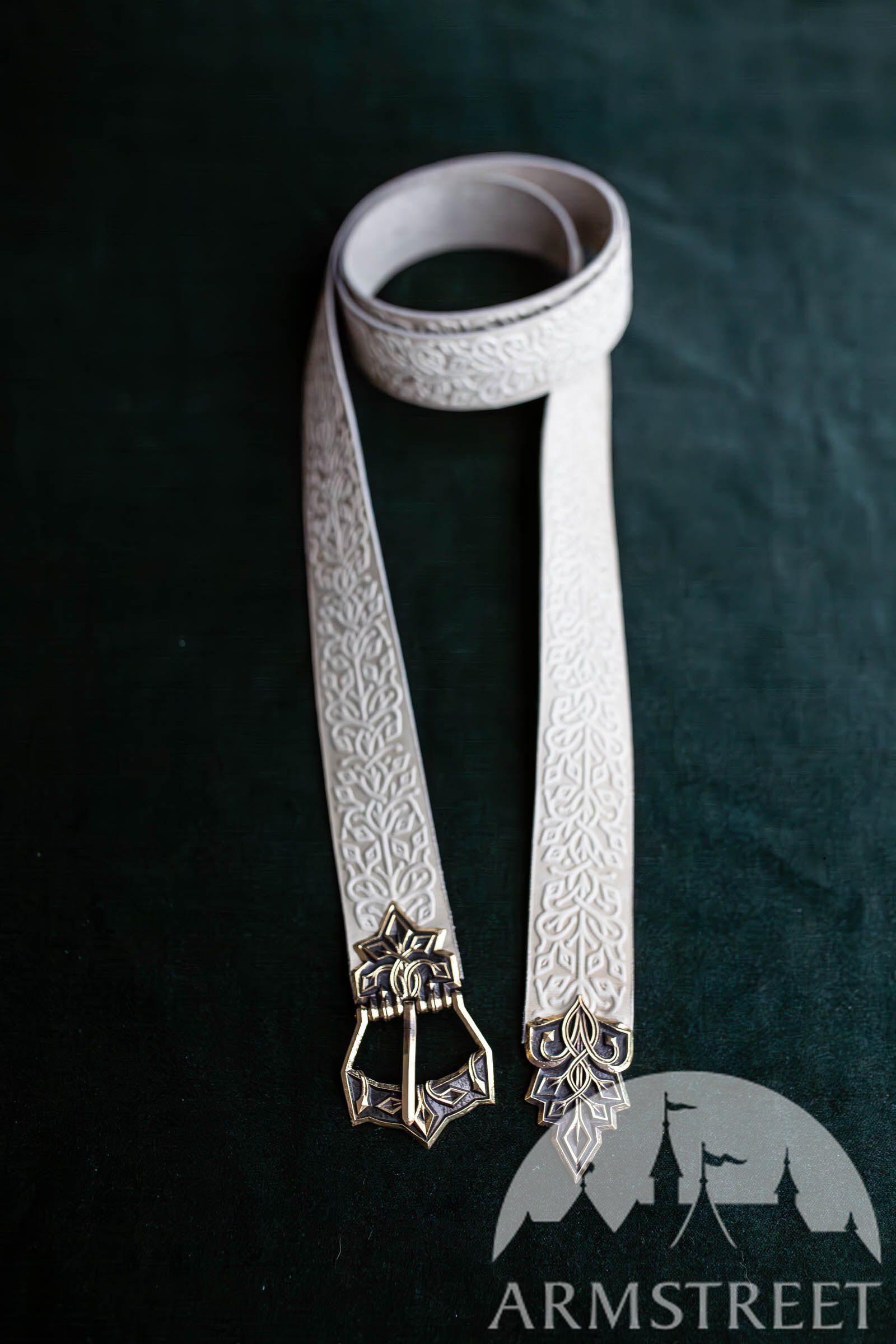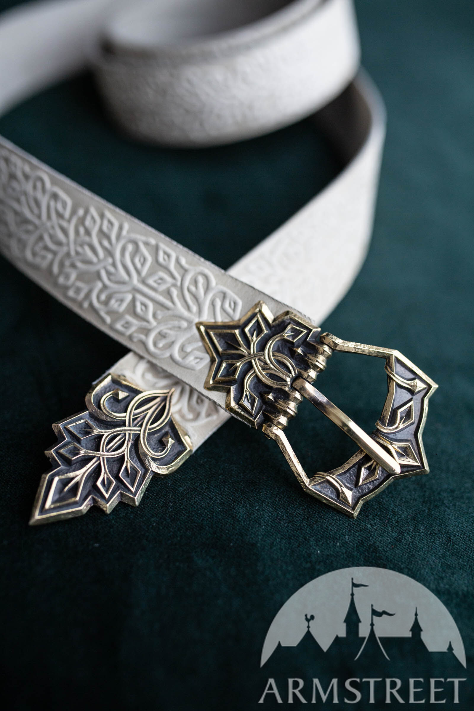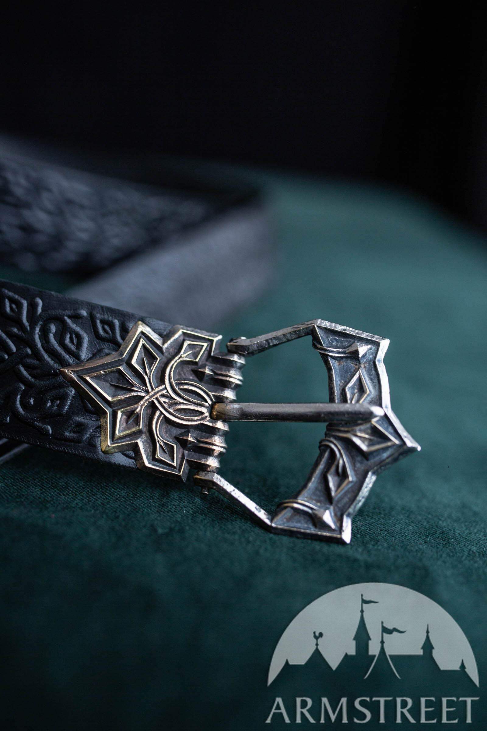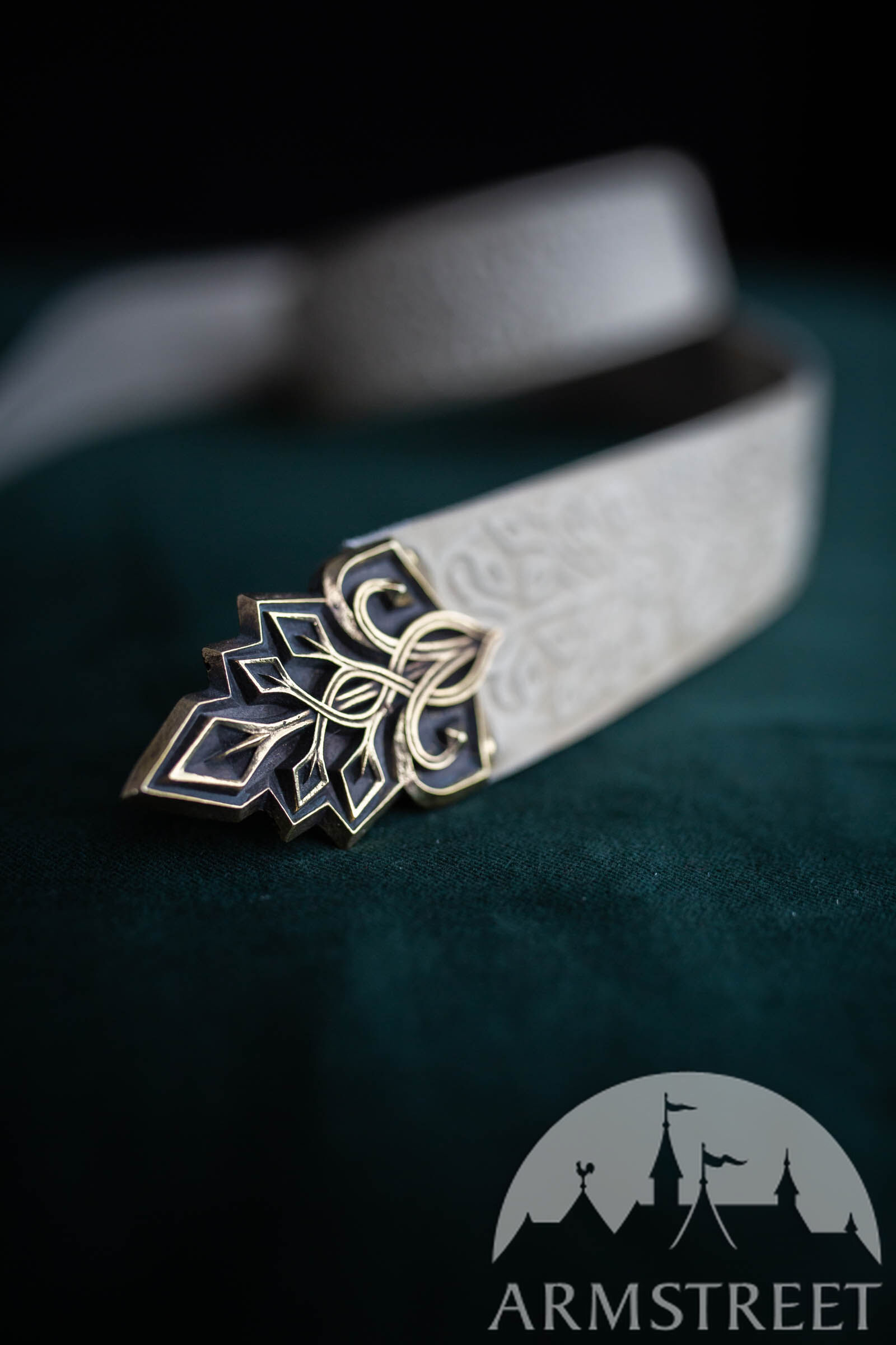 La ceinture est constituée d'une seule pièce de cuir de haute qualité, profondément embossée d'un motif en forme de vigne. Cette ceinture de longueur fixe est assez large, ce qui lui confère une réelle présence dans votre costume. Le motif a été conçu par notre équipe d'artistes, qui s'est inspiré des bordures des manuscrits médiévaux. Vous pouvez également le reconnaître grâce au même gaufrage que celui trouvé sur notre sac « Le Loup Noir ». La boucle de cette ceinture a été fabriquée en interne par ArmStreet, ainsi que l'extrémité de la ceinture. Elles ont le même motif de feuilles sur le laiton coulé pour assurer un look assorti au reste de la ceinture.