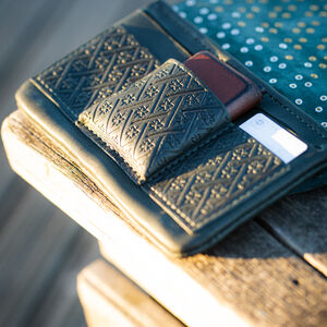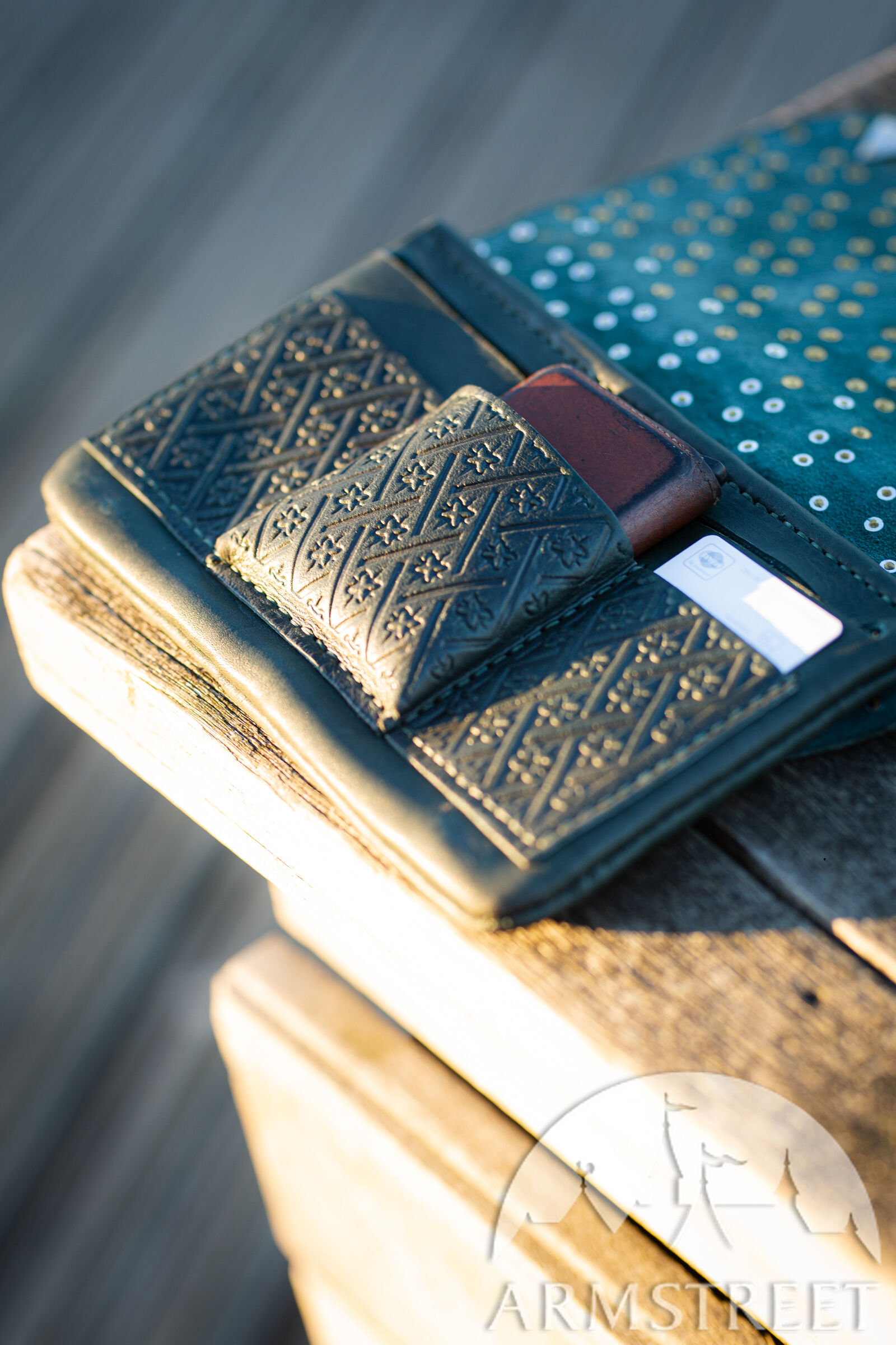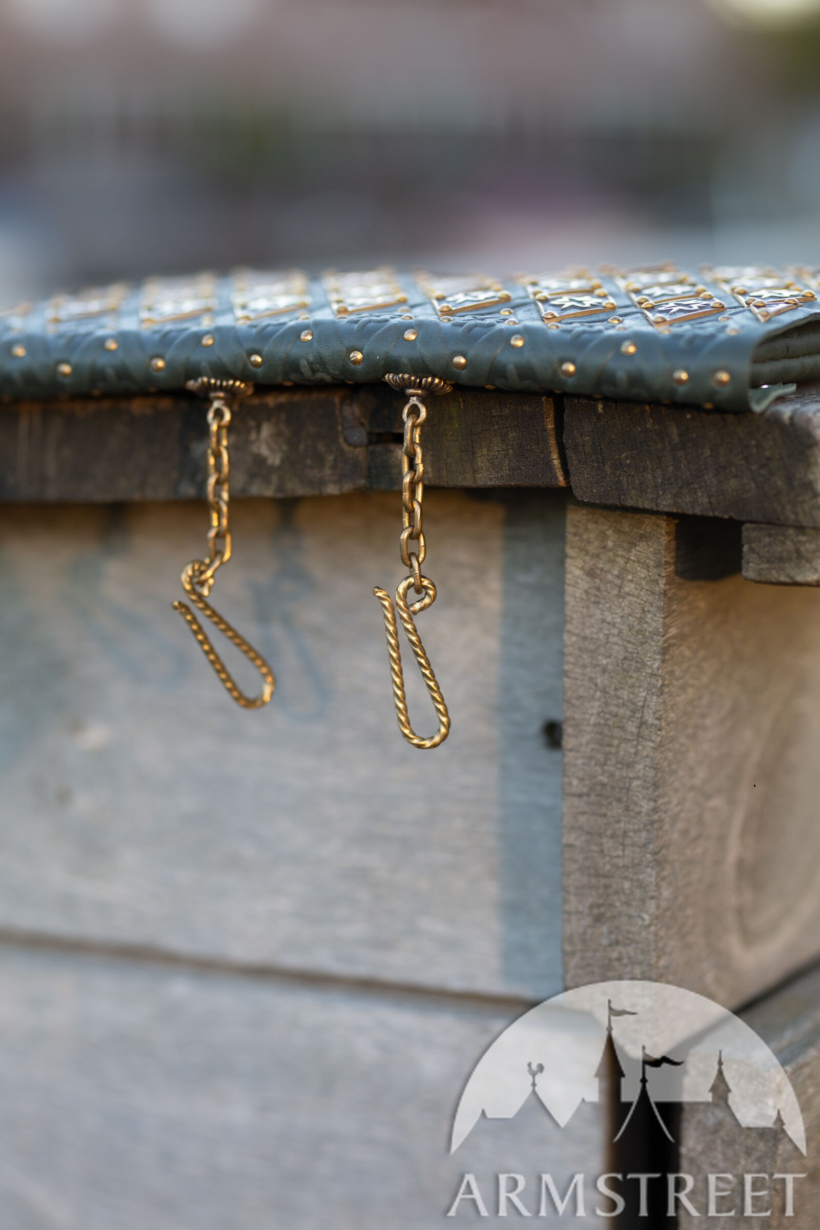 Le rabat de devant est généreusement décoré de nombreuses montures de laiton gravées de motif original. Elles sont complétées d’un dessin gaufré assorti et d’un nombre de rivets en laiton qui sont fonctionnels et en même temps très jolis ! La pochette est attachée à la ceinture à l’aide de deux jolis crochets en laiton.