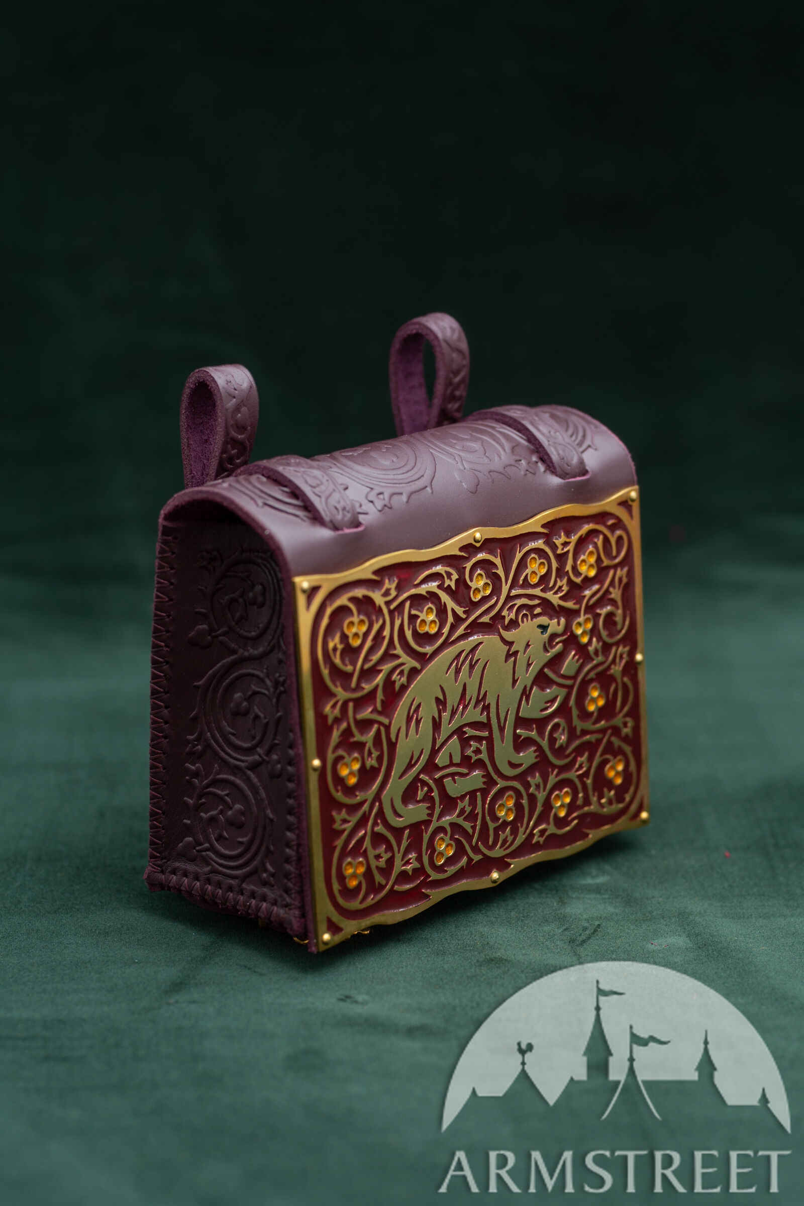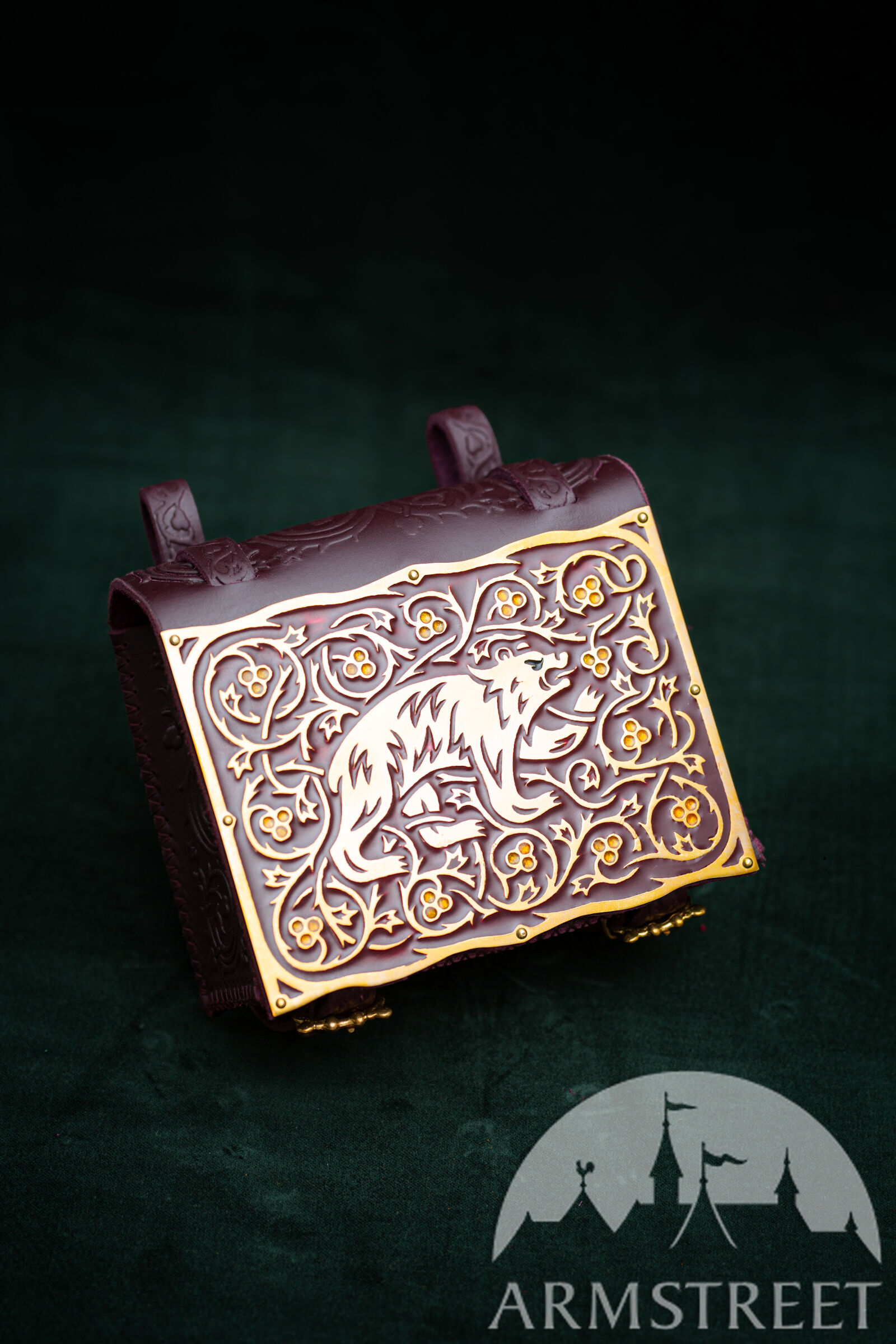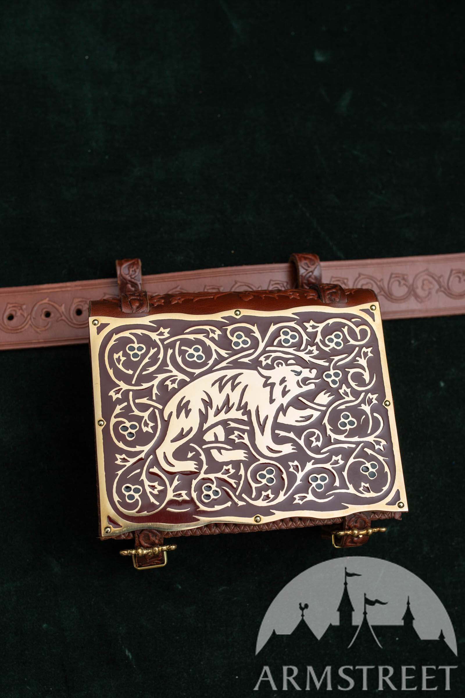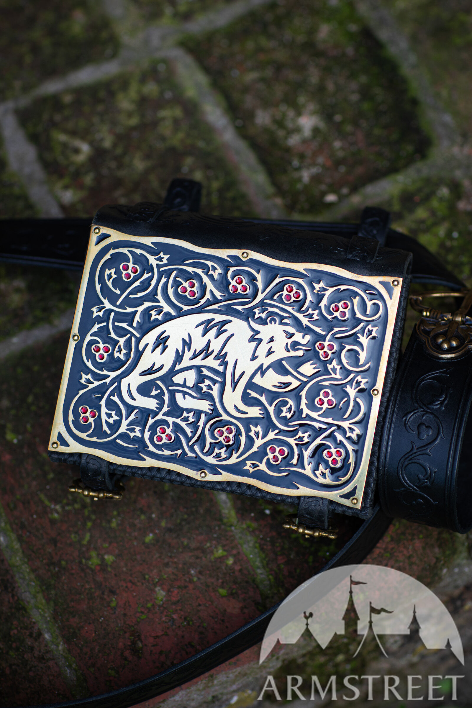 Bienvenue au nouvel accessoire ! Il est là pour apporter de la joie et un sentiment de « Enfin ! » à tous ceux qui aiment avoir des ours sur leurs vêtements ou leurs accessoires. Le voici, l'ours féroce, gravé dans le laiton et décoré d'émail. Autour de la bête, tant sur la plaque de laiton que sur le cuir lui-même, des motifs floraux sont magnifiquement disposés. Ce sac médiéval est bien plus sophistiqué et chic que la pochette moyenne et conviendra parfaitement à un personnage noble ou à un chevalier.