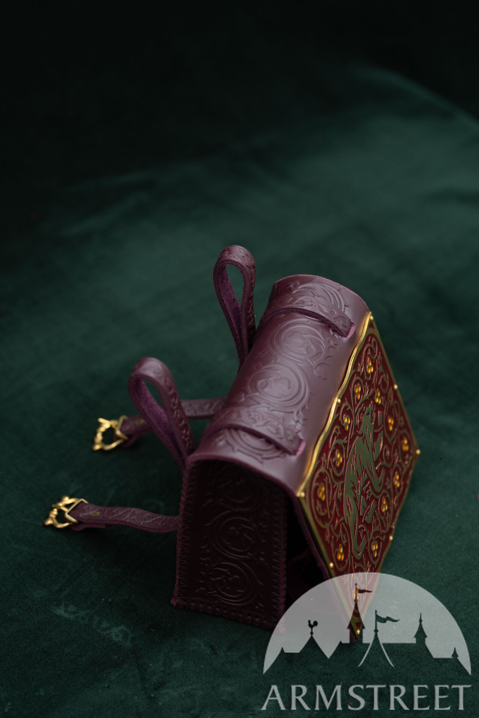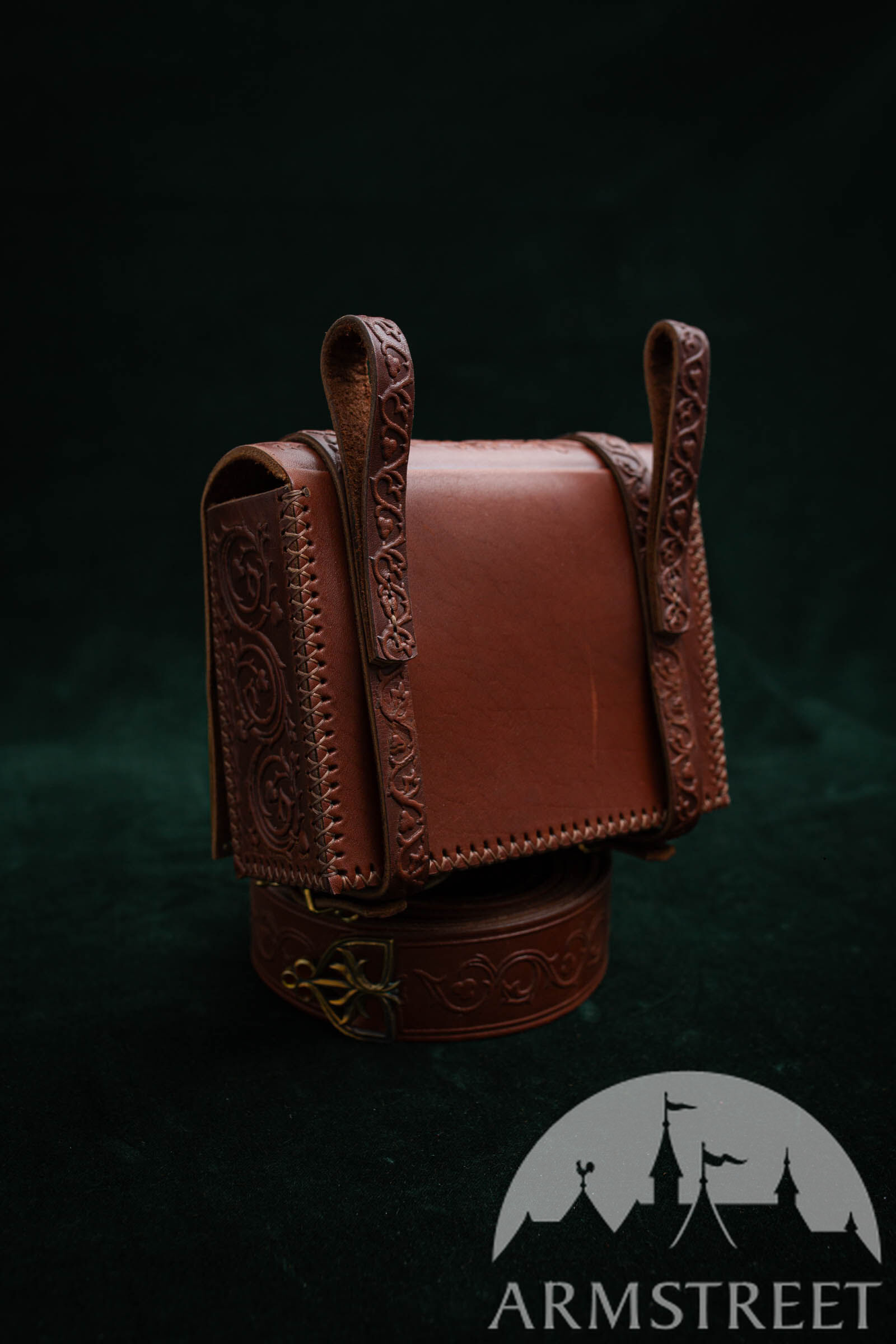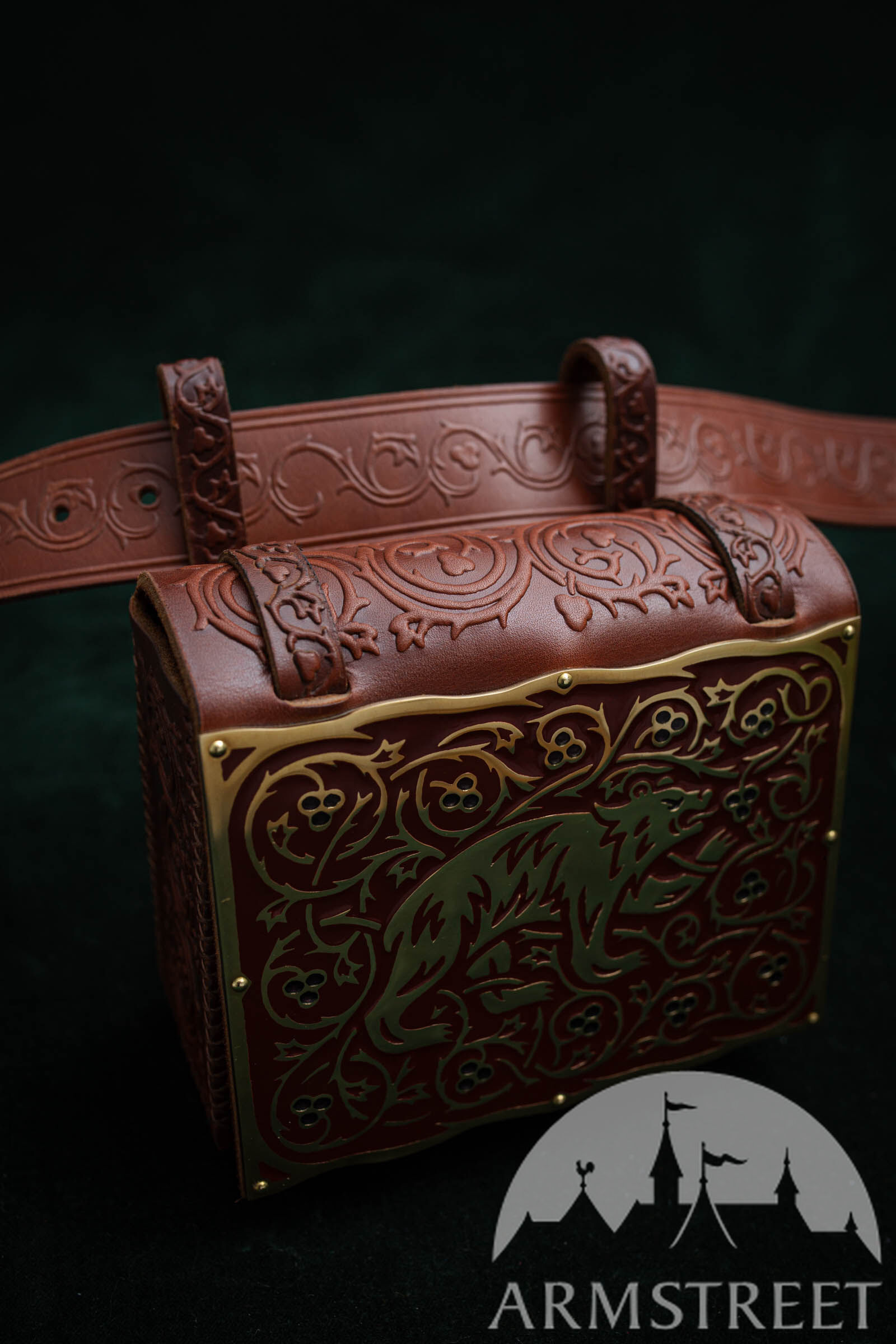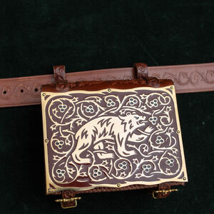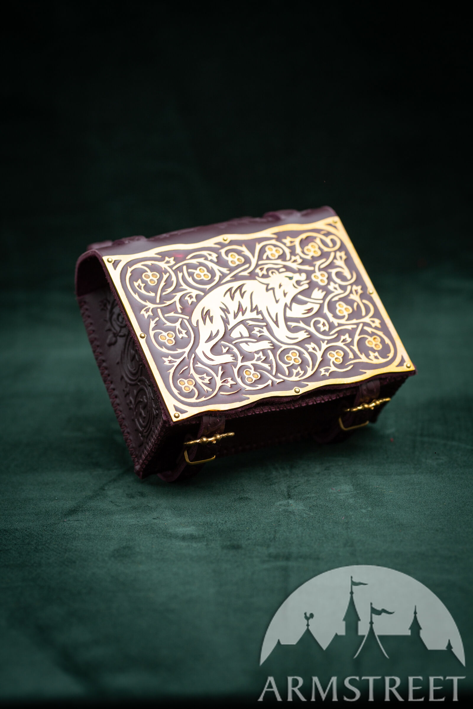 Bienvenue au nouvel accessoire ! Il est là pour apporter de la joie et un sentiment de « Enfin ! » à tous ceux qui aiment avoir des ours sur leurs vêtements ou leurs accessoires. Le voici, l'ours féroce, gravé dans le laiton et décoré d'émail. Autour de la bête, tant sur la plaque de laiton que sur le cuir lui-même, des motifs floraux sont magnifiquement disposés. Ce sac médiéval est bien plus sophistiqué et chic que la pochette moyenne et conviendra parfaitement à un personnage noble ou à un chevalier.