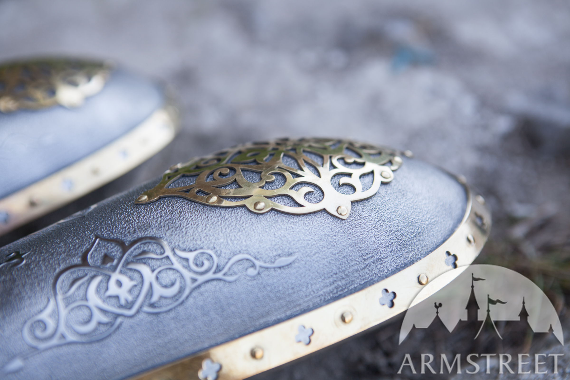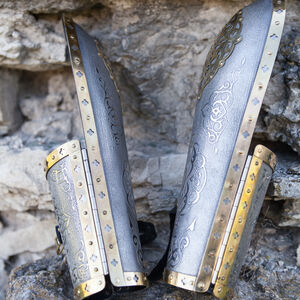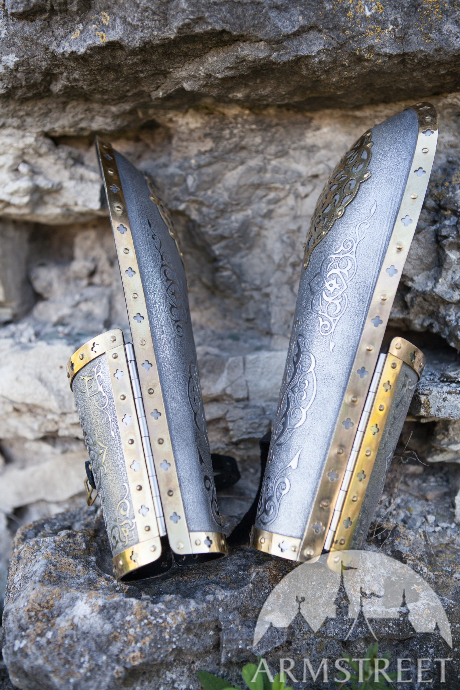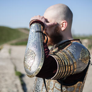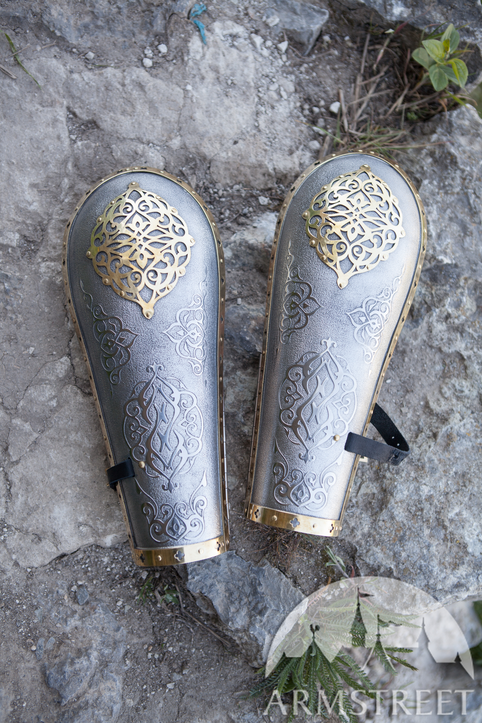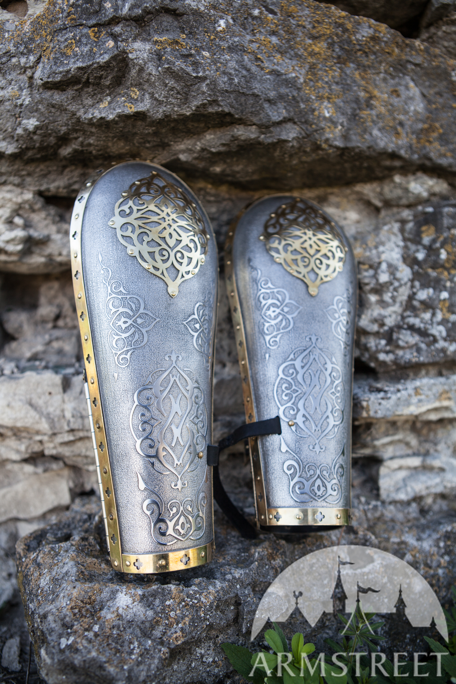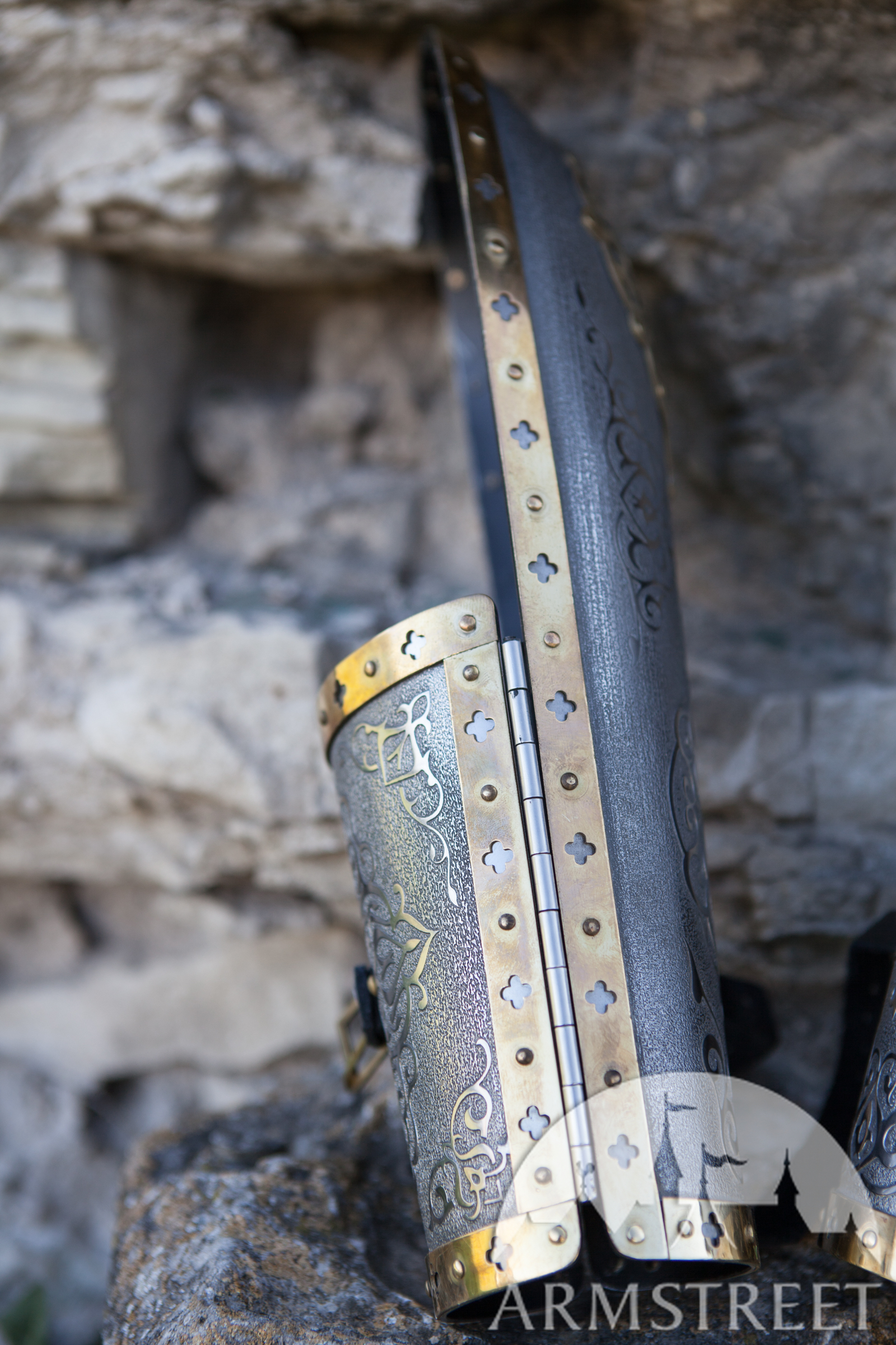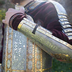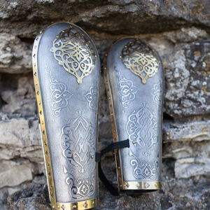 Ces brassards orientaux couvrent les coudes et sont également connus sous le nom de bazubands. Cette armure est une partie de notre ensemble « Roi de l’Est ». L’acier inoxydable de 16 ga est décoré avec un beau gravage de style oriental conçu pour cet ensemble et avec des accents en laiton repercé avec des ornements orientaux traditionnels.