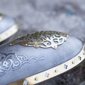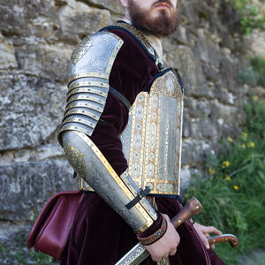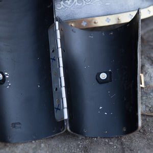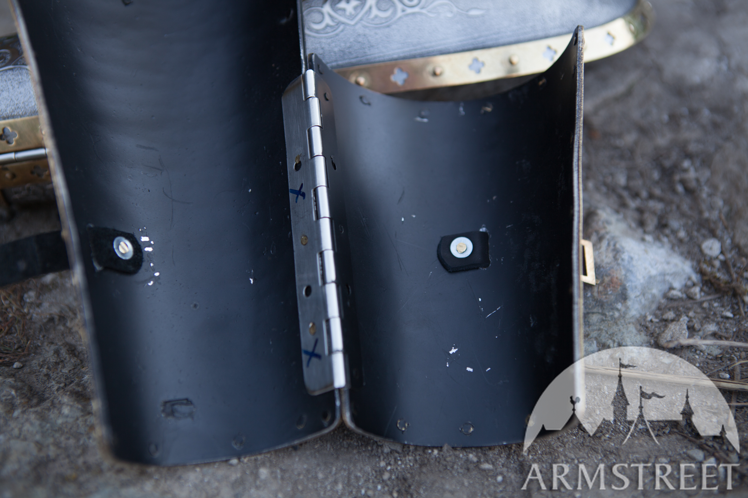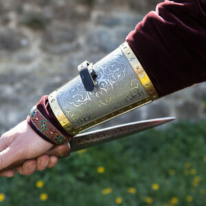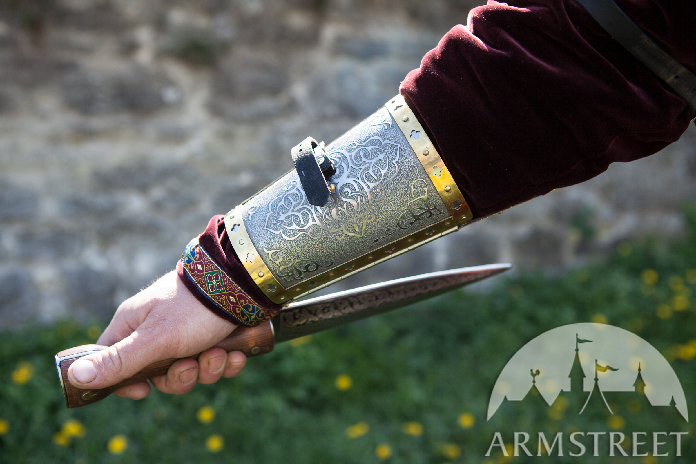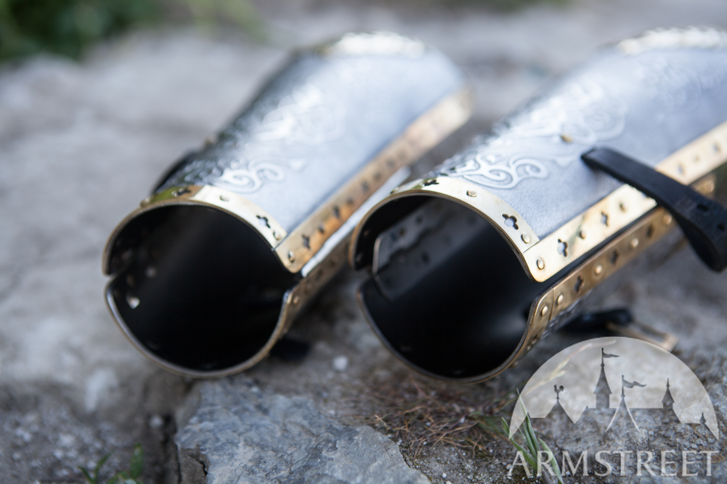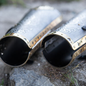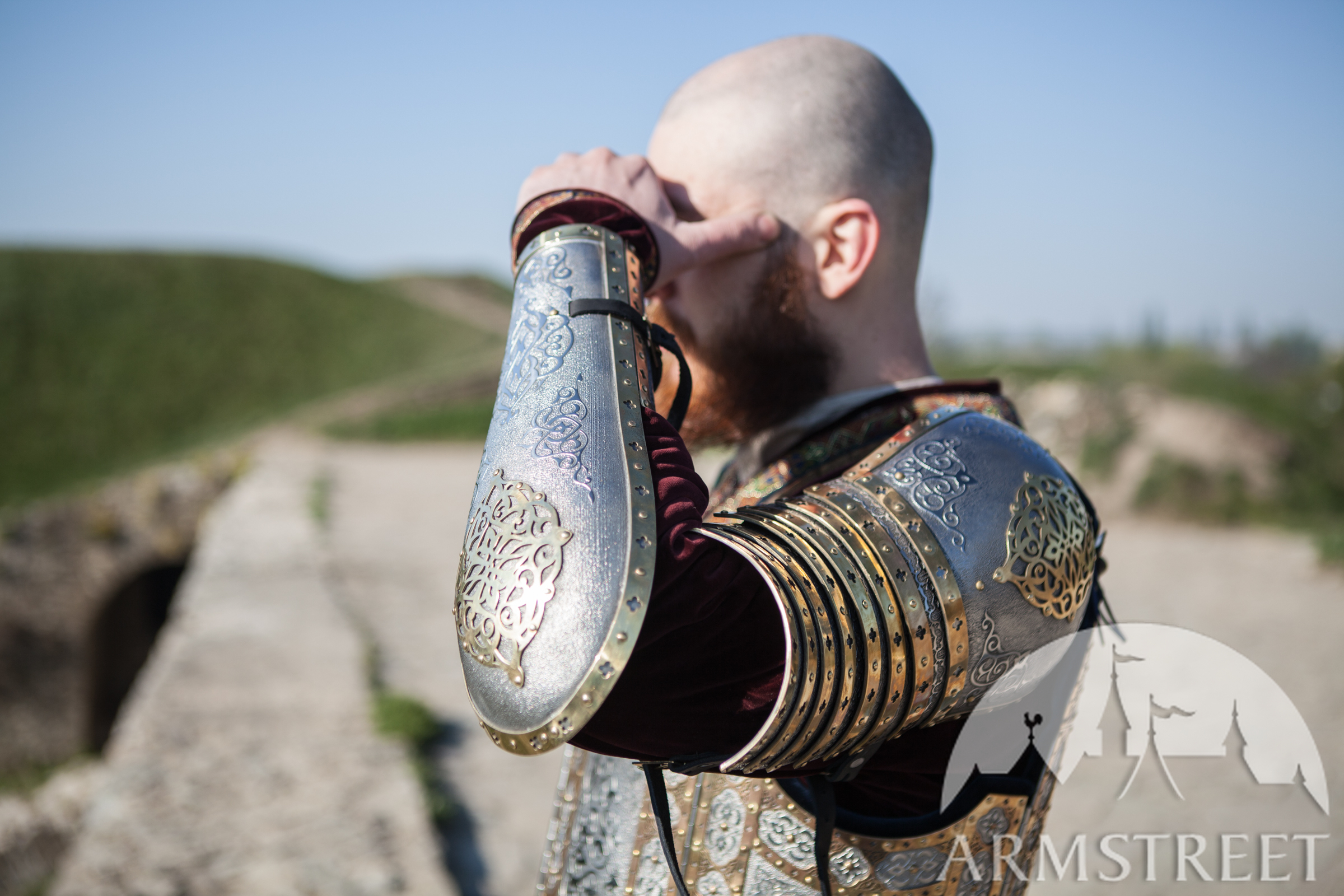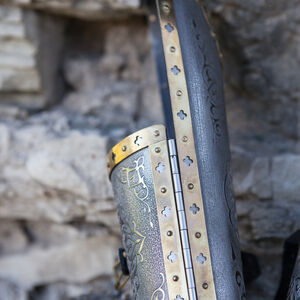 Ces brassards orientaux couvrent les coudes et sont également connus sous le nom de bazubands. Cette armure est une partie de notre ensemble « Roi de l’Est ». L’acier inoxydable de 16 ga est décoré avec un beau gravage de style oriental conçu pour cet ensemble et avec des accents en laiton repercé avec des ornements orientaux traditionnels.