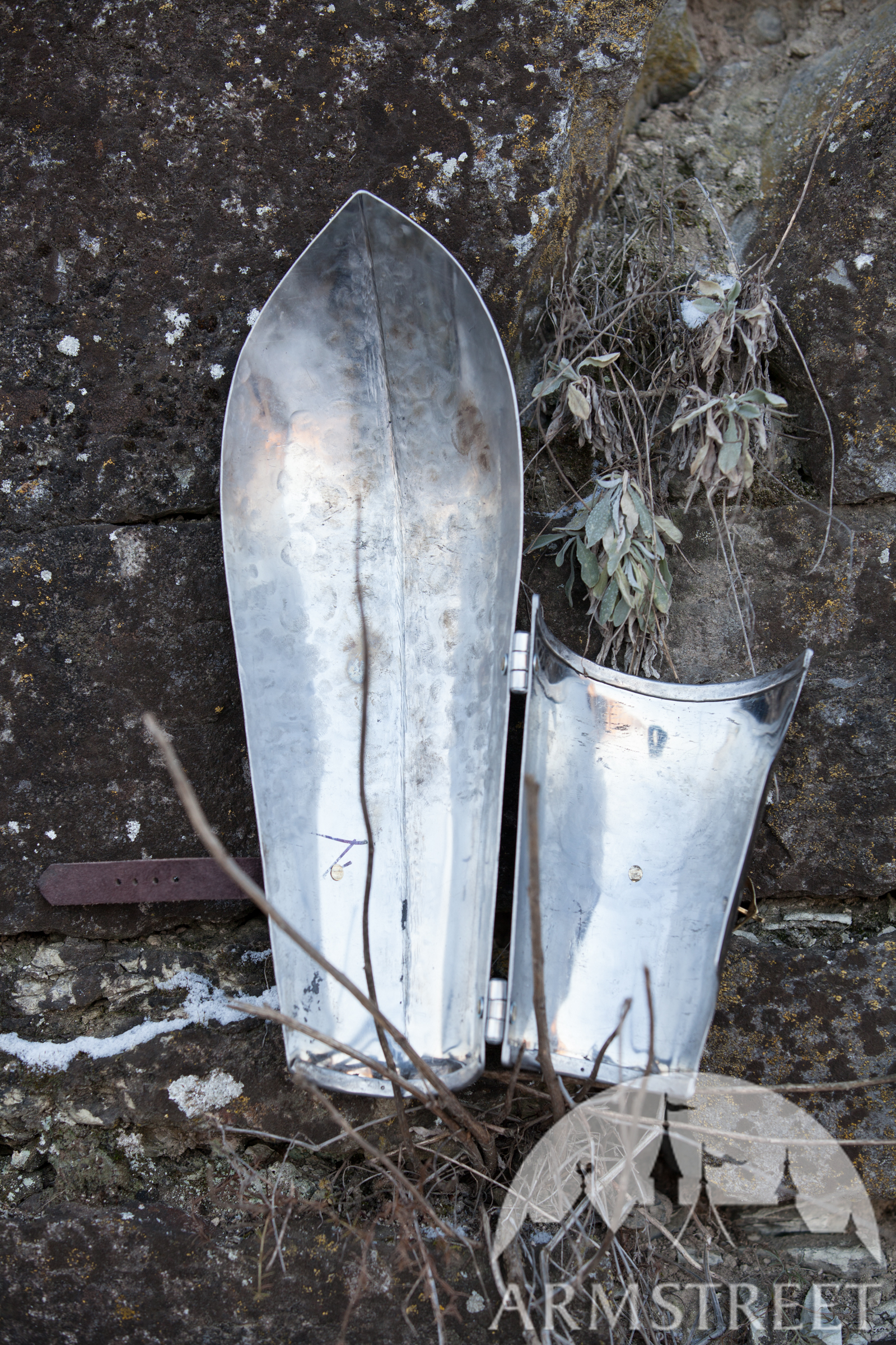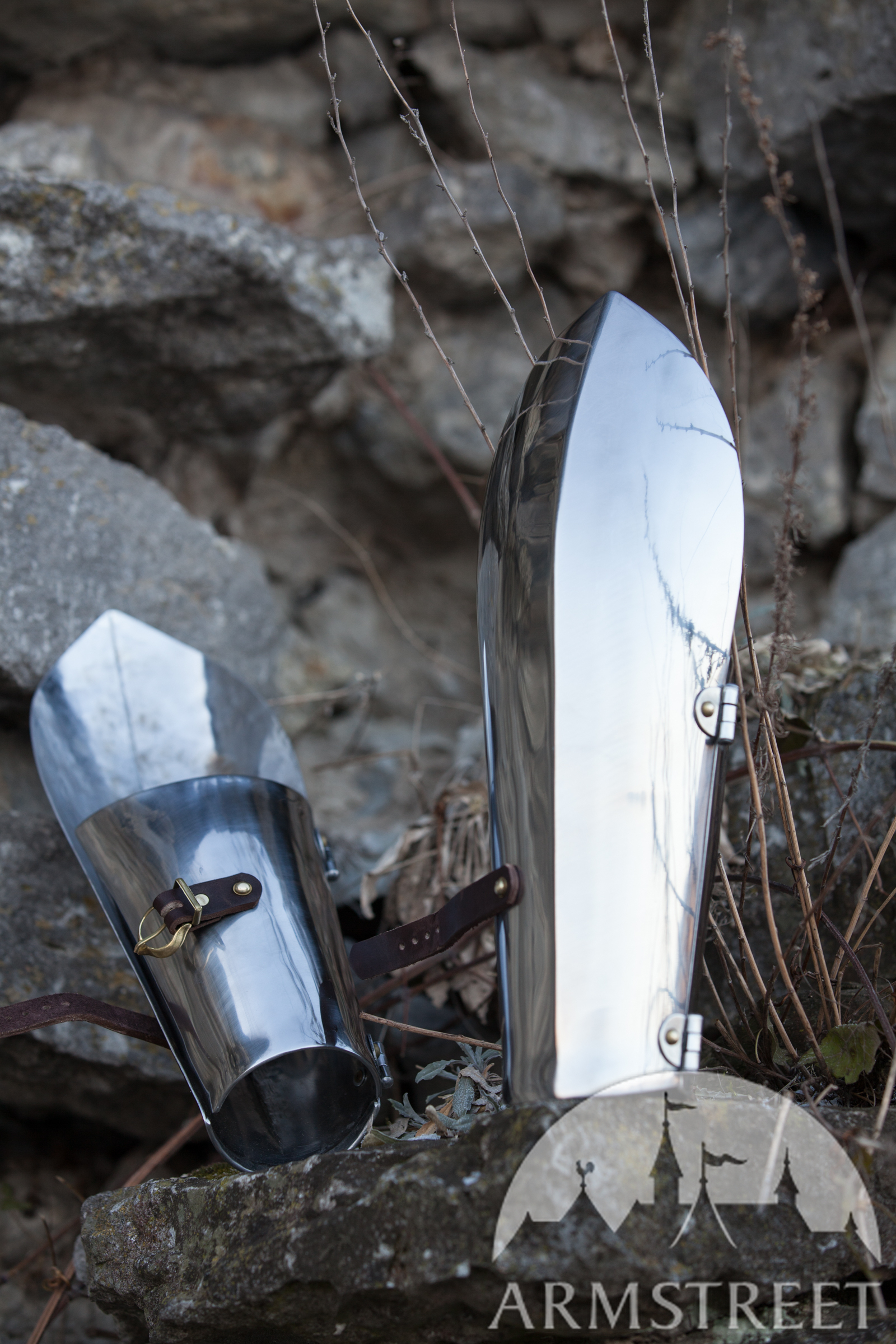 Nous affinons constamment nos modèles d'armures de base, qui doivent répondre à trois critères principaux : être fiables, confortables et accessibles. Ces canons d'avant-bras en forme de bateau répondent à toutes les exigences, car ils sont fabriqués en acier inoxydable de 1,5 mm d'épaisseur, faciles à porter avec des sangles à boucles en cuir et à un prix attractif. Leur plaque arrière allongée ferme fermement le coude, permettant de négliger les cubitières séparées. Les plaques extérieures plus longues et intérieures plus courtes sont reliées par des charnières en acier massif. Martelés à la main et soigneusement polis dans le sens de la longueur, ils présentent des bords lisses. Tous les bords des pièces étroitement adjacentes sont tournés vers l'intérieur pour éviter les rayures accidentelles.