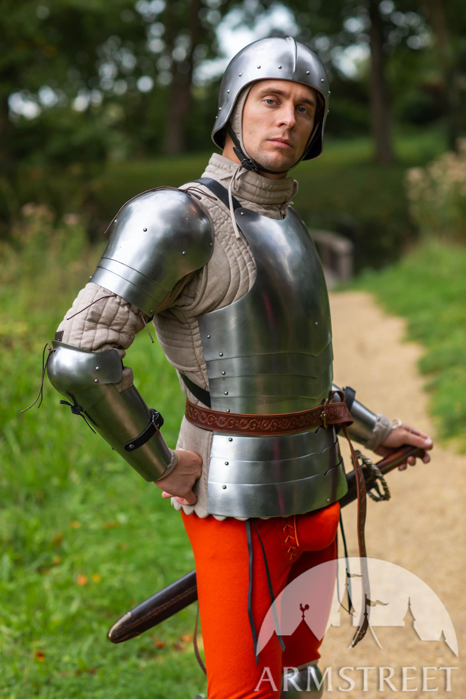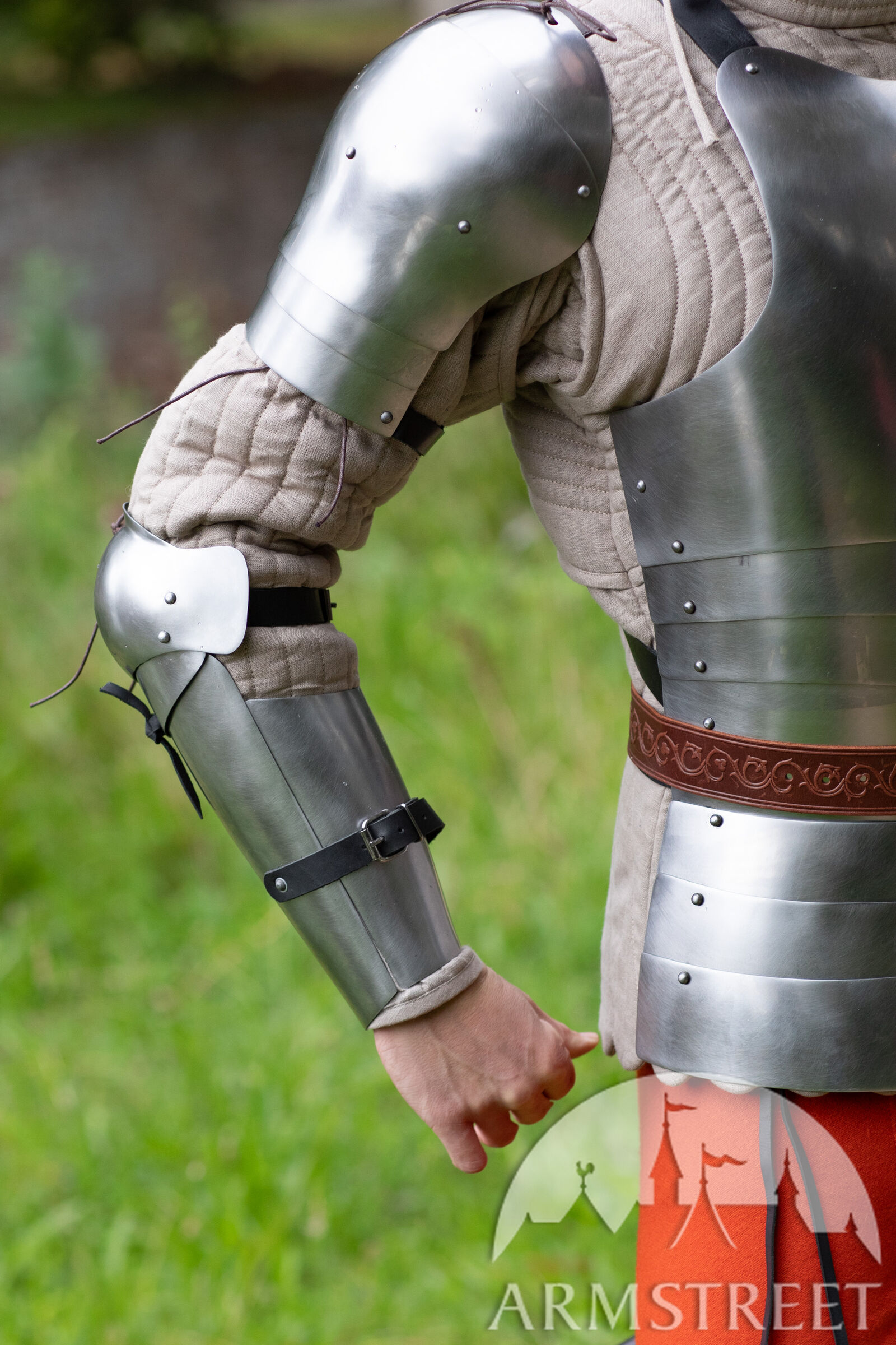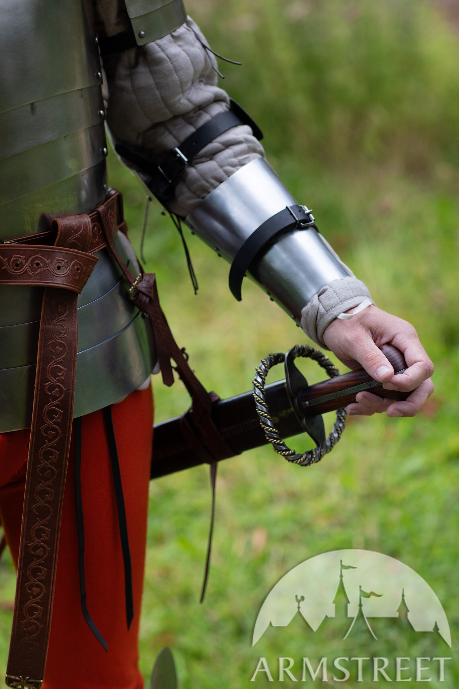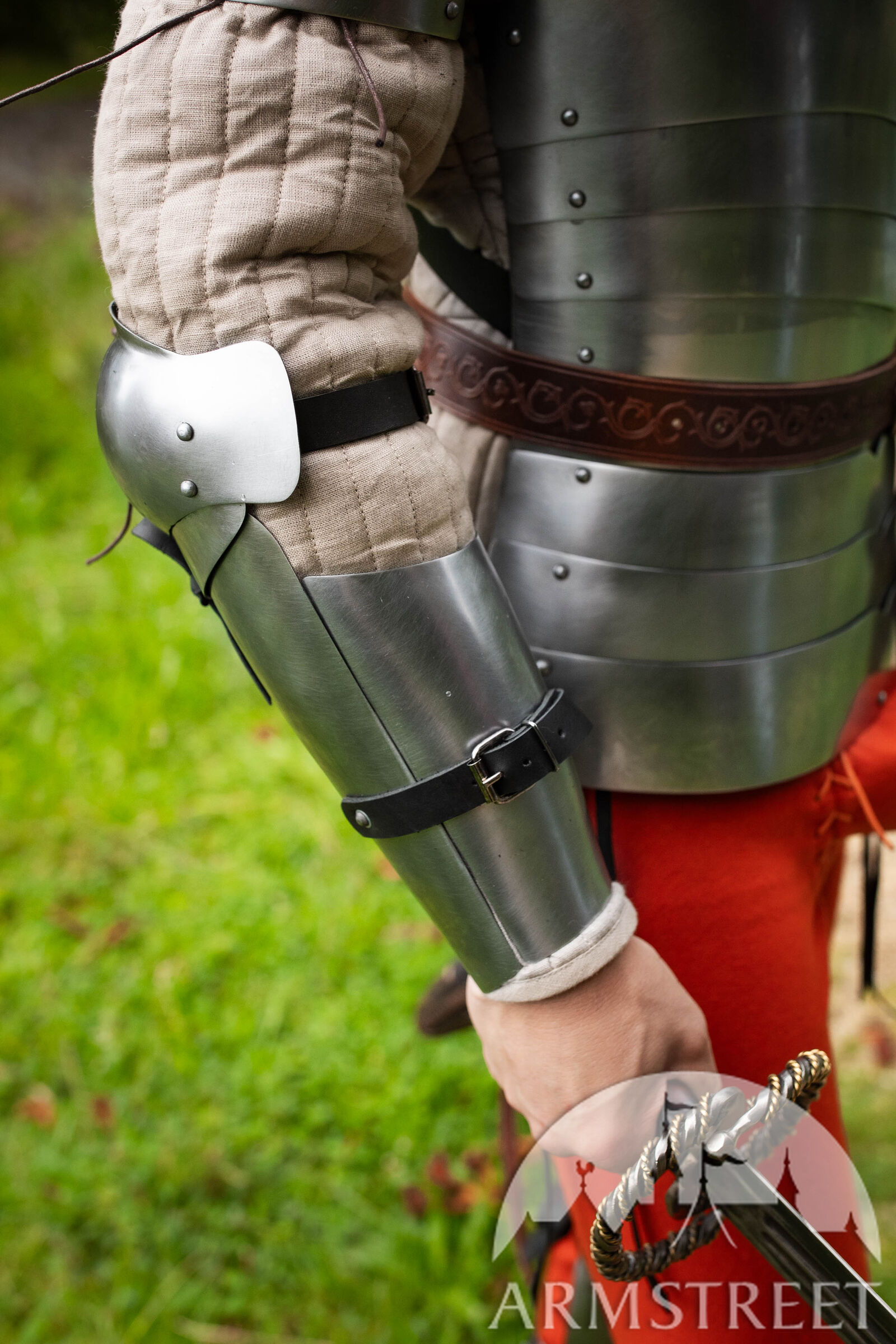 Cet ensemble, ainsi que son homologue « Mercenaire », est une armure pratique axée sur le maniement de l'épée, conçue pour créer un ensemble d'armure esthétique, fonctionnel et relativement peu coûteux. Il peut servir de base pour les armures lourdes de type SCA ou HEMA harnischfechten, ainsi que pour d'autres applications WMA. Ces armes constituent donc l'option simple et parfaitement fonctionnelle que nous proposons pour l'ensemble d'armure occidentale. Les protège-bras de base avec coudières lacées représentent une solution éprouvée depuis des siècles.