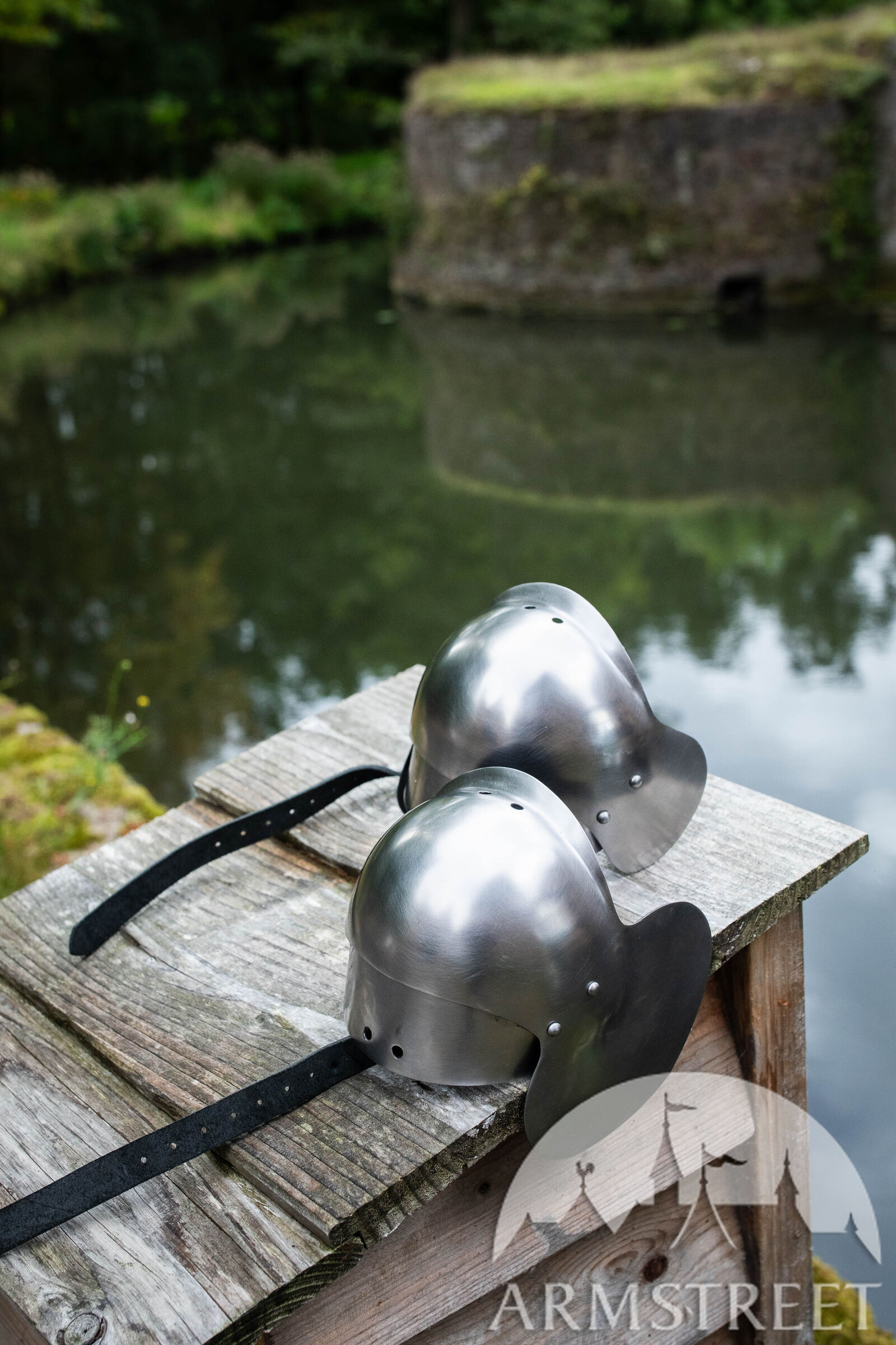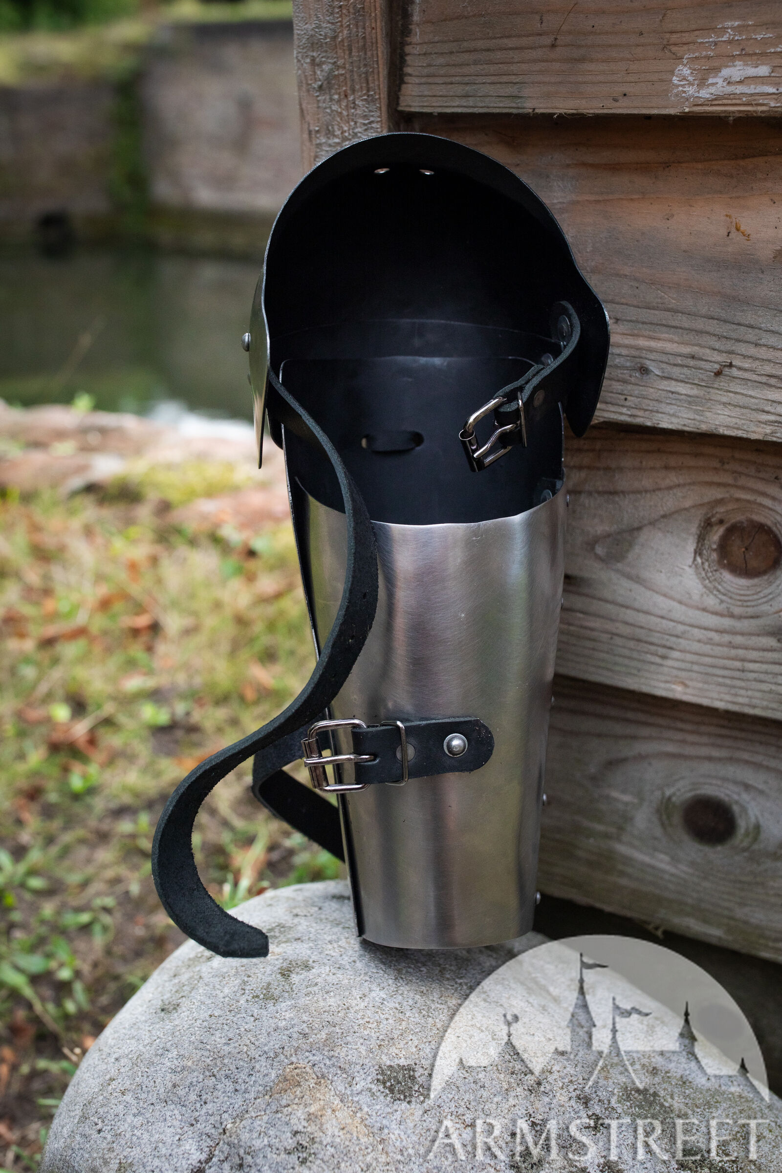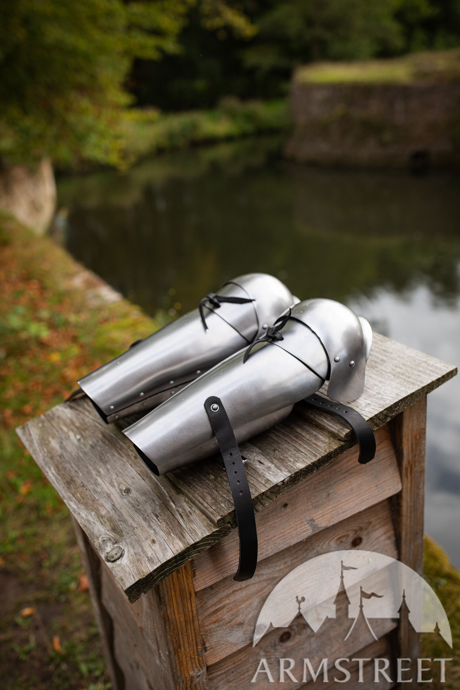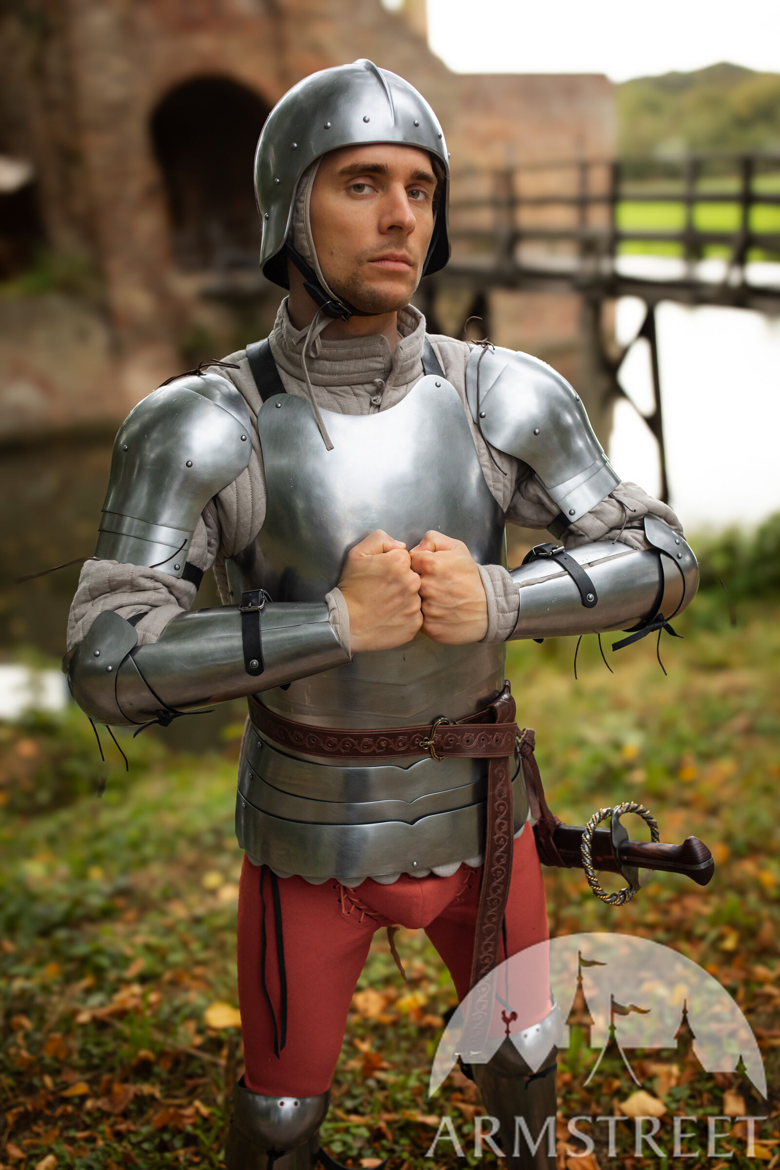 Cet ensemble, ainsi que son homologue « Mercenaire », est une armure pratique axée sur le maniement de l'épée, conçue pour créer un ensemble d'armure esthétique, fonctionnel et relativement peu coûteux. Il peut servir de base pour les armures lourdes de type SCA ou HEMA harnischfechten, ainsi que pour d'autres applications WMA. Ces armes constituent donc l'option simple et parfaitement fonctionnelle que nous proposons pour l'ensemble d'armure occidentale. Les protège-bras de base avec coudières lacées représentent une solution éprouvée depuis des siècles.