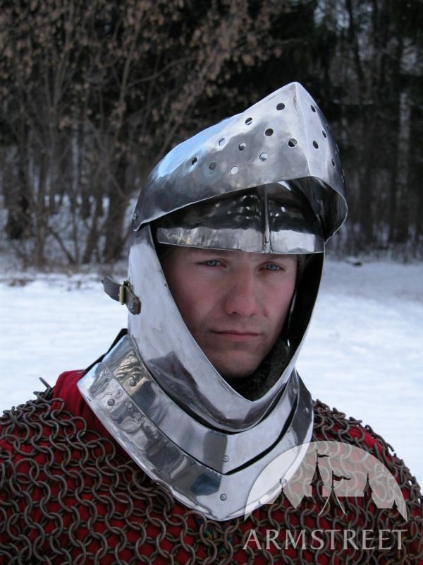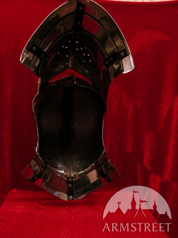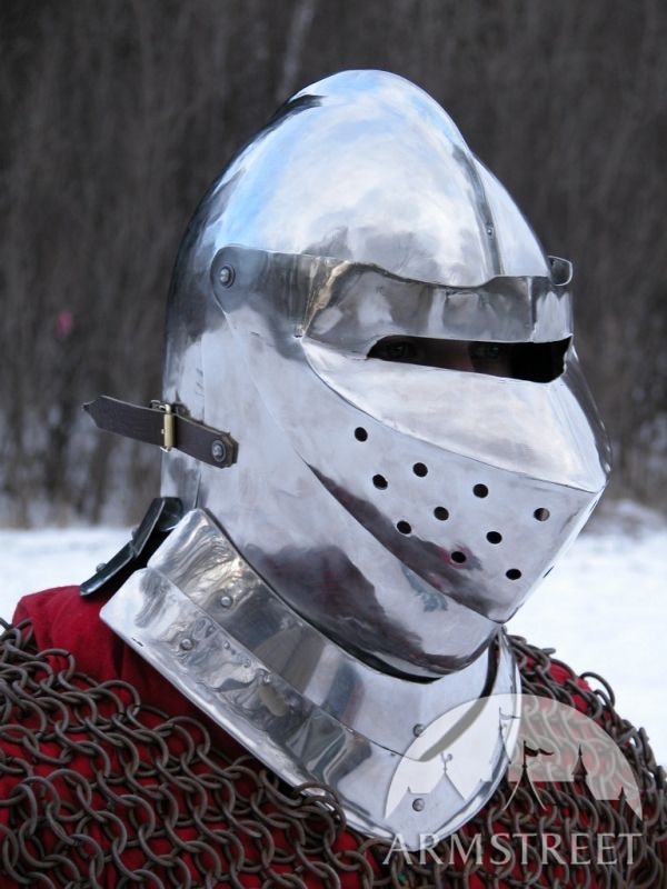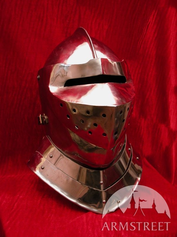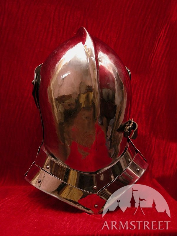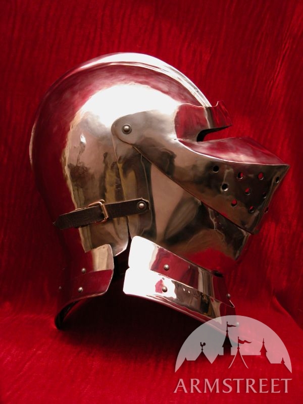 Armet est l'un des casques mieux du point de vue artisanal. Ce casque est en acier laminées à froid de 1,58 (jauge 16), conformément à la conception médiévale. La version en jauge 14 peut être commandé sur demande. La visière petite et la face sont à la fois flexible. Le casque est entièrement fait main. Une image vaut 1000 mots, si juste les regarder.