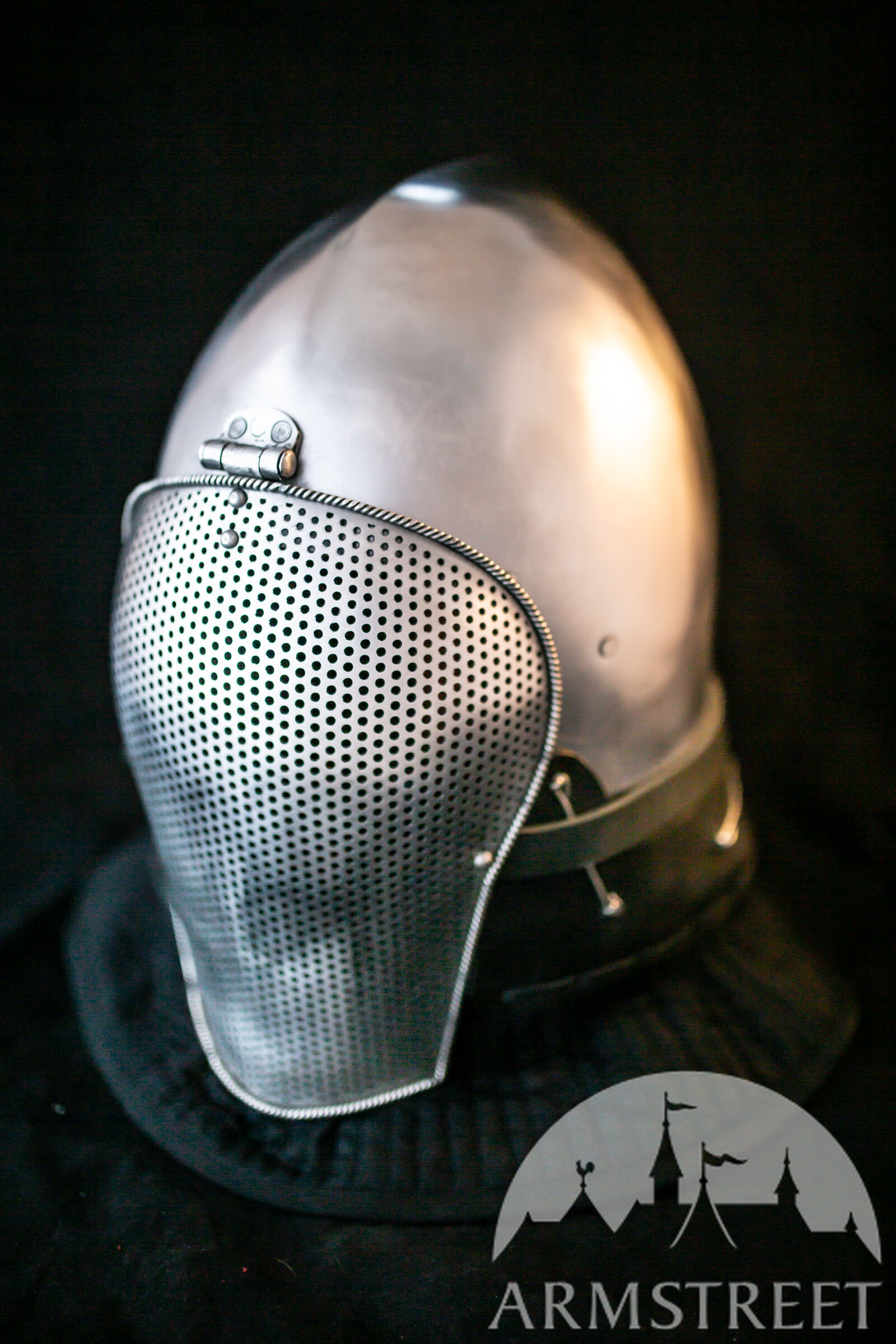 Les casques ont été parmi les premiers articles qu’ArmStreet a mis sur le marché il y a plus de 20 ans. Il nous a fallu un certain temps pour ajouter des bassinets à notre gamme, mais depuis, ce type de casque occupe fermement la niche la plus vendue. Nous avons fabriqué des bassinets traditionnels qui sont proches de l’exactitude historique, des versions sophistiquées découpées au laser, des éditions spéciales pour les combats intenses, etc. Et maintenant, le moment est venu de remplir le segment WMA avec une série en acier trempé léger mais fiable. Vous pouvez facilement reconnaître ici le bassinet italien à face longue, mais sa visière est perforée pour une meilleure visibilité et respirabilité, deux éléments qui ne peuvent être sous-estimés du point de vue de l’escrime historique. Ce casque particulier a un avantage supplémentaire : de beaux détails entrelacés qui ornent tout le bord de la visière.