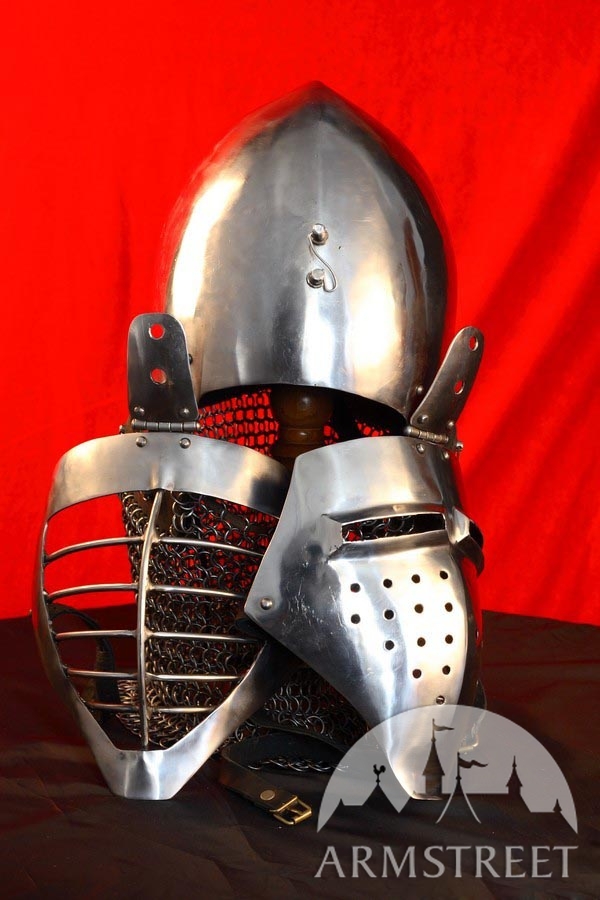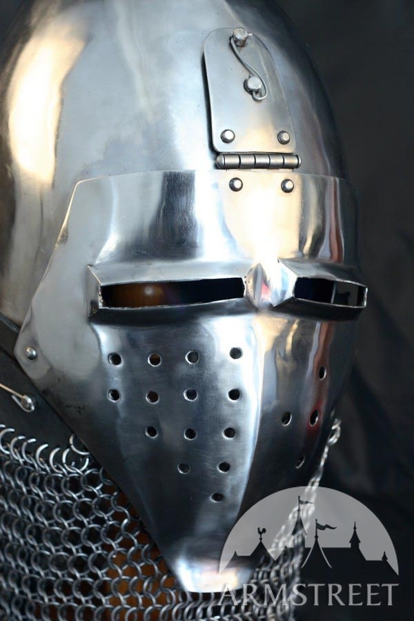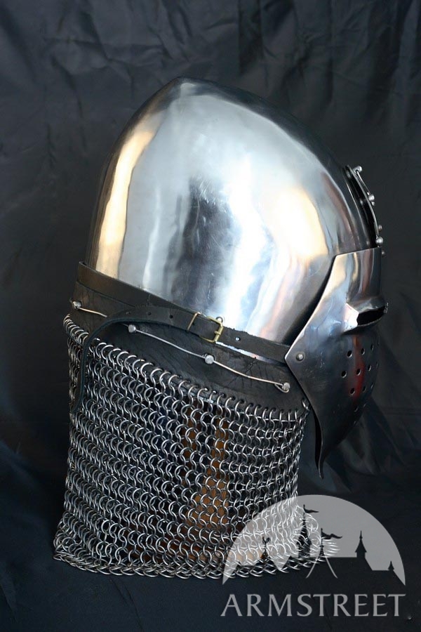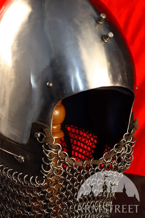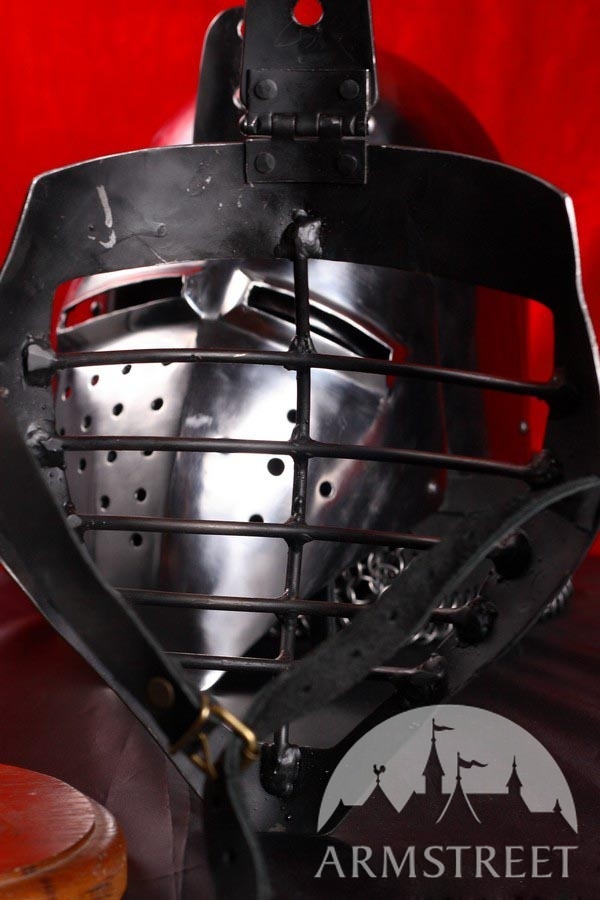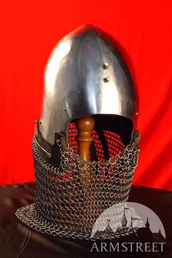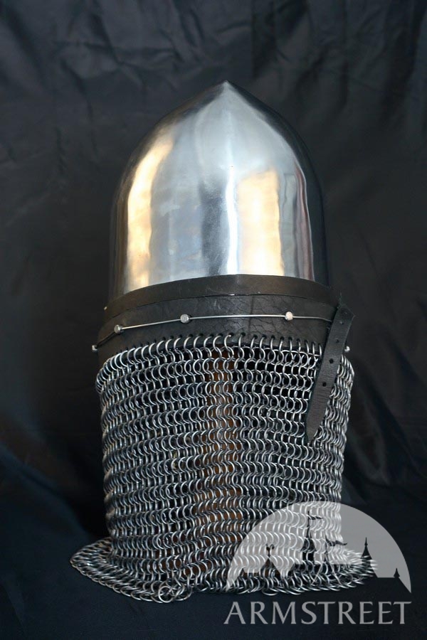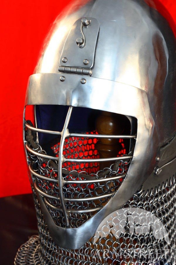 C’est un bon casque d’armure. Sa conception est basée sur le casque klappvisor bassinet médiéval classique et est réalisée dans acier jauge 14. Le casque est martelé à la main en acier de 2 mm (jauge 14) laminé à froid. C'est superbe, entièrement fait main et poli à la main ! Armure de combat excellente. Doublure de style authentique inclus comme illustré ainsi que de camail de mailles. Visière treillissée n'est pas incluse, mais est disponible sur la demande.