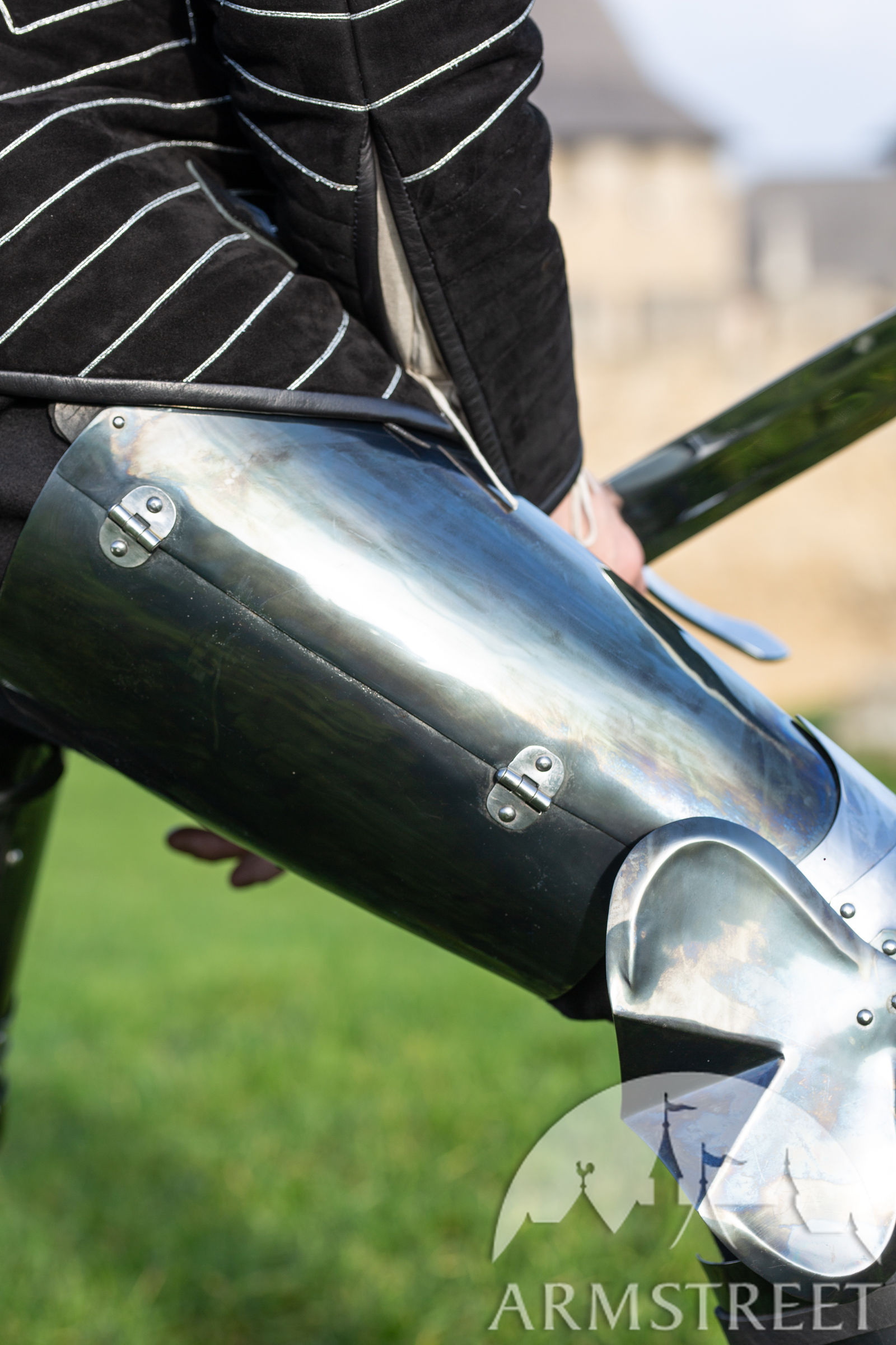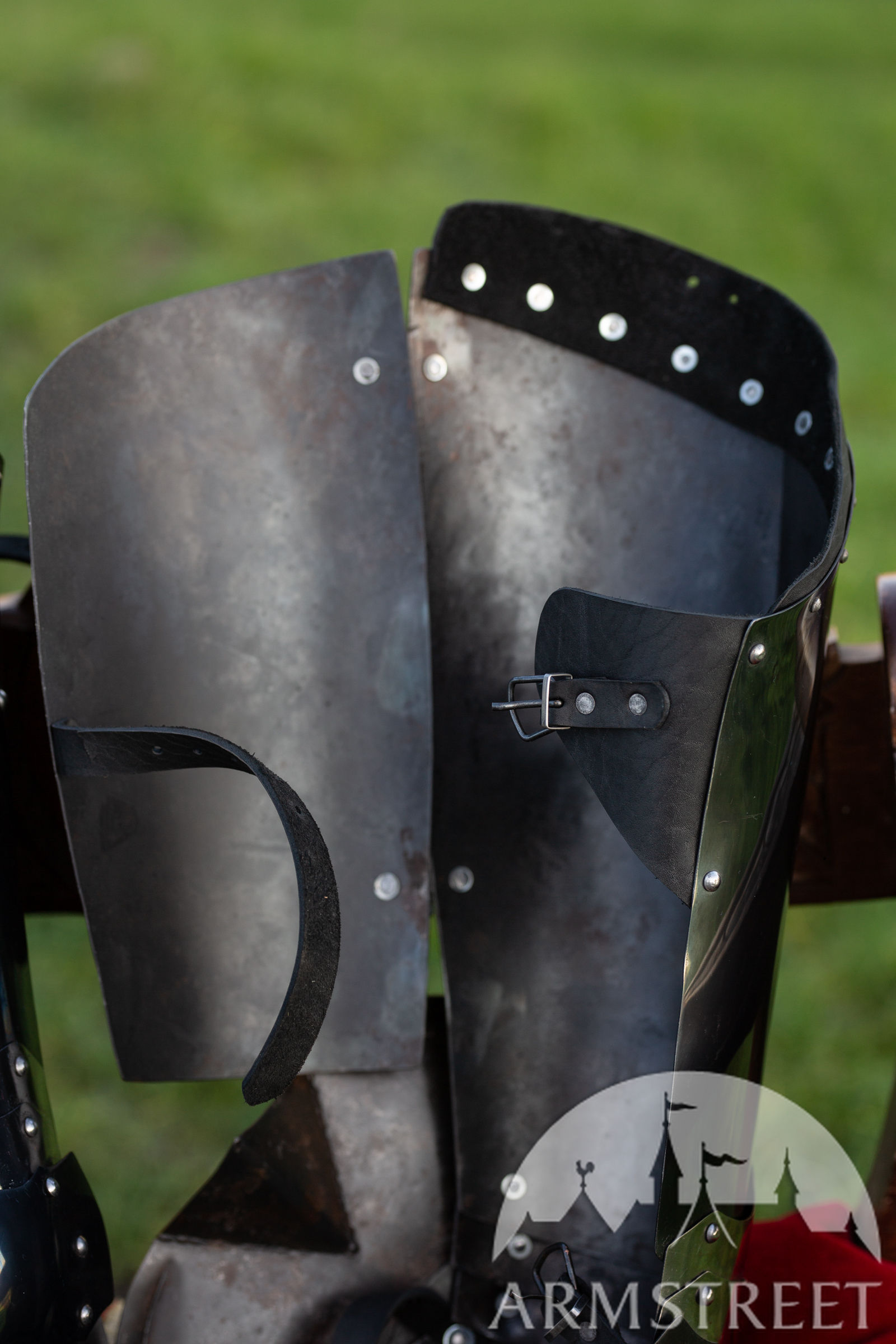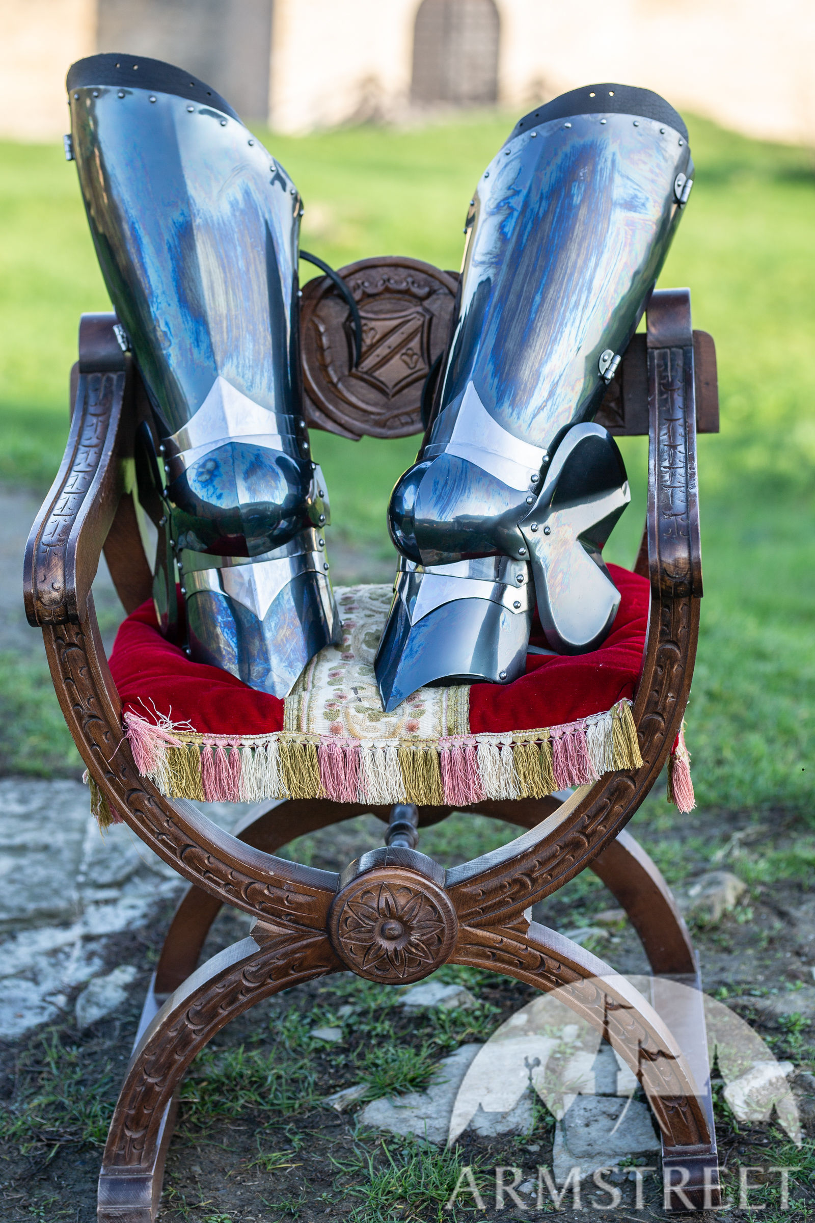 Ces jambières assurent une protection de vos cuisses et genoux, elles peuvent être attachées au gambison ou une ceinture d’armement par les trous de laçage dans la bande de cuir tout en haut des cuissots. La zone des cuisses est protégée par la première plaque solide avec une charnière à laquelle s’attache une plaque arrière qui couvre trois quarts de la jambe et protège bien la zone arrière. La cubitière est très solide, elle a une jolie crête au milieu et les ailes de grande taille. Les plaques de forme pointue assurent une bonne articulation en dessous et en dessus des cubitières. Les sangles et les boucles au niveau des cuisses, des genoux et des mollets permettent d’attacher l’armure de manière parfaitement ajustée.