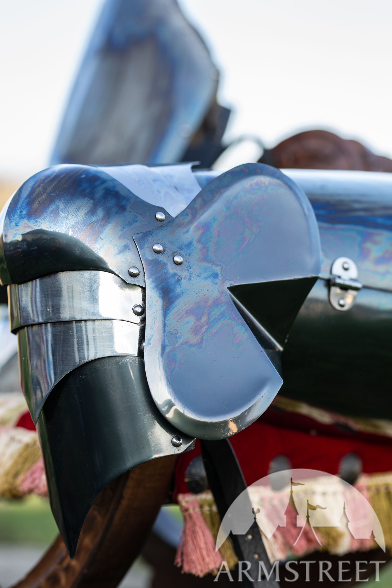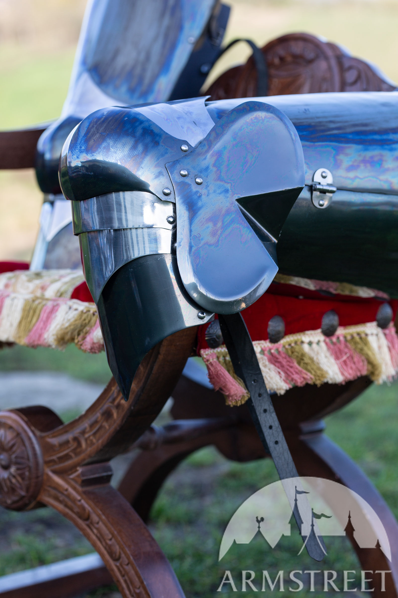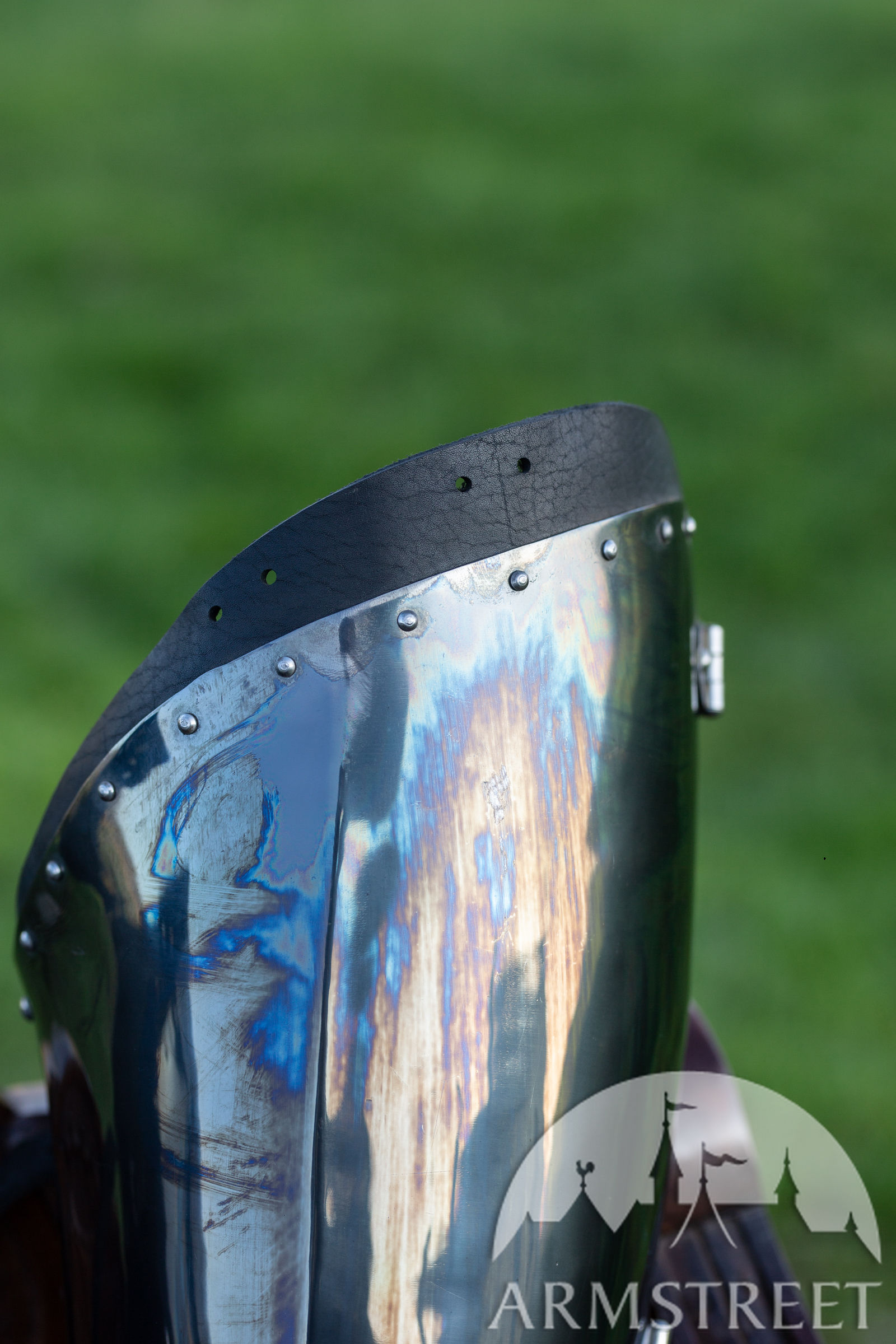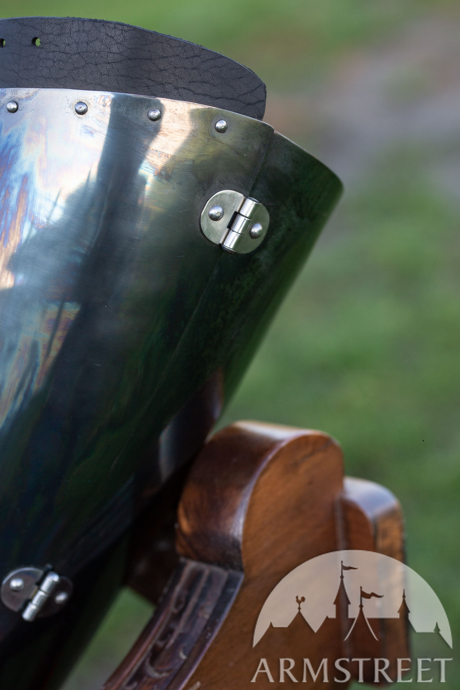 Ces jambières assurent une protection de vos cuisses et genoux, elles peuvent être attachées au gambison ou une ceinture d’armement par les trous de laçage dans la bande de cuir tout en haut des cuissots. La zone des cuisses est protégée par la première plaque solide avec une charnière à laquelle s’attache une plaque arrière qui couvre trois quarts de la jambe et protège bien la zone arrière. La cubitière est très solide, elle a une jolie crête au milieu et les ailes de grande taille. Les plaques de forme pointue assurent une bonne articulation en dessous et en dessus des cubitières. Les sangles et les boucles au niveau des cuisses, des genoux et des mollets permettent d’attacher l’armure de manière parfaitement ajustée.