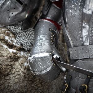 Les cnémides de plaques se composent de trois pièces et assurent une protection complète du tibia et presque une protection complète du mollet. Grâce à l’articulation sur du cuir les grèves assurent une protection inégalée de la partie inférieure des jambes.