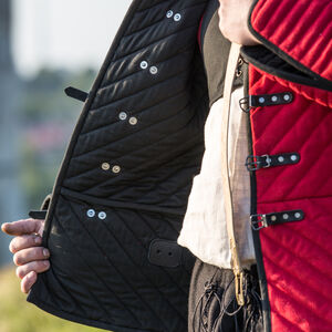 On a créé ce gambison après plusieurs essais des matériaux et de nombreuses mises à niveau. Le gambison est totalement fonctionnel – le rembourrage sera le sous-armure idéal pour béhourd ou tout type de combat lourd. En même temps c’est confortable, respirable, et peut être utilisé dans de nombreuses situations différentes. C’est pourquoi on a décidé de l’offrir en deux pièces ! L'élément du bas est une pièce style haut court, qu’on lace près du corps. Il offre une excellente protection des bras et des épaules. Les manches sont larges au niveau des avant-bras – et se resserrent au niveau des poignets. Il n’a pas de boutons ce qui est certainement mieux sur le plan du confort.