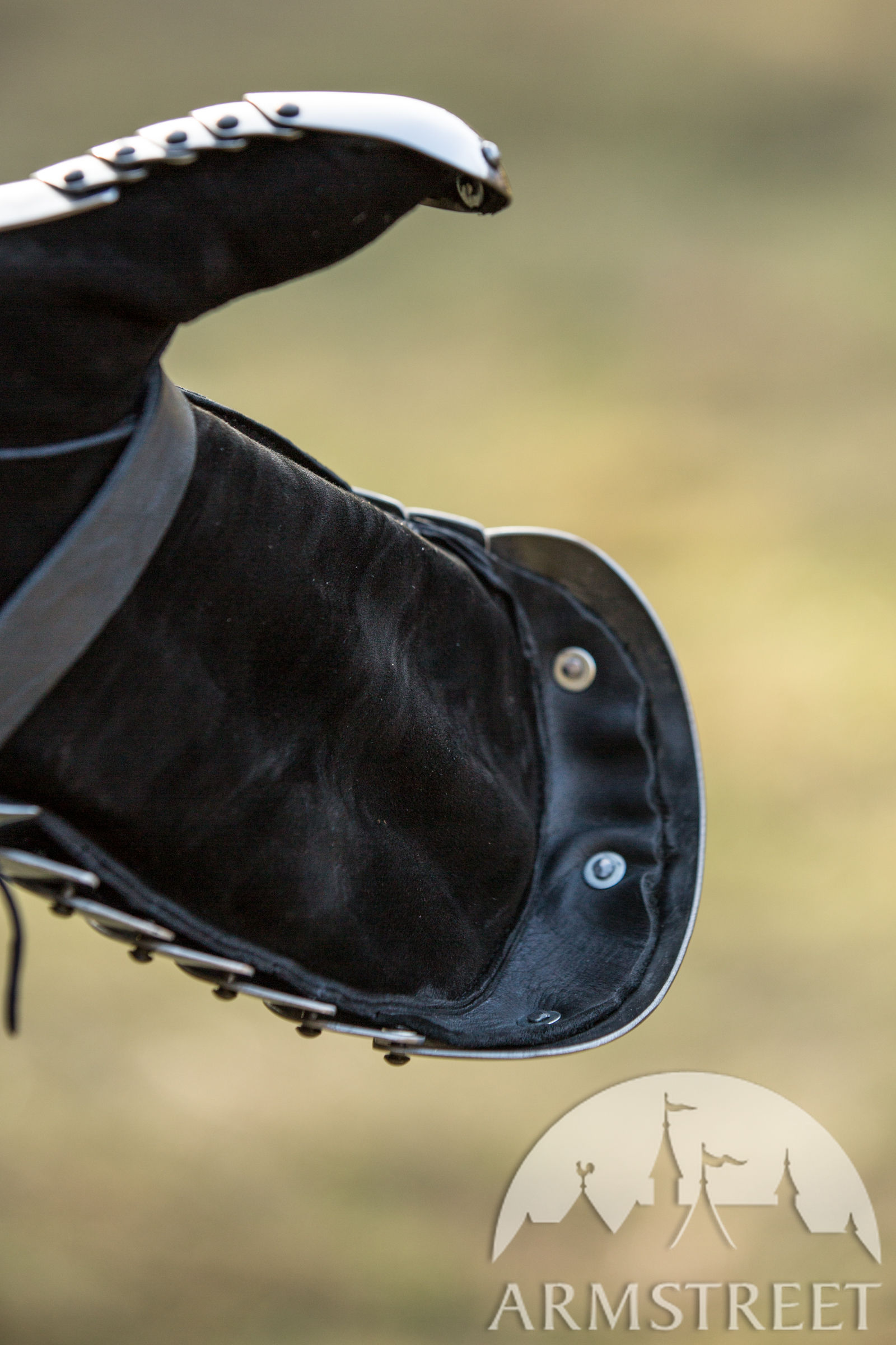 Les gantelets intérieurs en cuir sont inclus et rivetés au-dessus des doigts et du pouce au gantelet métallique ainsi vos doigts ne risquent pas de se déplacer hors le gantelet lamellaire. Ce type d’articulation empêche les gants intérieurs en cuir de remonter et de se déformer lors des entraînements intenses ou dans le feu d’un combat. La longueur du gant intérieur est ajustée pour convenir à la longueur des gantelets – plus de chevauchement incommode avec votre défense des bras.