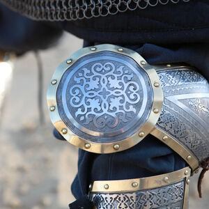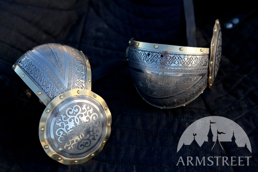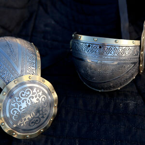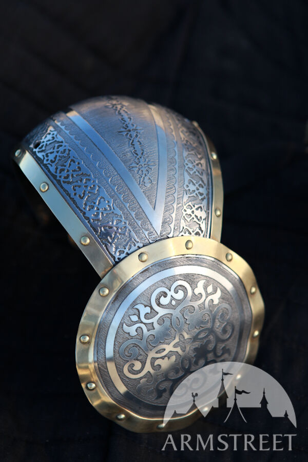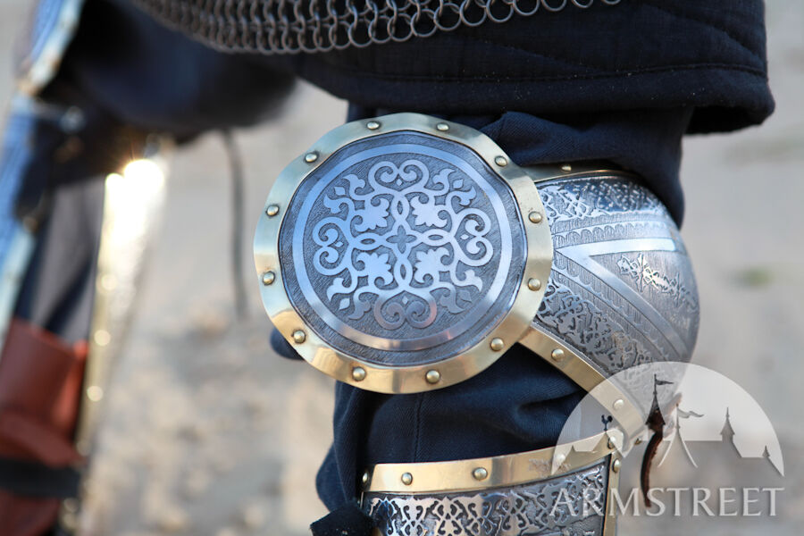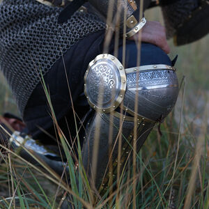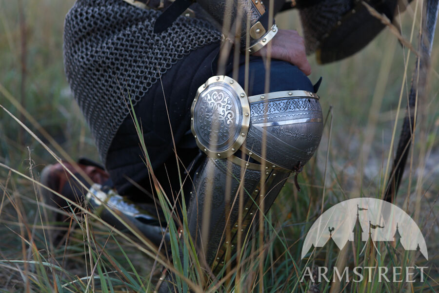 Ces genouillères font partie de notre kit « Prince de l’Est ». Pour les personnes qui n’ont besoin que de genouillères, elles sont disponibles séparément. Ainsi que d’autres pièces de la collection « Prince de l’Est », elles sont parfaitement conçues et présentent des plaques latérales magnifiquement formées, des motifs gravés et des accents en laiton. La plaque latérale a une forme extrêmement complexe et la bordure en laiton est le signe d’un véritable savoir-faire. Même cette petite pièce d’armure montre à quel point une armure est belle lorsque chaque détail s’emboîte.