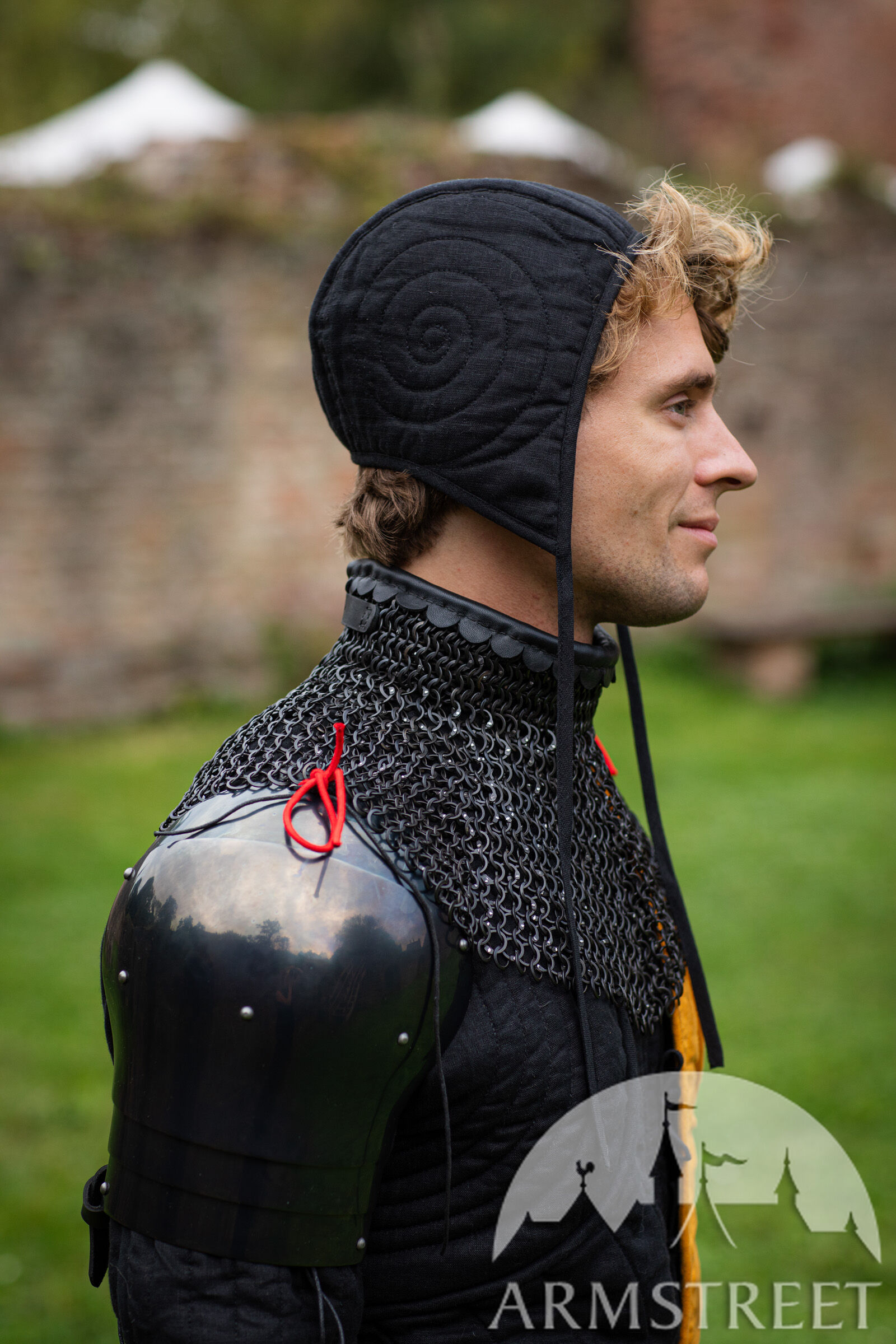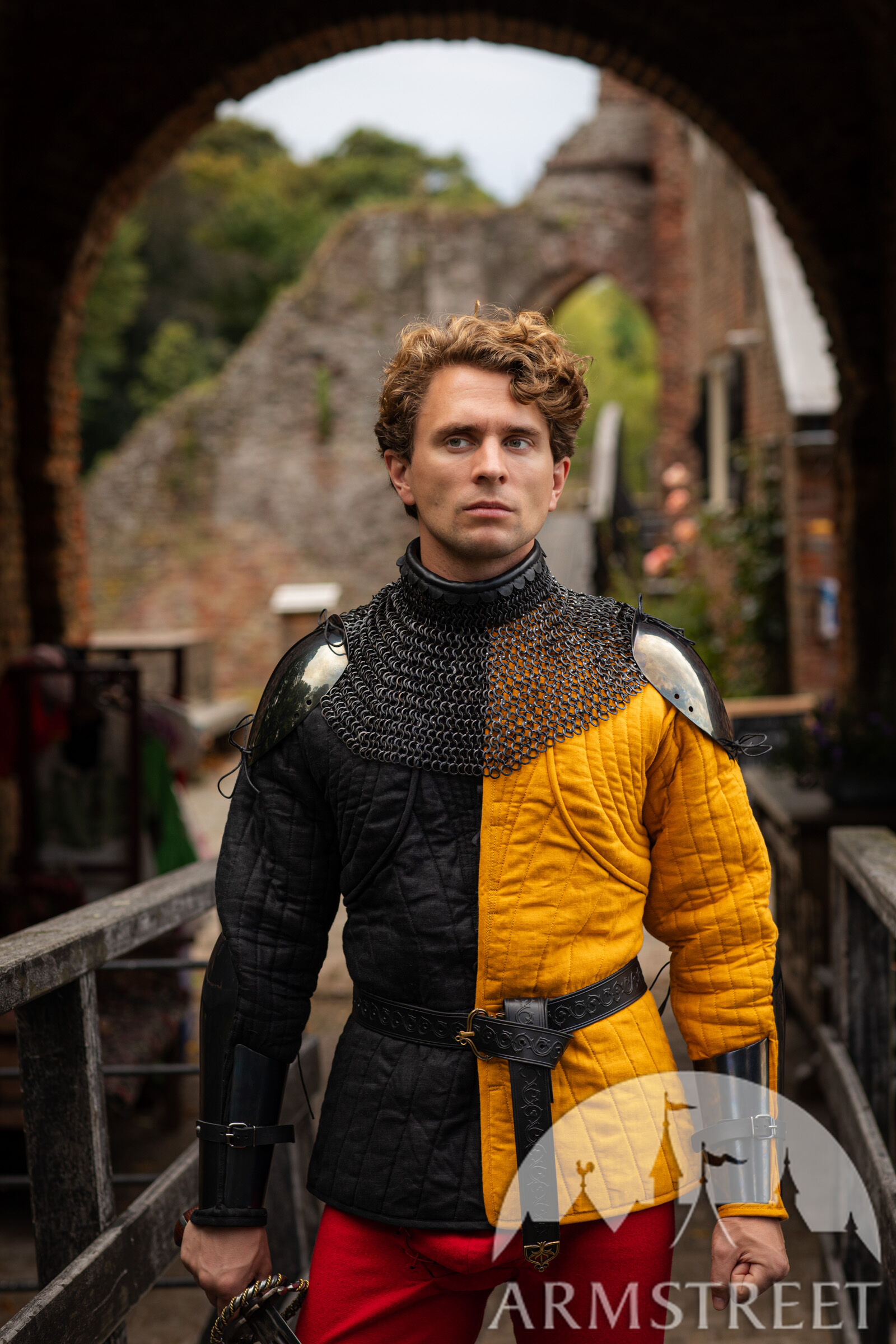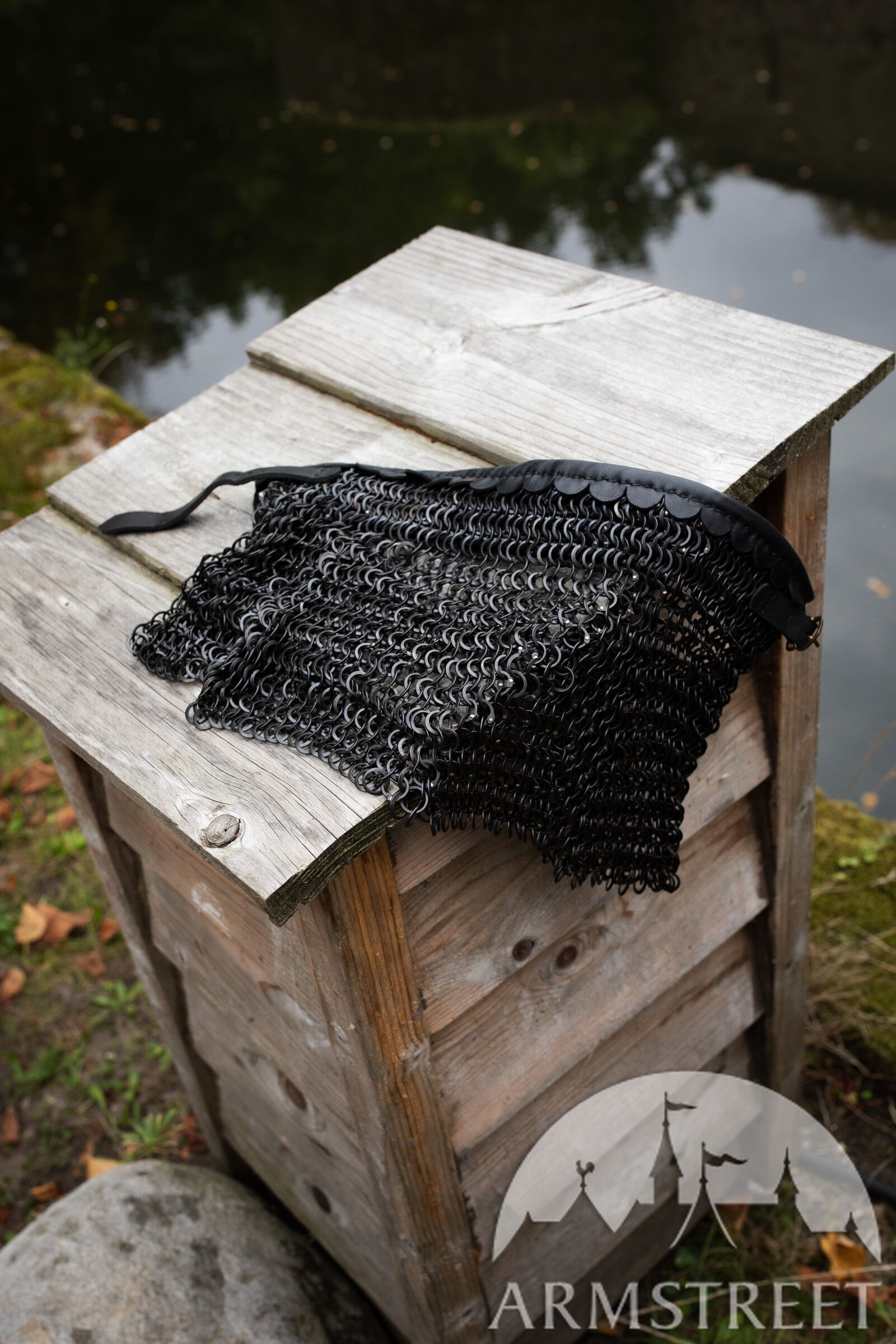 L'armure standard en cotte de mailles ajoute une touche historique et réaliste à notre armure « Mercenaire ». Si, pour des raisons pratiques, les épéistes utilisent principalement des gorgerins en acier ou en cuir, ou une combinaison des deux, l'armure standard en cotte de mailles rivetée est une pièce d'armure d'époque. Elle permet de transformer l'armure « Mercenaire » en une armure de plaques plus historique.