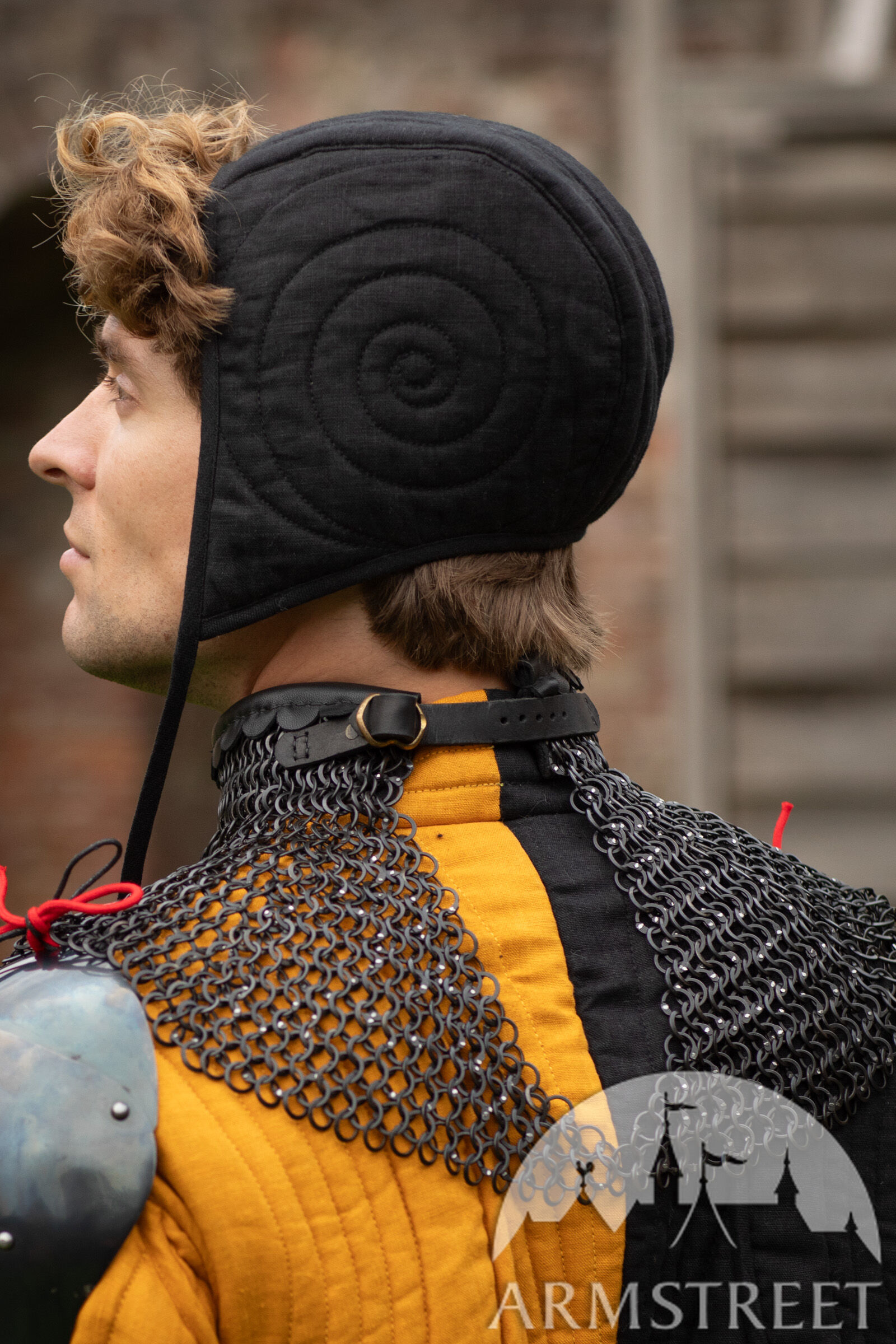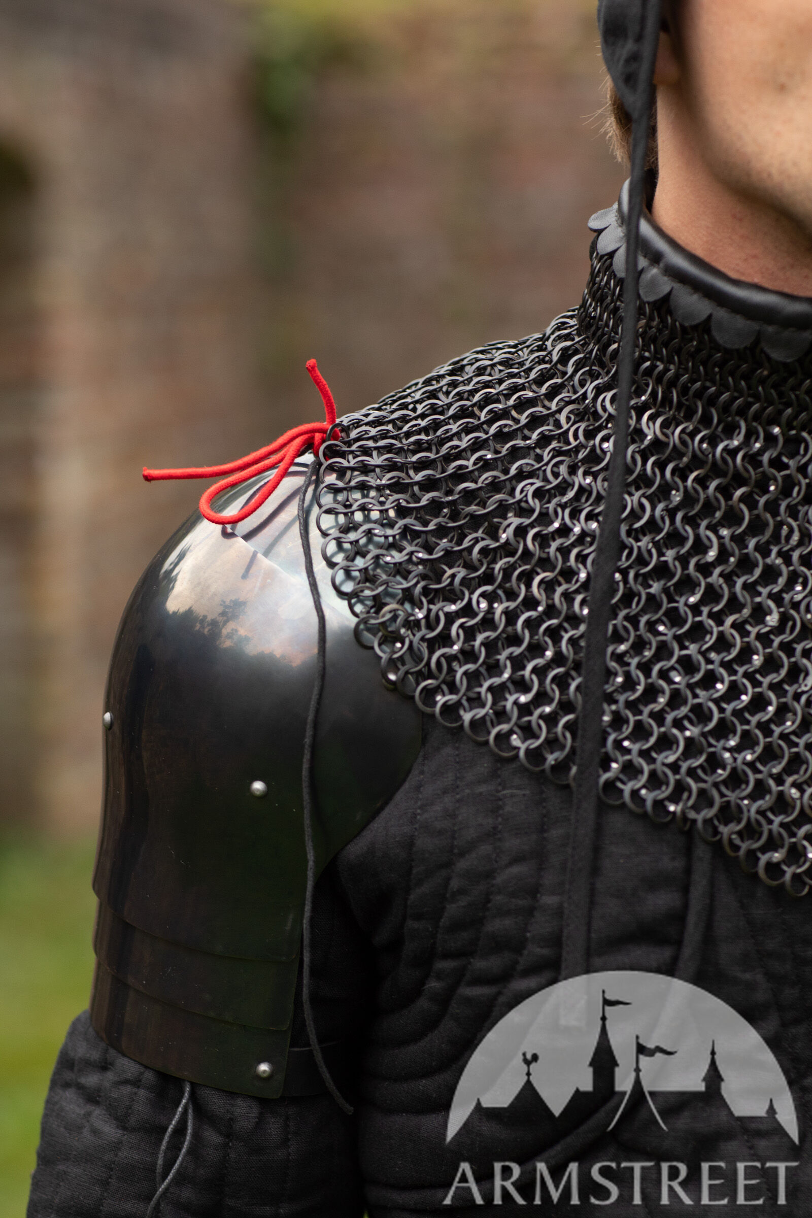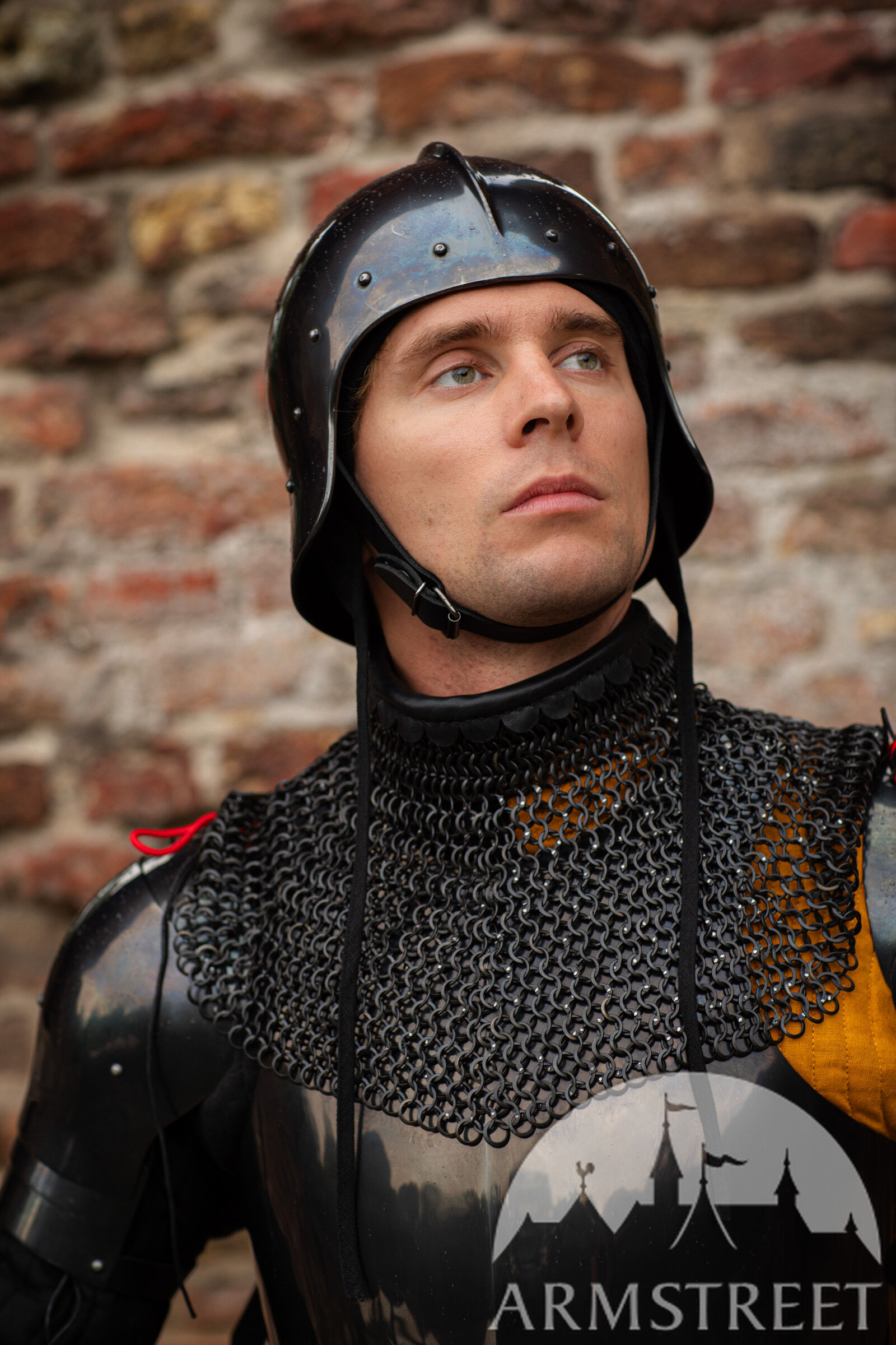 L'armure standard en cotte de mailles ajoute une touche historique et réaliste à notre armure « Mercenaire ». Si, pour des raisons pratiques, les épéistes utilisent principalement des gorgerins en acier ou en cuir, ou une combinaison des deux, l'armure standard en cotte de mailles rivetée est une pièce d'armure d'époque. Elle permet de transformer l'armure « Mercenaire » en une armure de plaques plus historique.