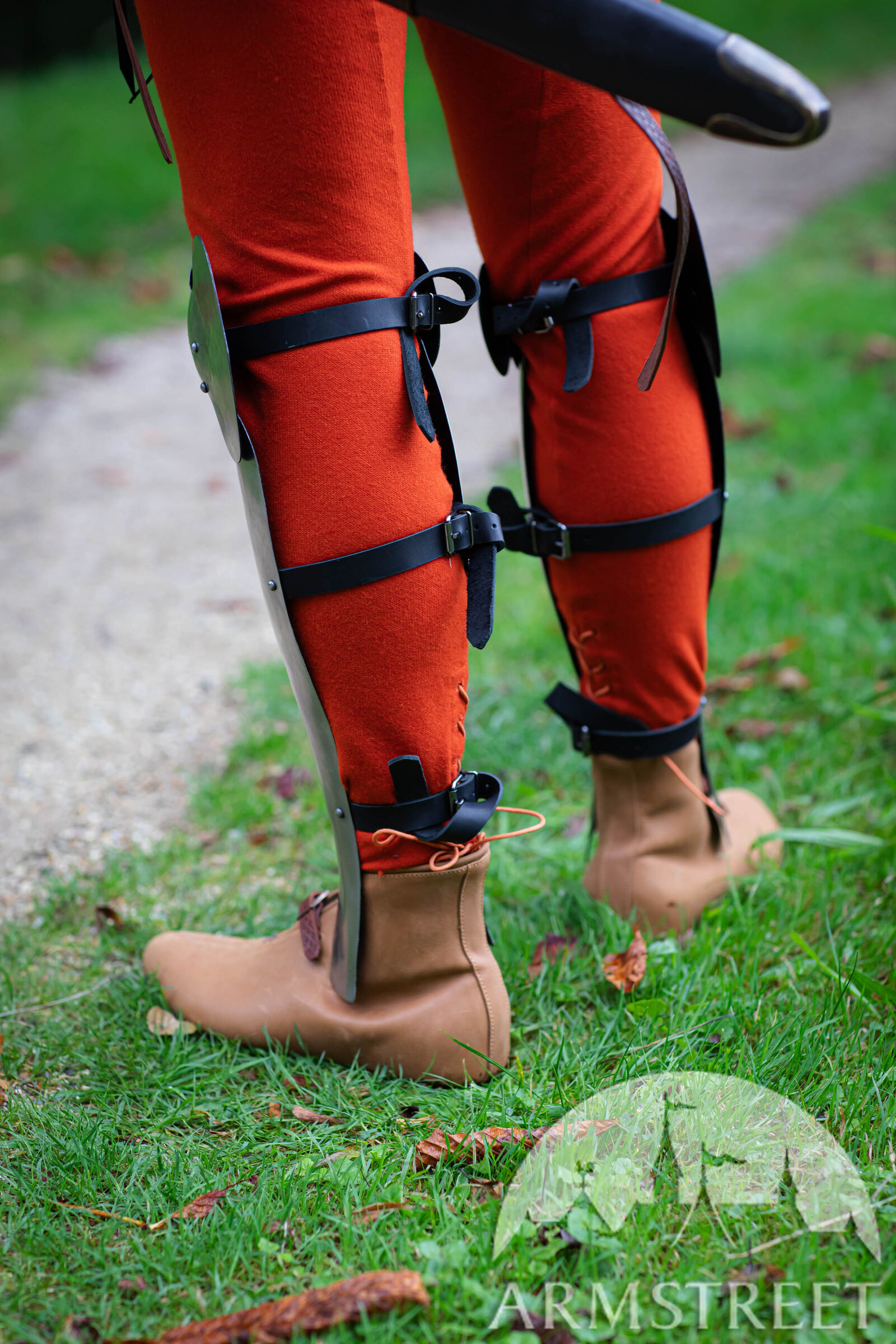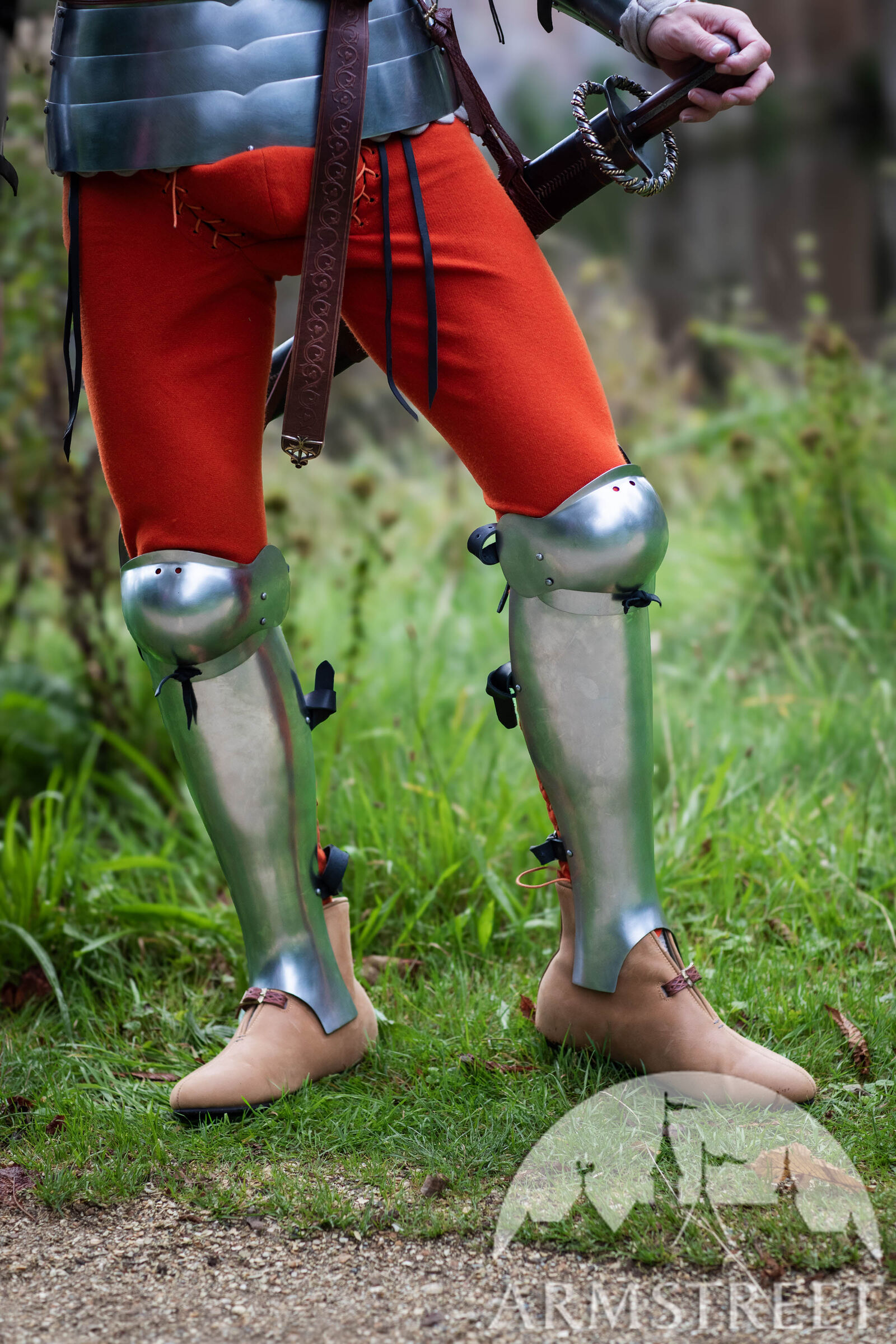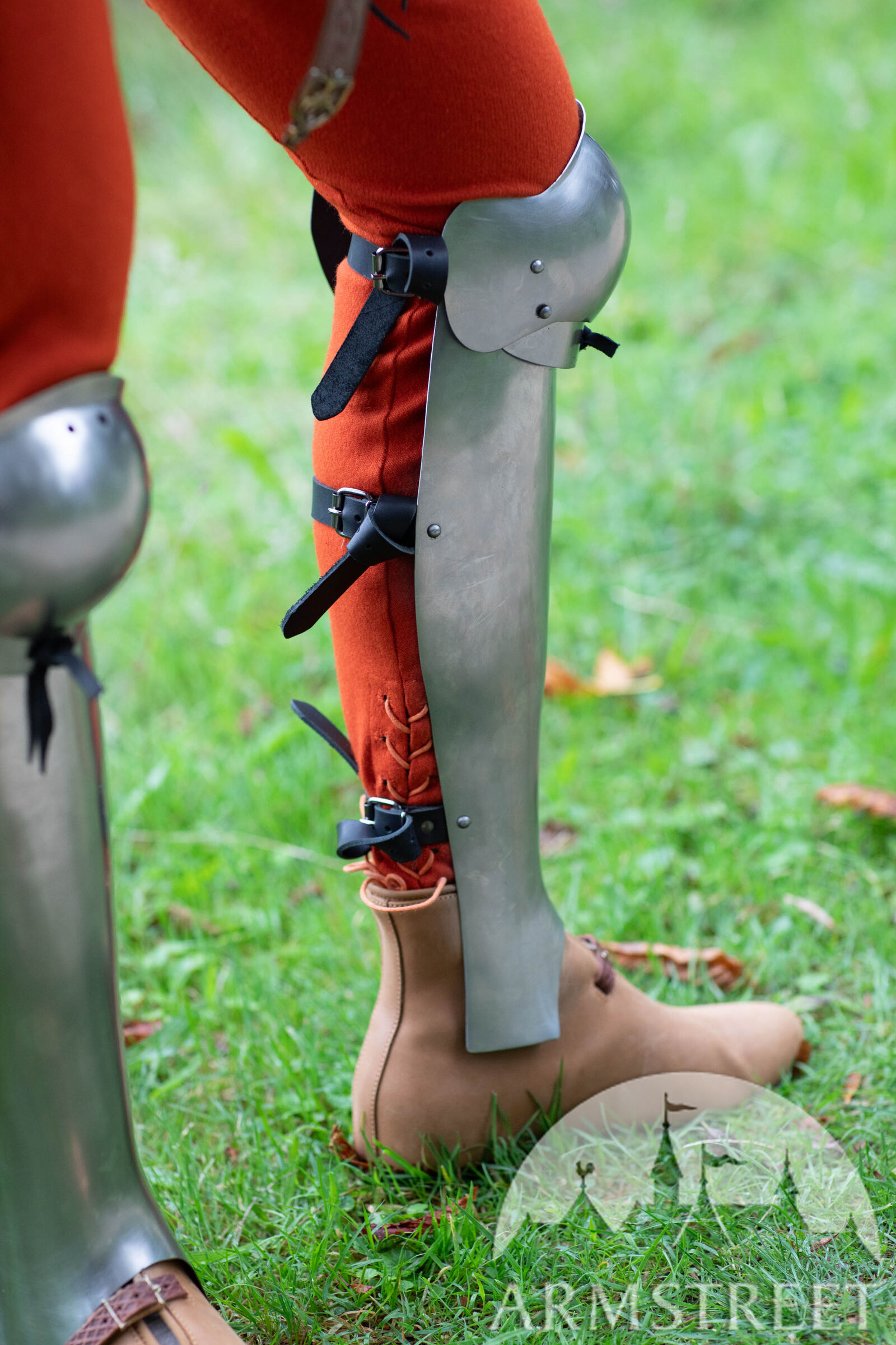 Le design de ces grèves est assez simple : une cnémide avant et des genouillères lacées offrent une protection de base. Si vous souhaitez des cuissards, vous pouvez les commander séparément. Pour vous inspirer, consultez les Jambières médiévales Rieneck.