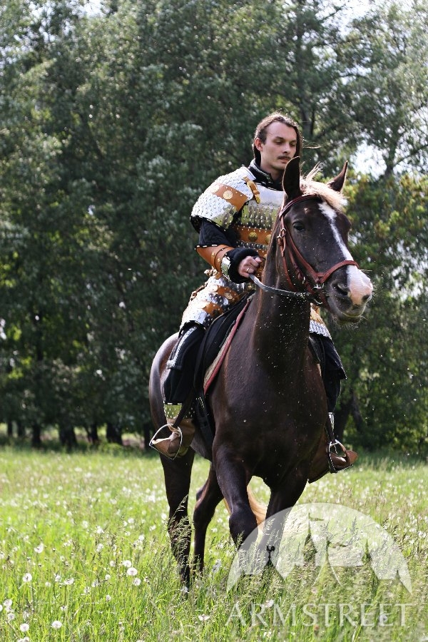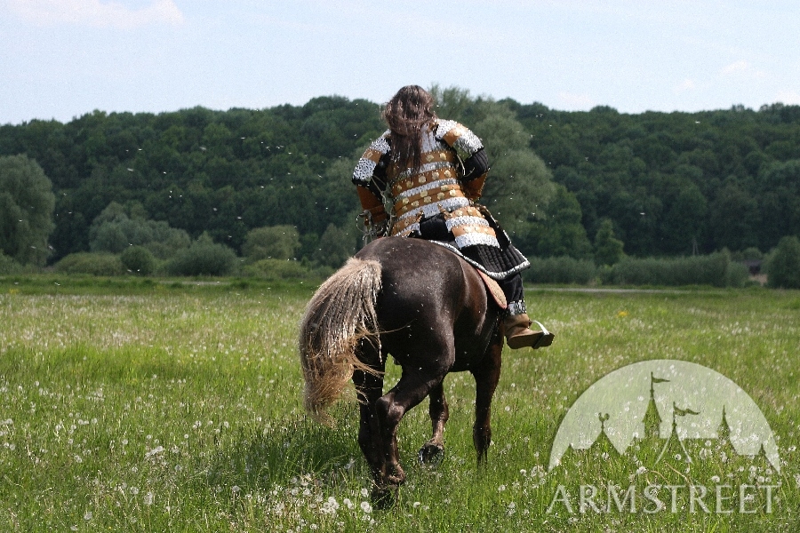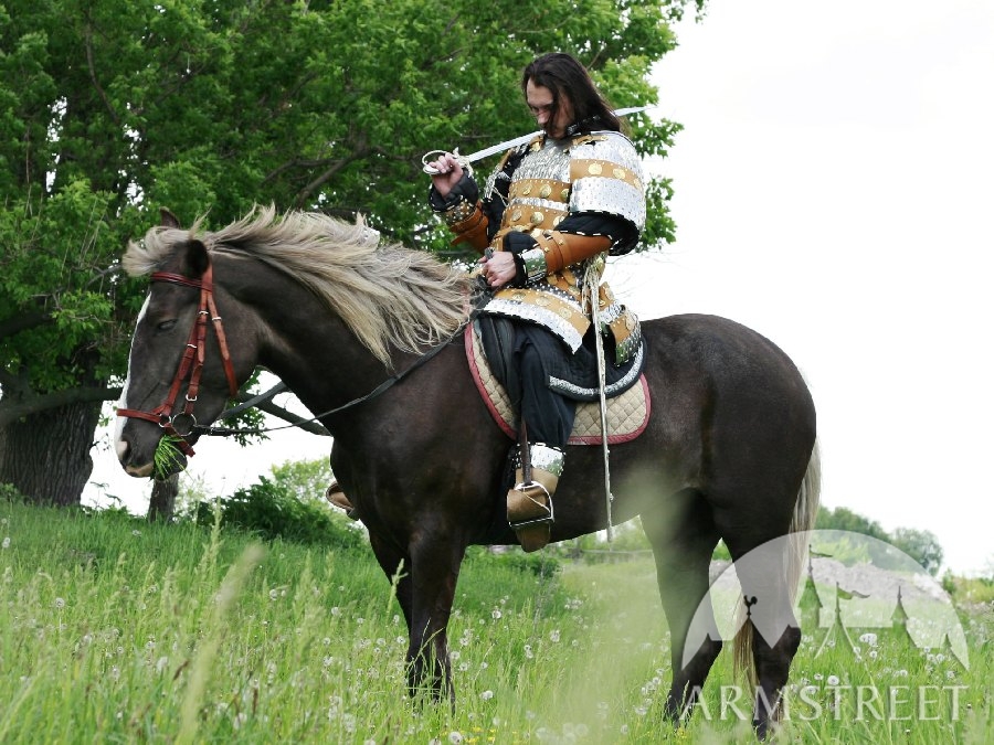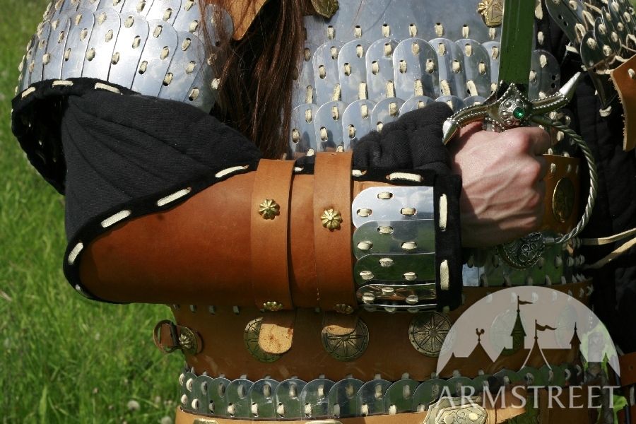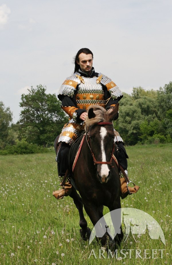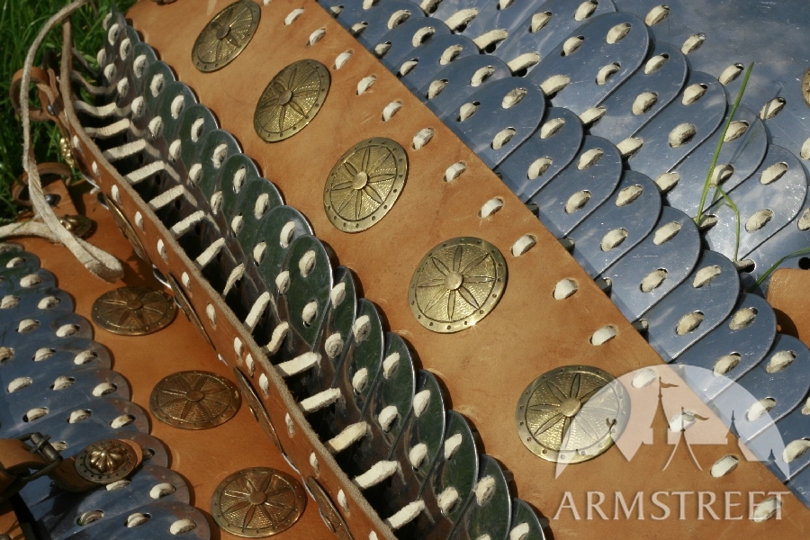 Cette armure lamellaire est faite de linges en lamelles et de linges en cuir conformément à la conception asiatique authentique. Presque toutes les technologies utilisées en produisant cette armure grande sont authentiques – ouvrages en acier et en cuir, main-monnayage et de moulage. L'armure est ornée d'ensemble des accents exclusifs à la main en laiton forgé et des agrafes à la main et est assemblée avec des rivets de coulée. Ensemble n’est pas lourde – environ 11 kilos – et a des propriétés grandes de protection à la fois grâce à propriétés grandes de choc-absorption de la combinaison de lamelles d'acier formé et de cuir.