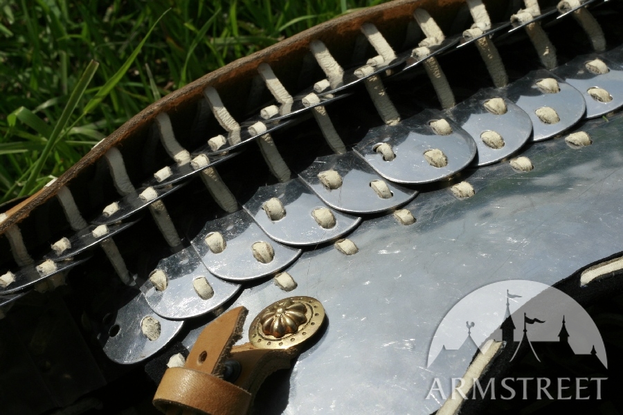 C'est une armure de combat absolument achevée qui donne super envie. Chaque ligne de lamelles est recouverte de cuir. Laçage est fait du cuir aussi.