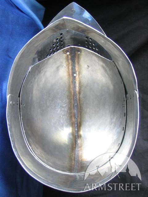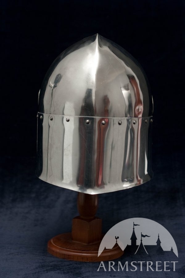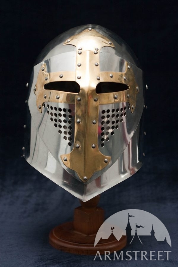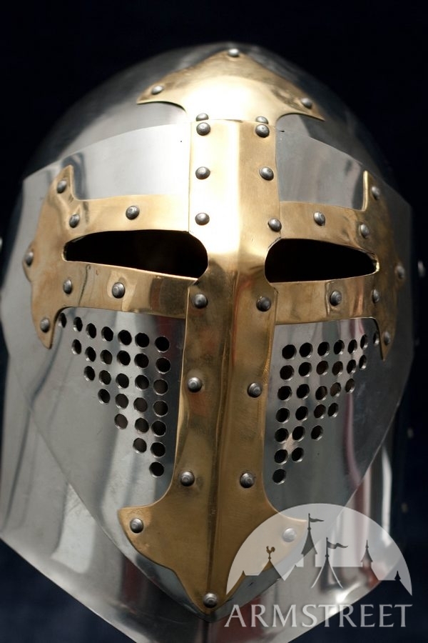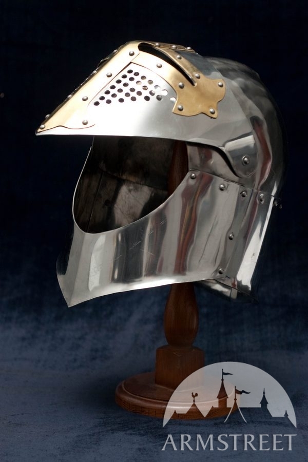 Le heaume a été développé en Allemagne au XIV siècle et a été très populaire en Europe de l'Ouest jusqu'à la prochaine siècles. Ce casque est fait en acier laminé à froid de la haute qualité 2 mm (jauge 14) avec des accents en laiton. La visière absolument fonctionnel est l'une des enseignes du travail de haute qualité!