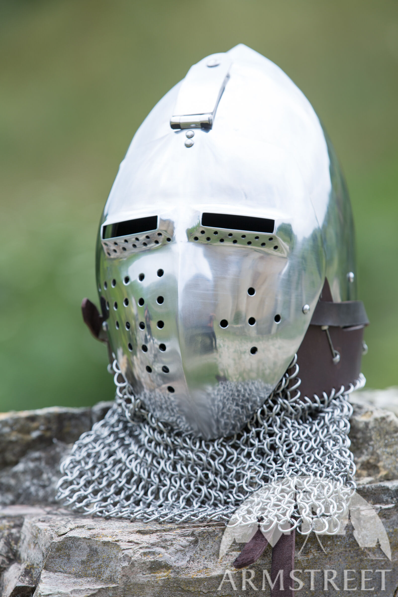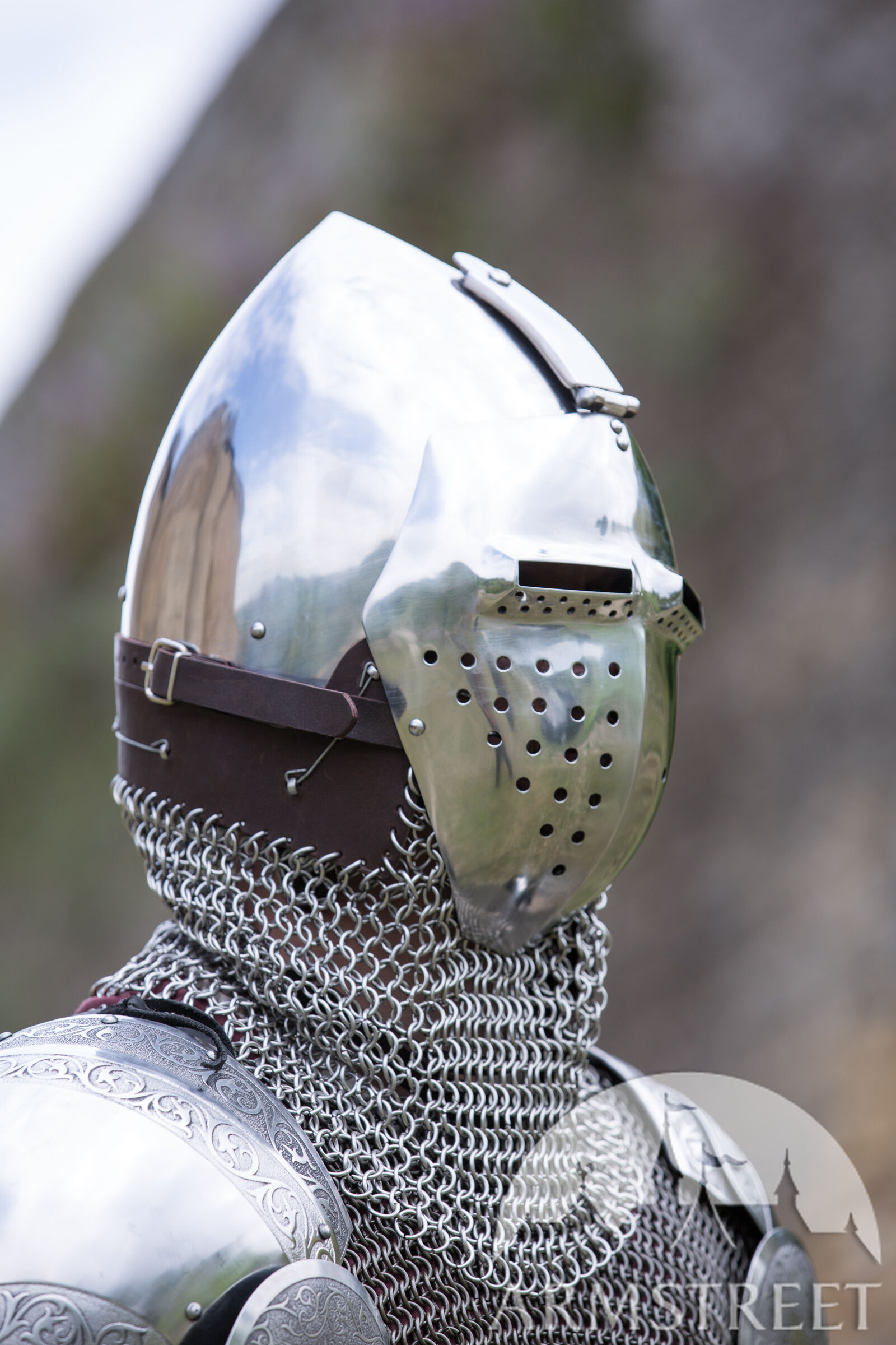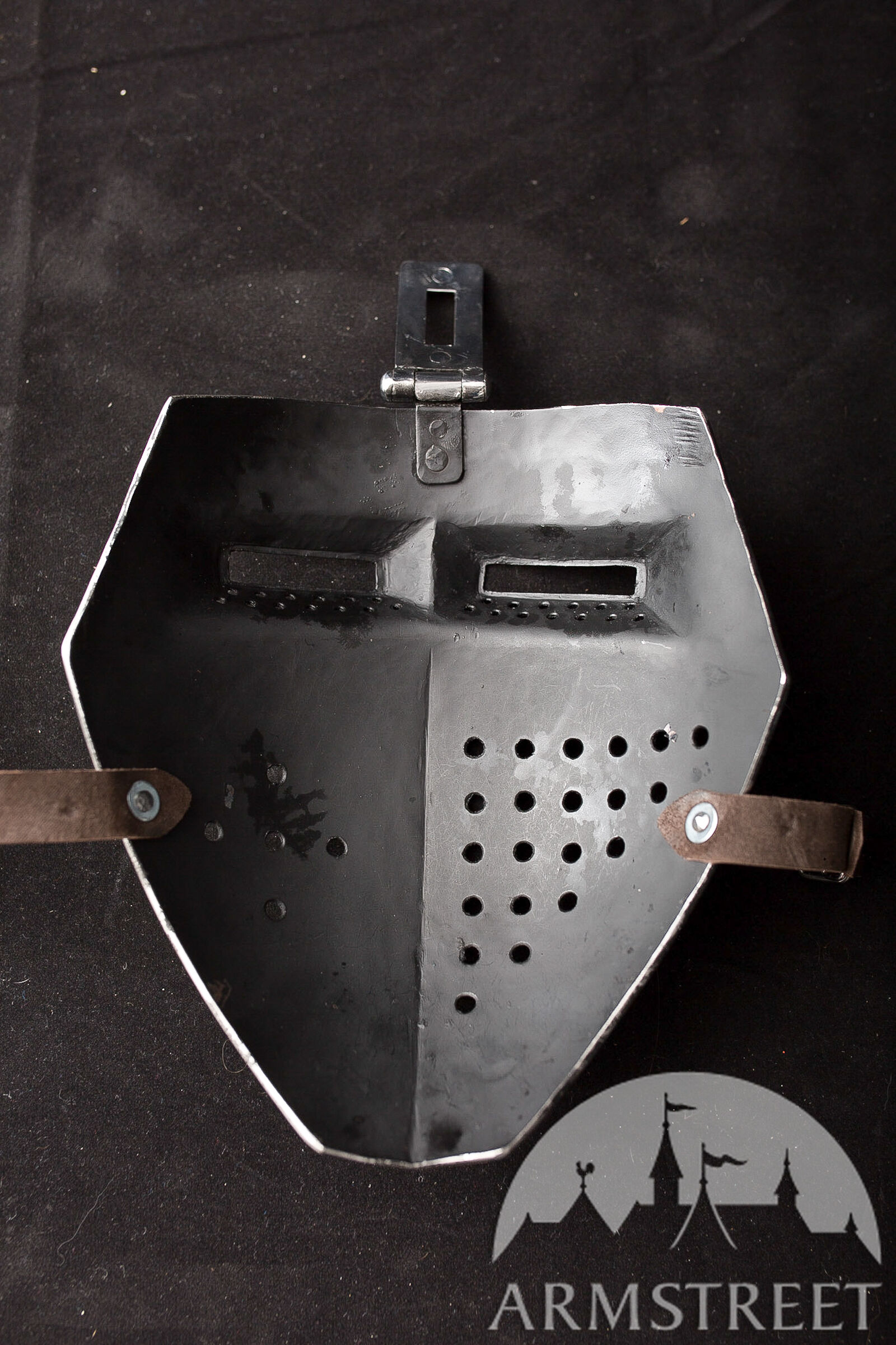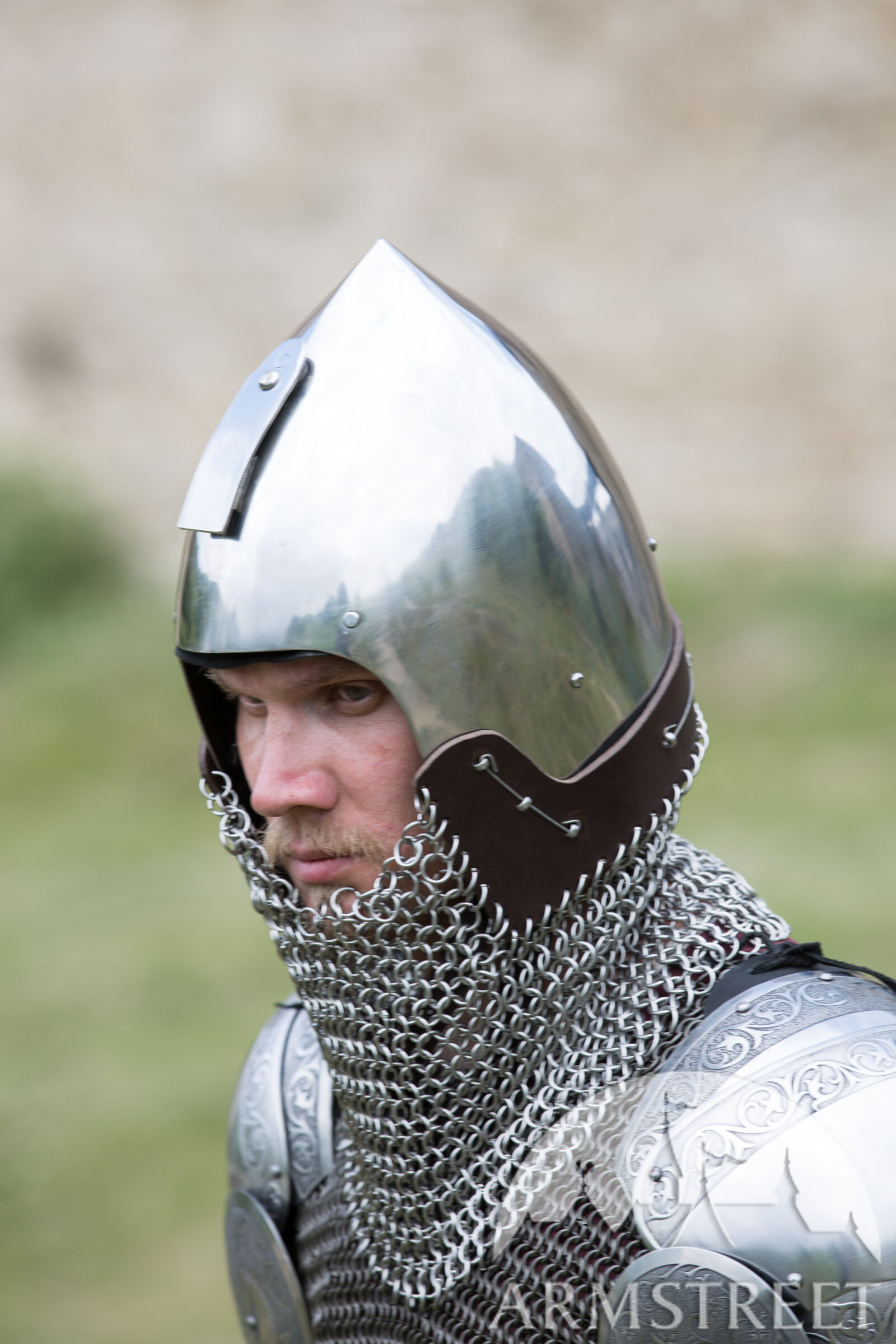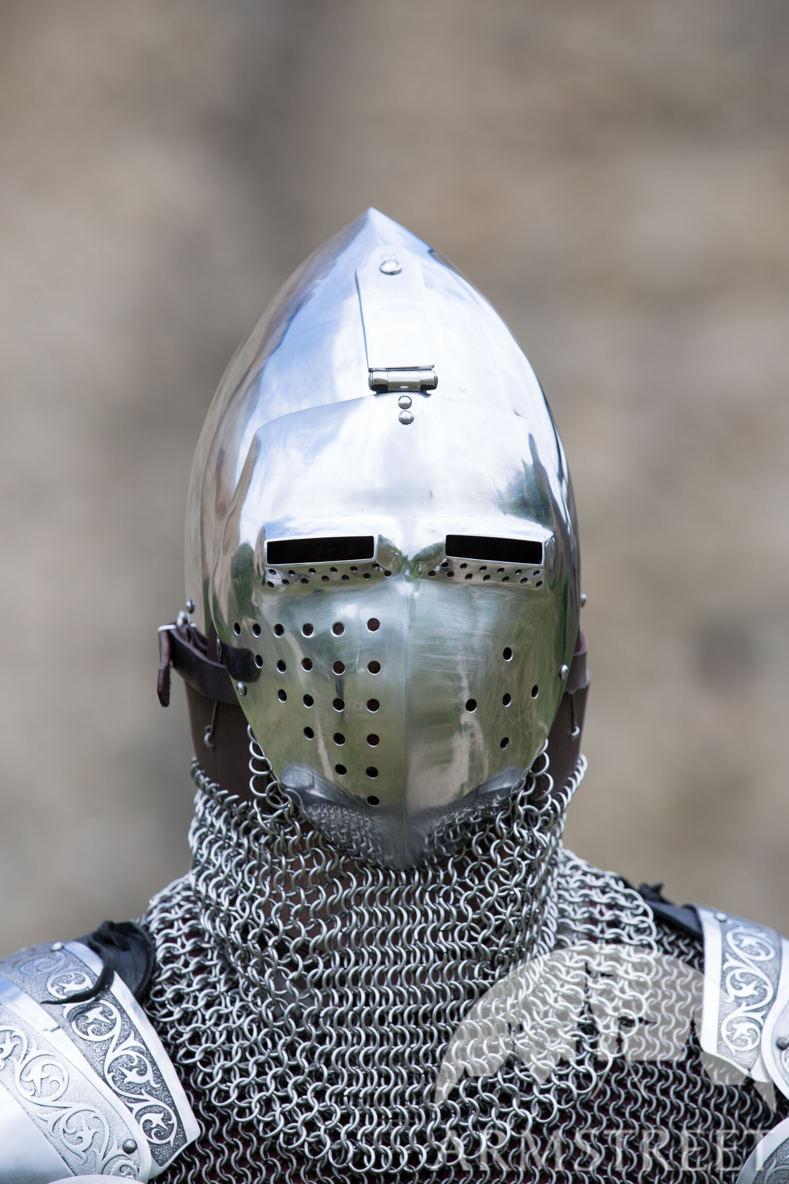 Cette version de notre casque bacinet a un charnière authentique fait à la main qui tient très bien, donc le casque peut éventuellement être ajusté avec visière amovible « grillagée ». Nombre de trous et leur position sont également en option.