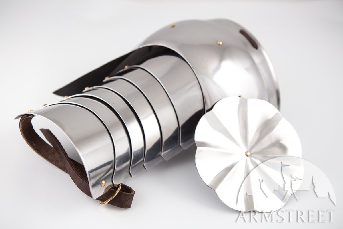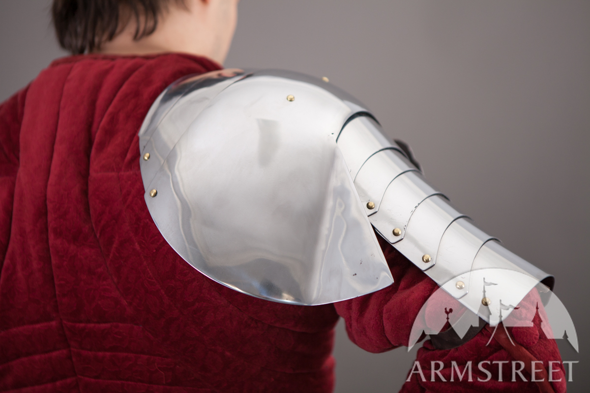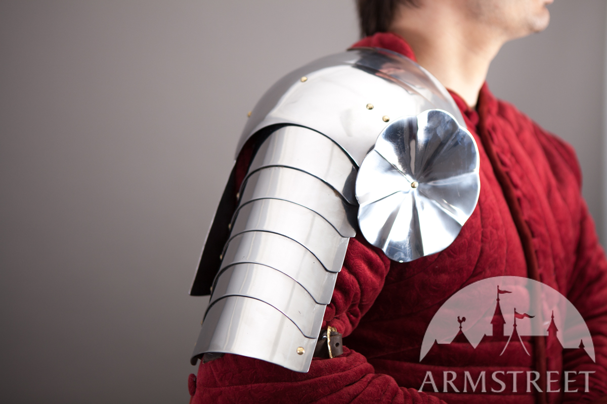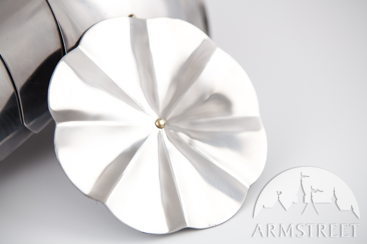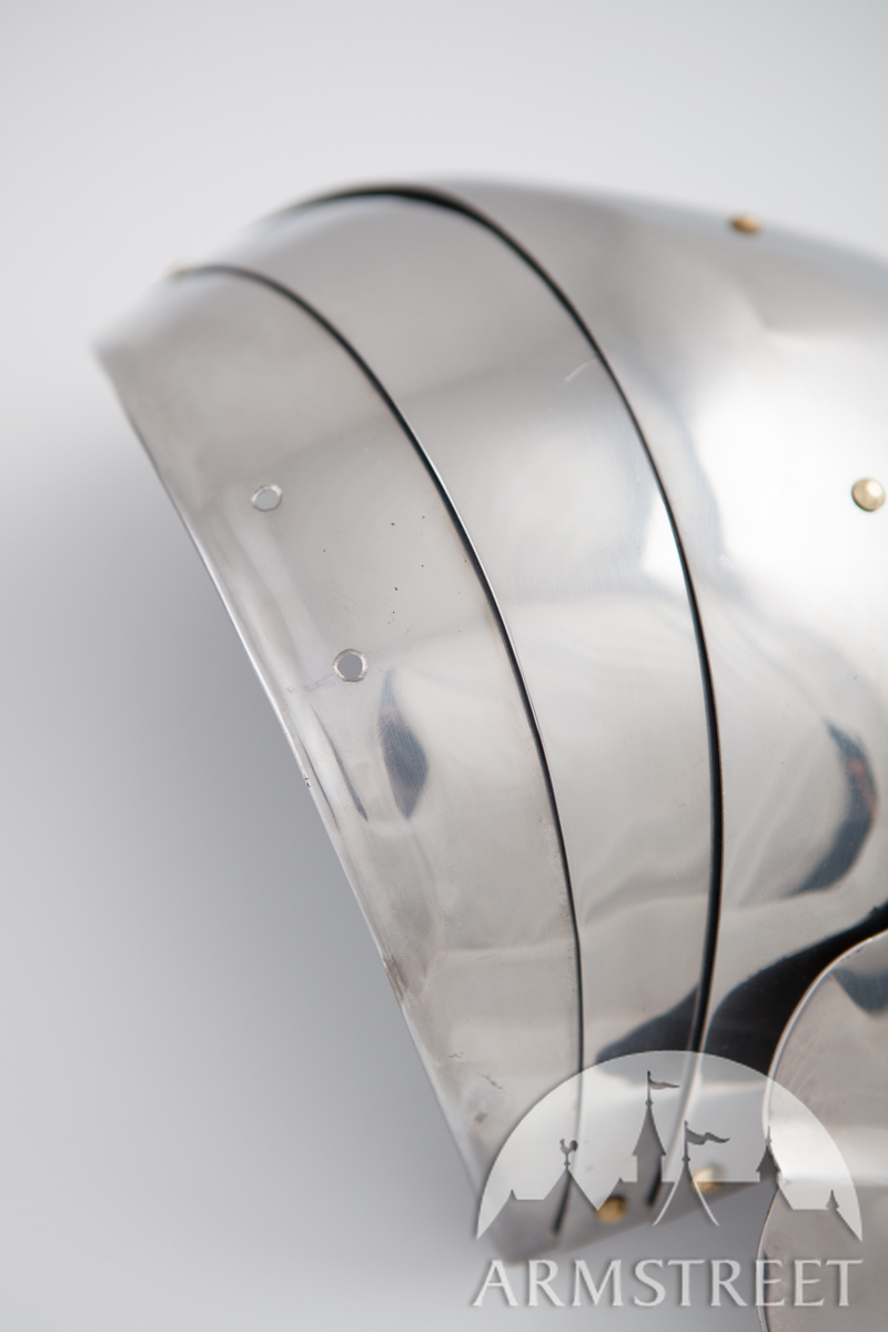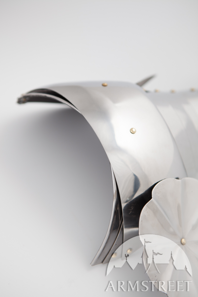 La construction avec les rivets massifs coulissants rend cette armure durable et très flexible en même temps. Cette version a été conçue pour correspondre à notre cuirasse « Paladin » et aux fins de joute équestre. Les différences au modèle de base sont les plaques étendues arrière et les segments plus grands des biceps. Cet article va sans gravure, la version de plaques planes des épaulières « Paladin ».