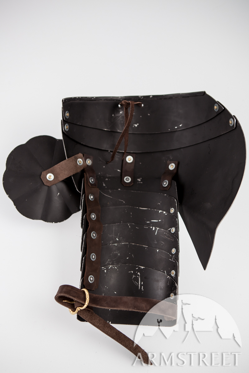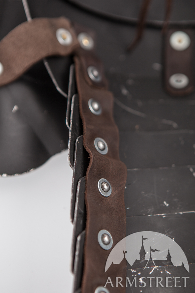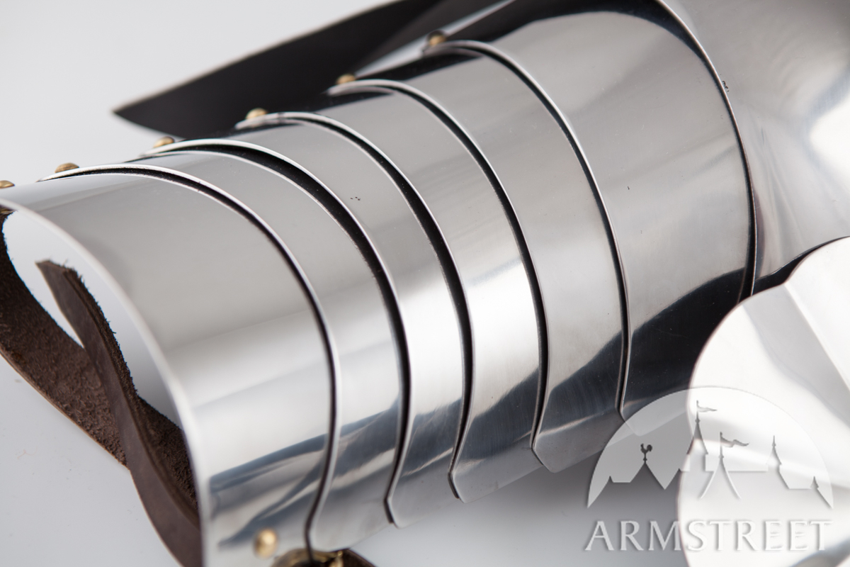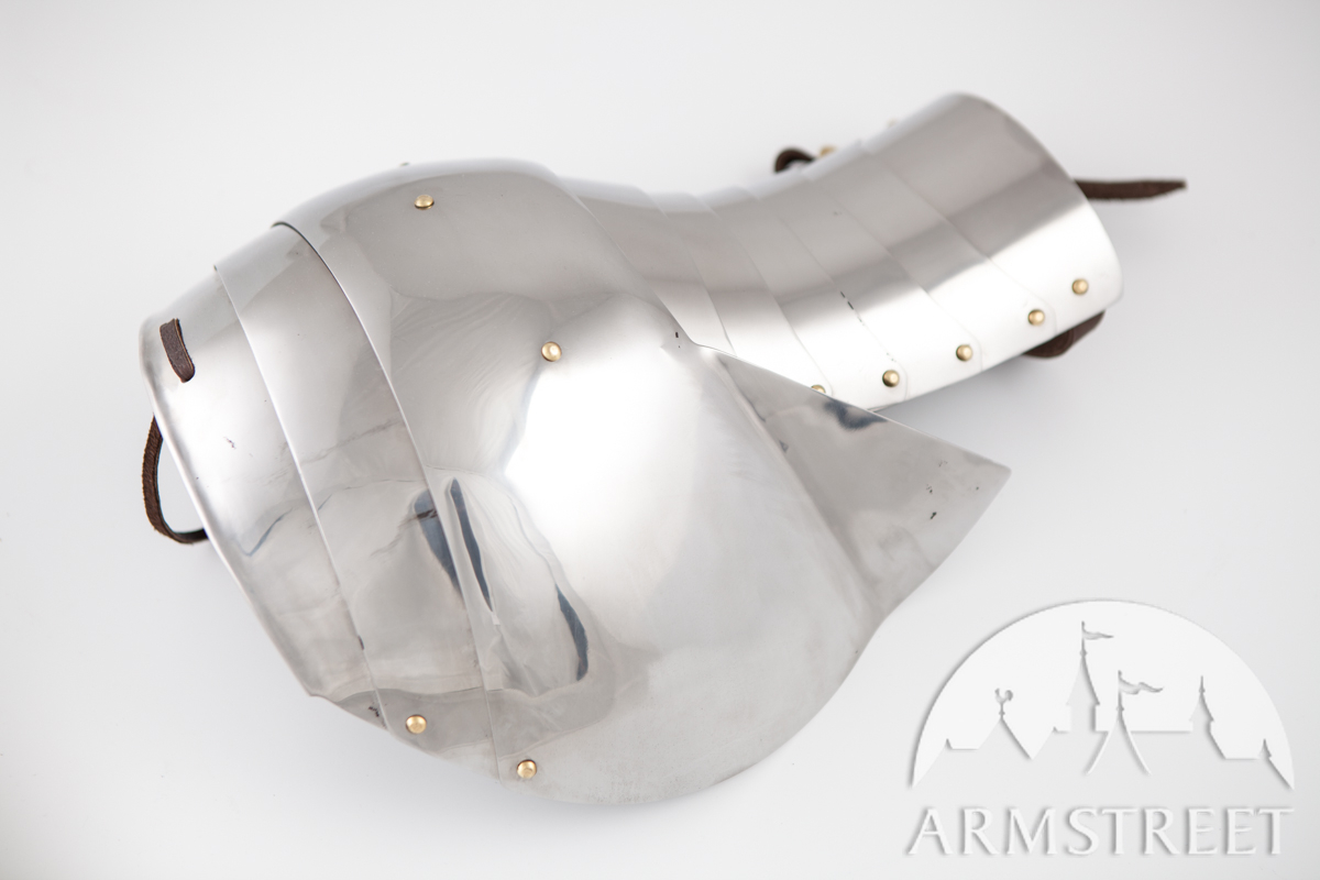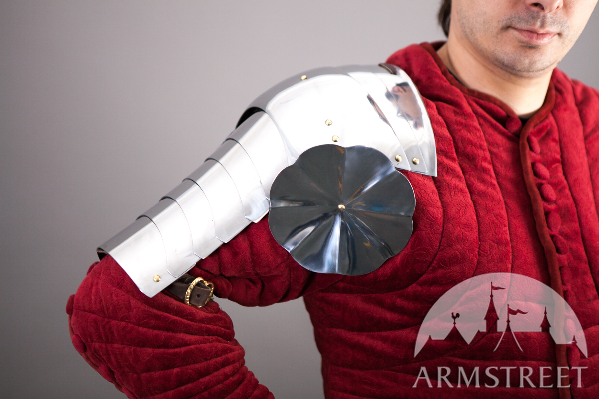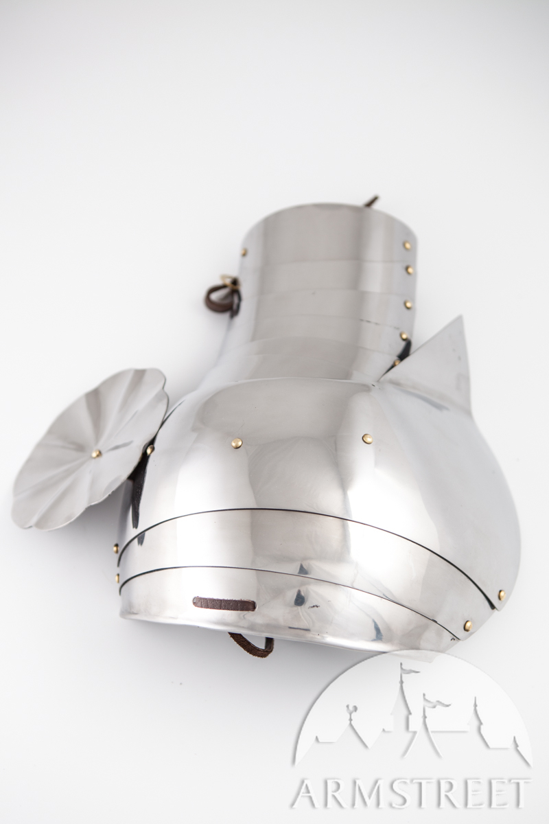 La construction avec les rivets massifs coulissants rend cette armure durable et très flexible en même temps. Cette version a été conçue pour correspondre à notre cuirasse « Paladin » et aux fins de joute équestre. Les différences au modèle de base sont les plaques étendues arrière et les segments plus grands des biceps. Cet article va sans gravure, la version de plaques planes des épaulières « Paladin ».