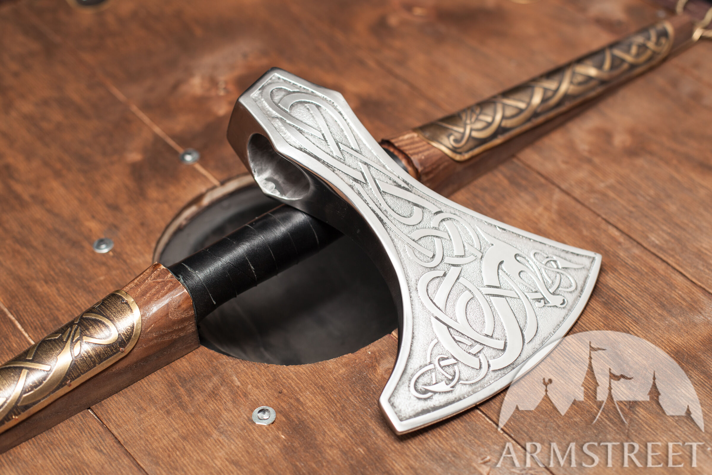 Cette hache n’a pas du prototype exact, mais sa forme et le motif gravé sont basées sur les fouilles et ornements traditionnels vikings donc ce sera une belle partie de votre tenue et d’armure du nord. La hache est faite en acier inoxydable et elle ne peut être utilisée que comme l’accessoire d’apparat.