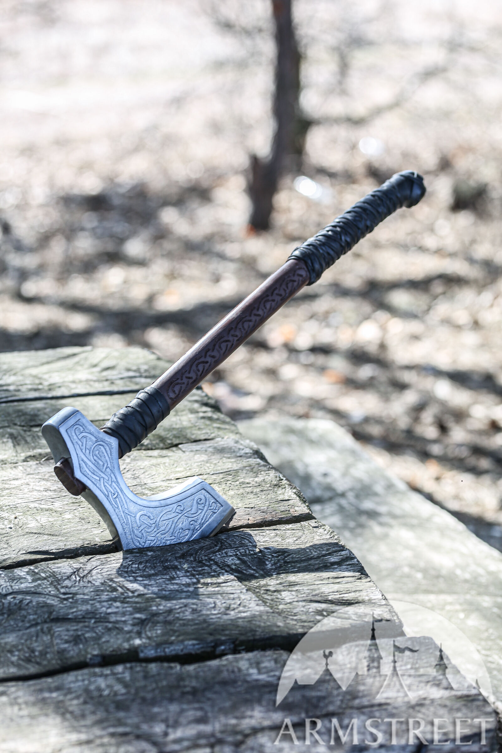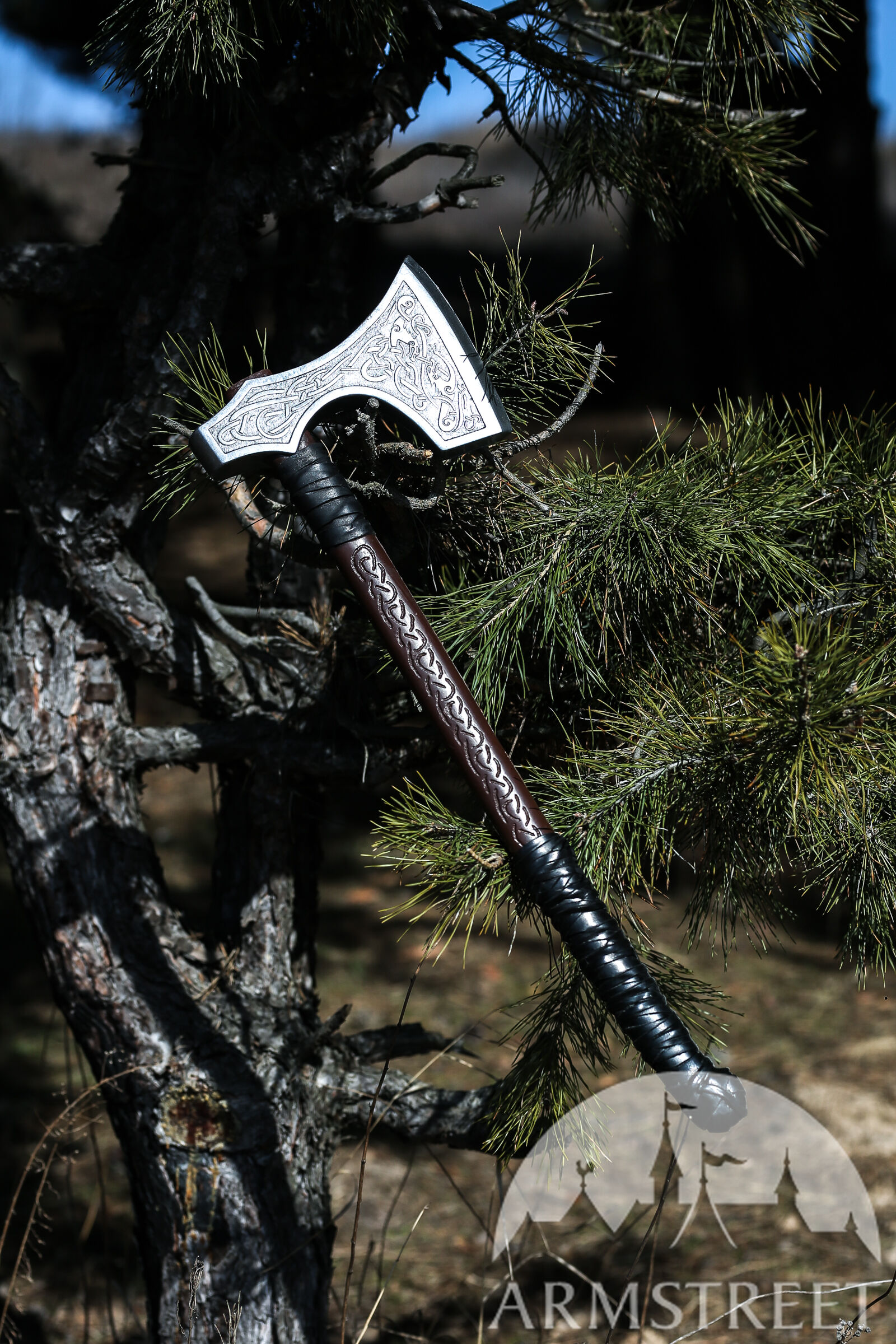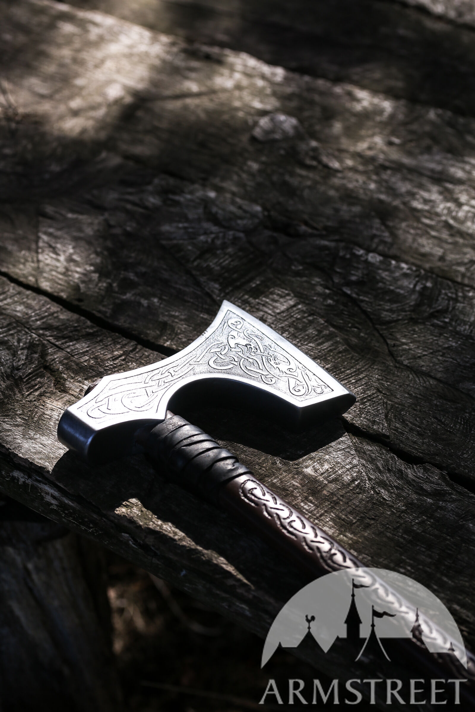 Tous les designs de ce type d’arme sont une invention exclusive d’ArmStreet créés par notre équipe de designers et imitent et apportent une nouvelle vision à l’héritage artistique des Vikings. Le motif sur le fer de hache représente les loups qui s’entrelacent. Un motif à l’entrelacs est « sculpté » dans le manche « en bois » de la hache.