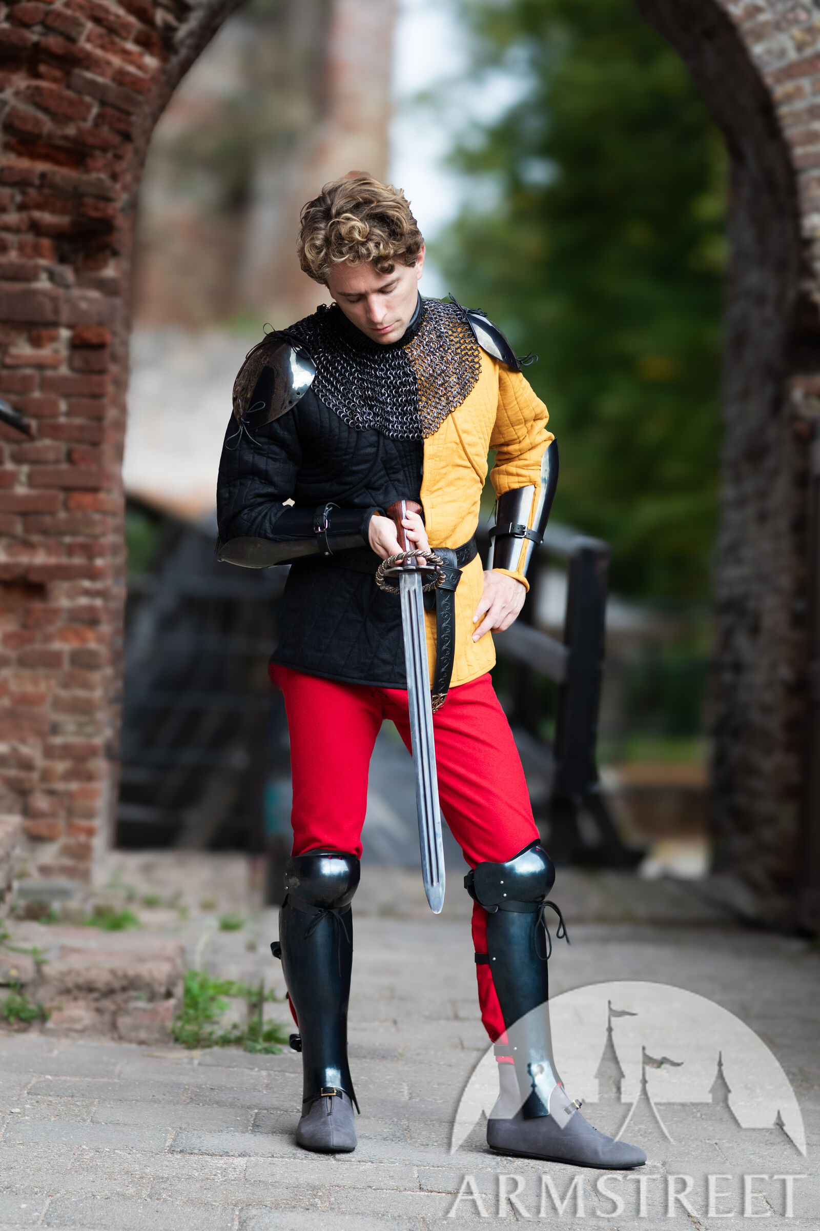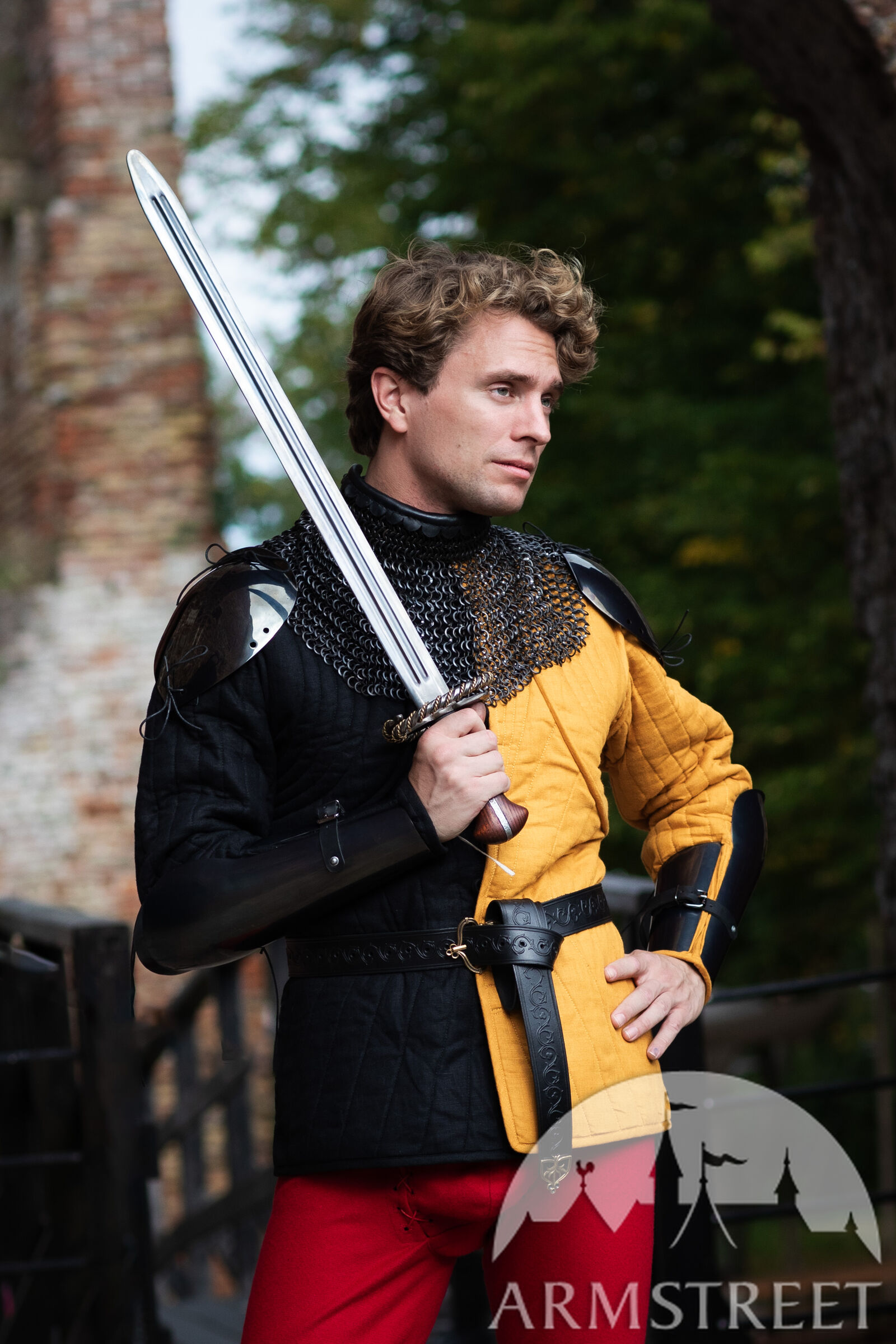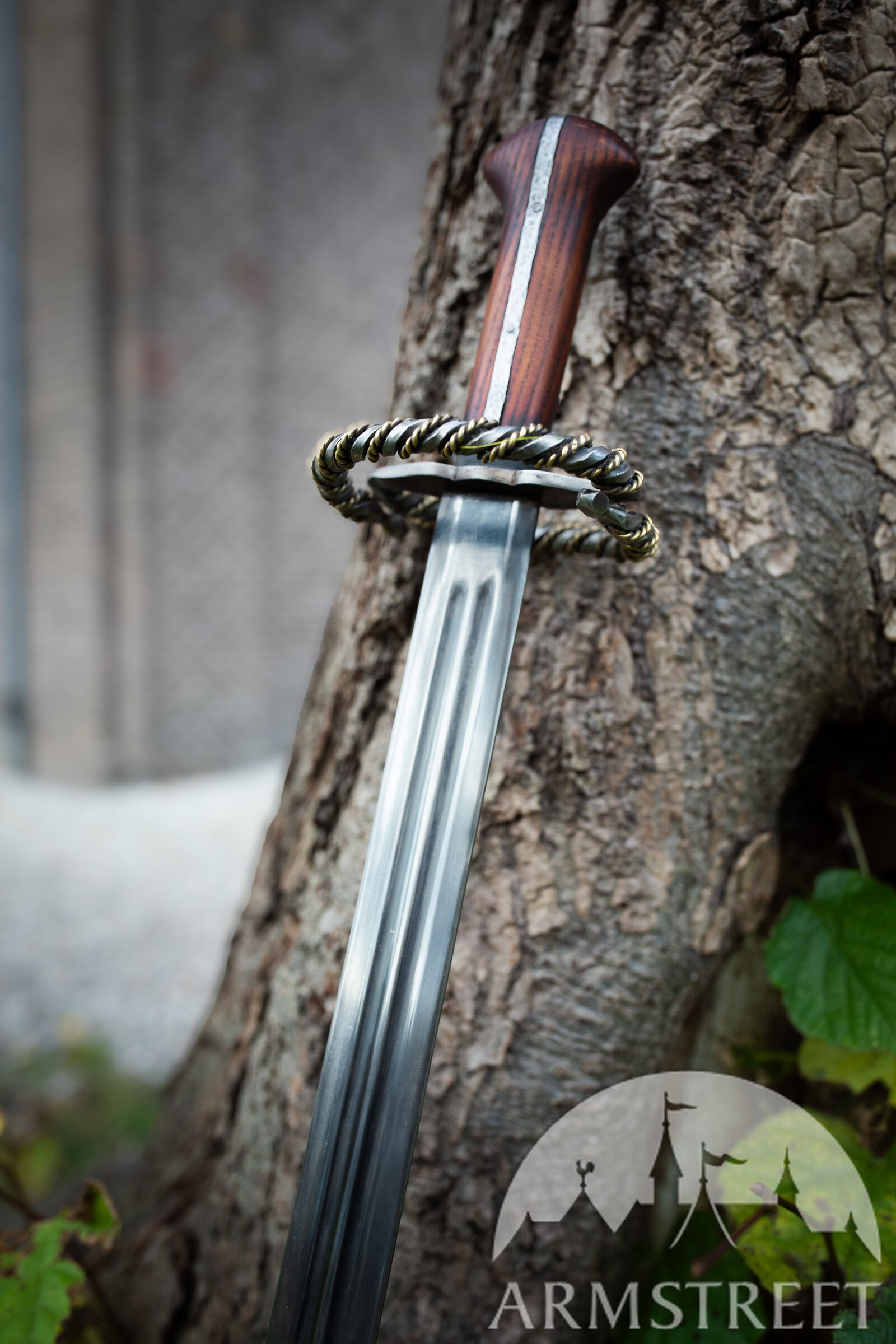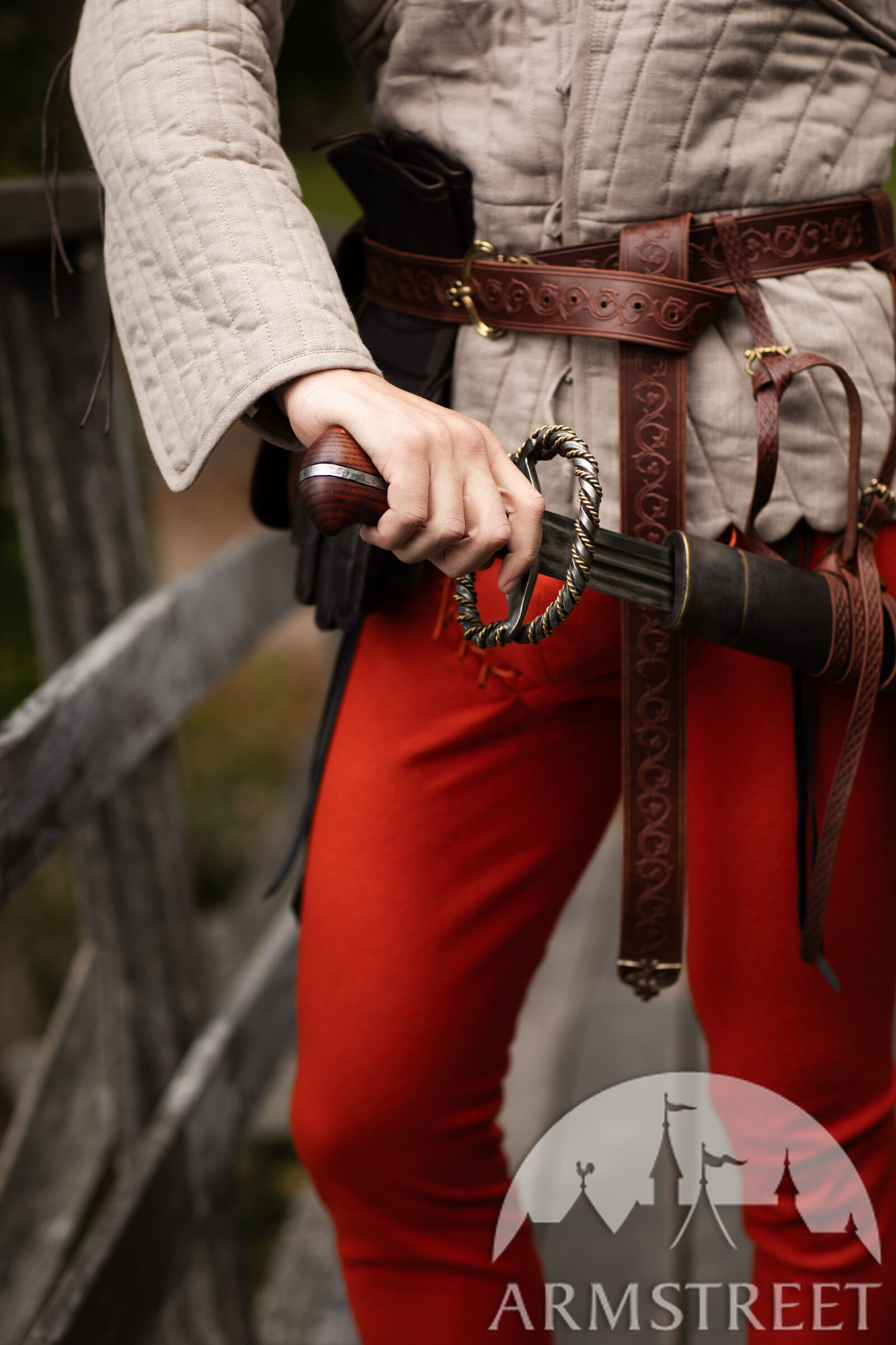 Si l’armure « Mercenaire » se veut simple et pratique, l’épée, elle, affiche un design élaboré. Elle réunit tous les détails que nous aimons tant : une garde élégante ornée de laiton, une poignée en bois, une lame légèrement assombrie, ainsi que toute une multitude de petites finitions qui montrent que son propriétaire s’y connaît en armes et éprouve un véritable attachement pour son épée.