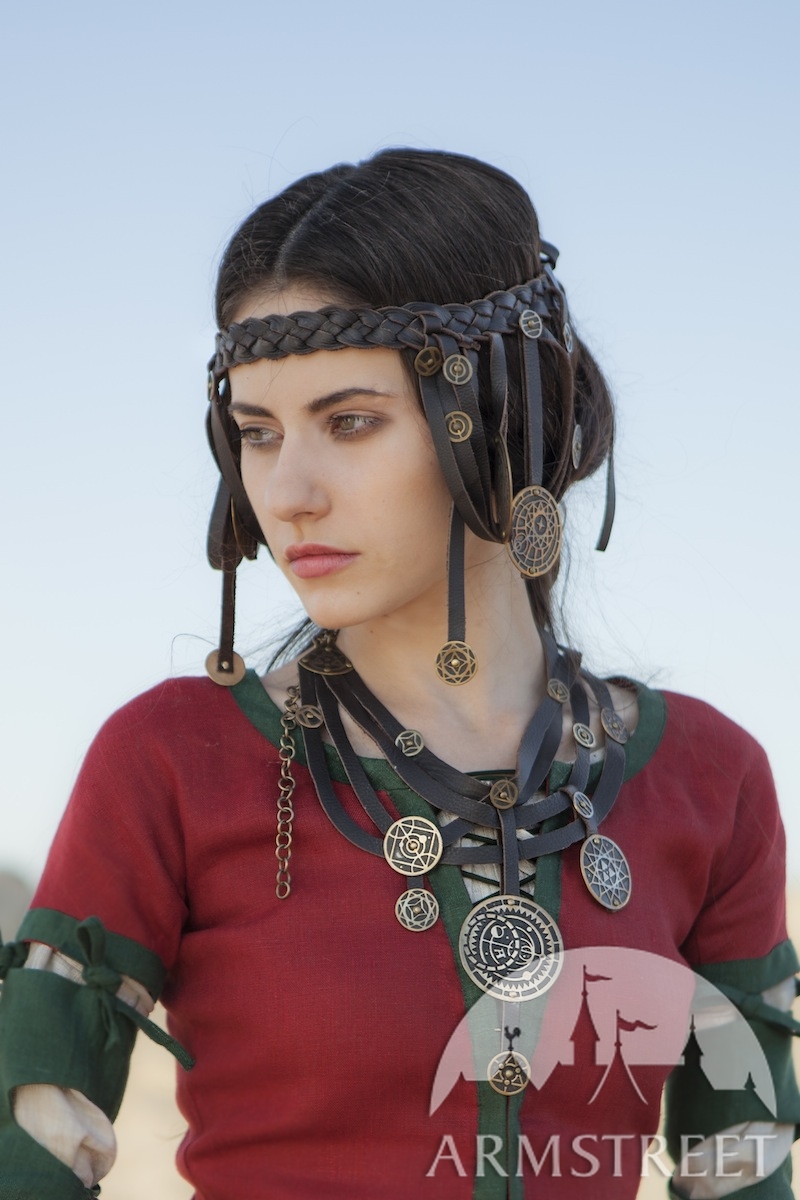 Ce collier unique a été conçu spécialement comme une partie de notre ensemble « Fille de l'Alchimiste » de robe et accessoires. Un embrouillage élégant et un aspect naturel sont le résultat du travail dur et de la vision imaginaire de nos designers et artisans. Les lacets en cuir naturel sont décorés avec accents de laiton (ou acier inoxydable en option). Chaque accent est gravé et réalisé à la main.
