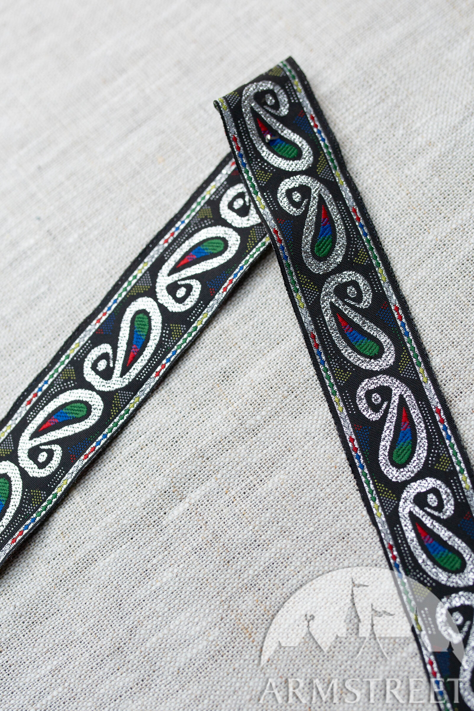 Ce passement étroit présente des ornements cachemire argentés remplis de couleurs vertes, bleues et rouges sur fond noir - une palette de couleurs contrastée et inhabituelle appliquée à un motif traditionnel, polyvalente et adaptée à divers projets de costumes médiévaux de bricolage.