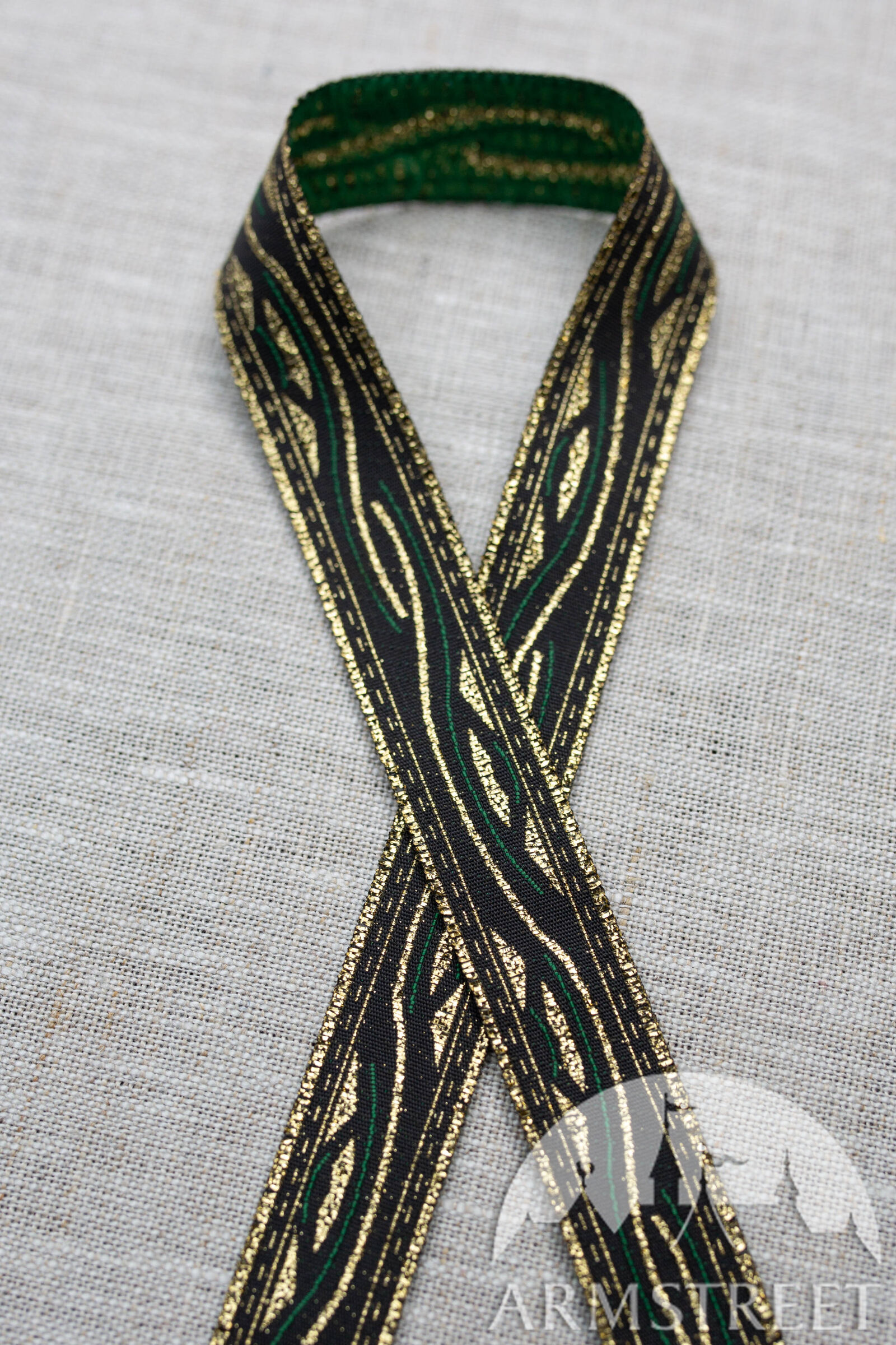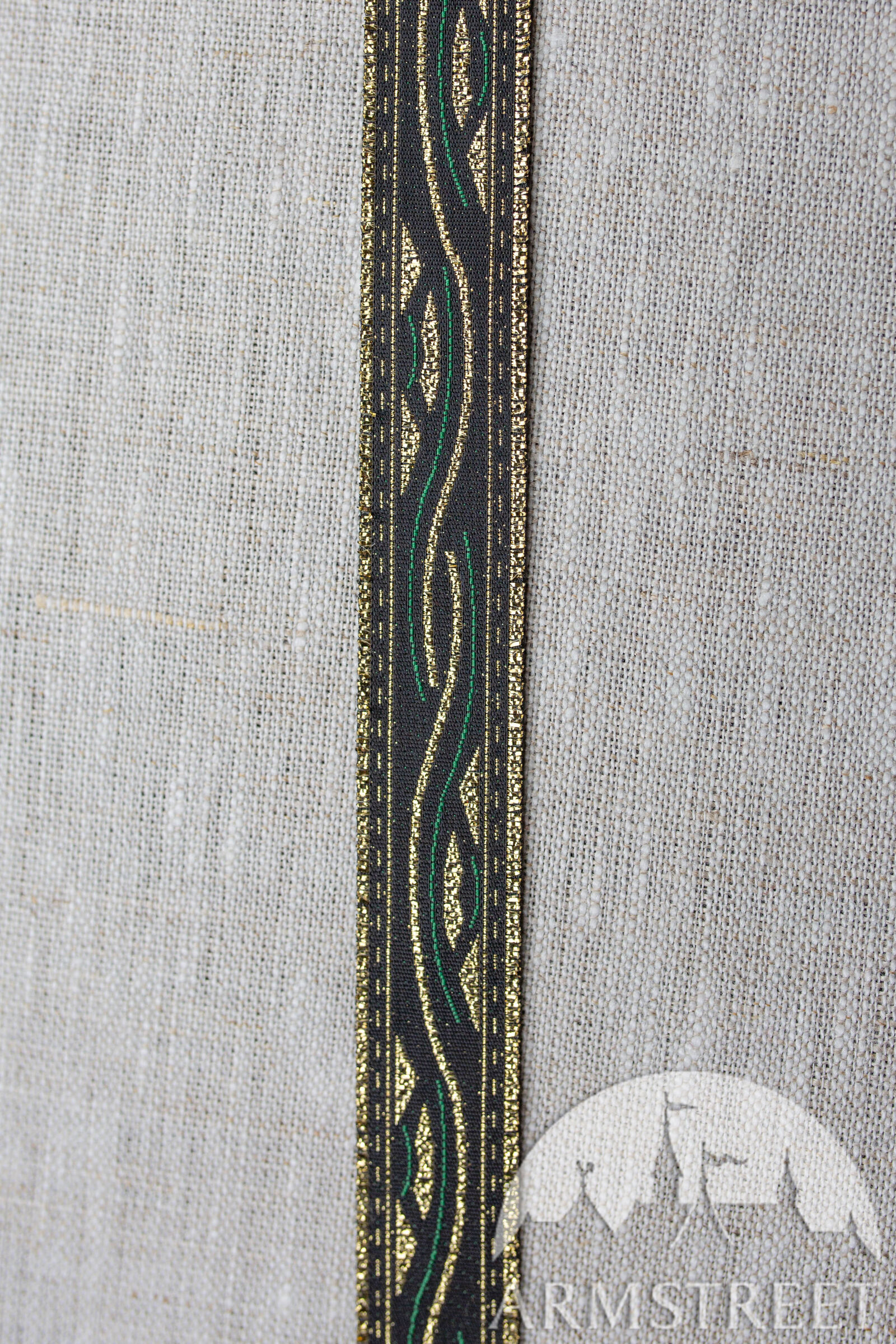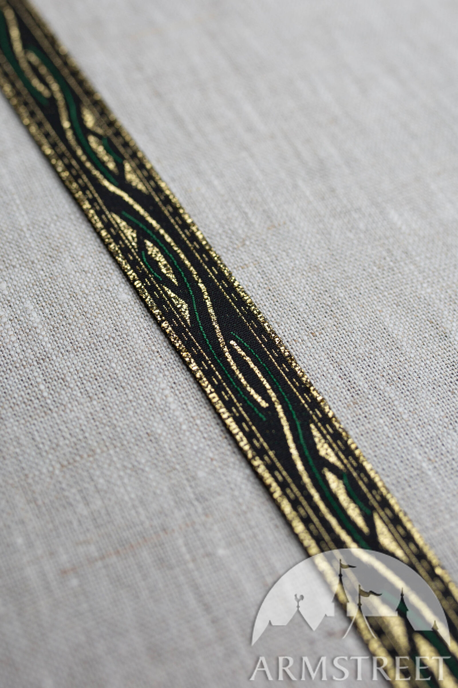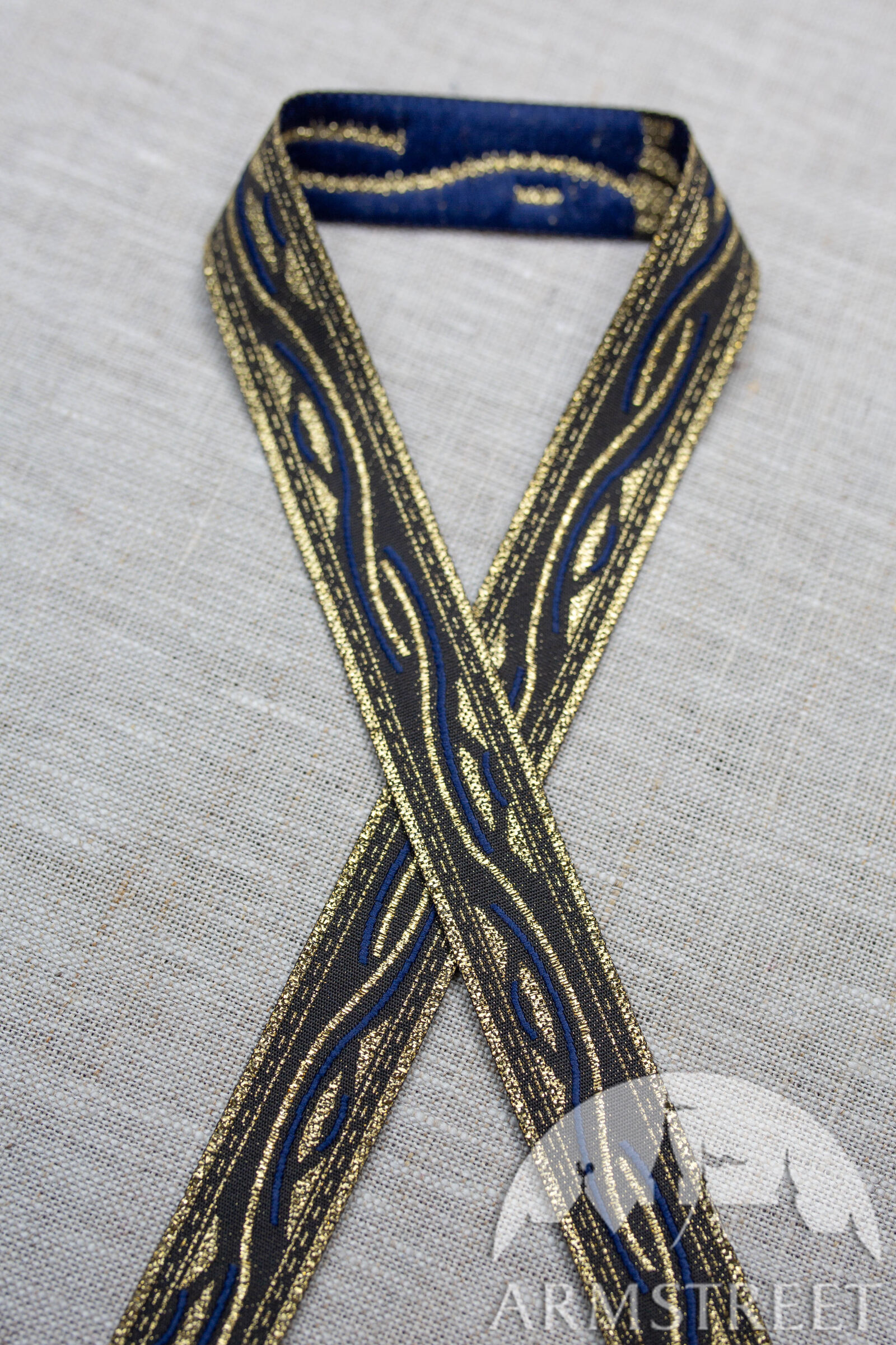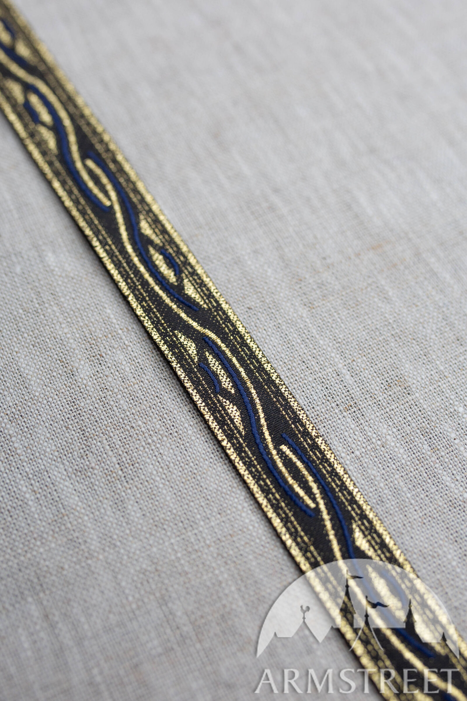 Un passement étroit avec un motif de vagues entrelacées aux accents dorés et bleus ou verts sur un fond noir pourrait être la touche finale parfaite pour votre costume médiéval DIY.