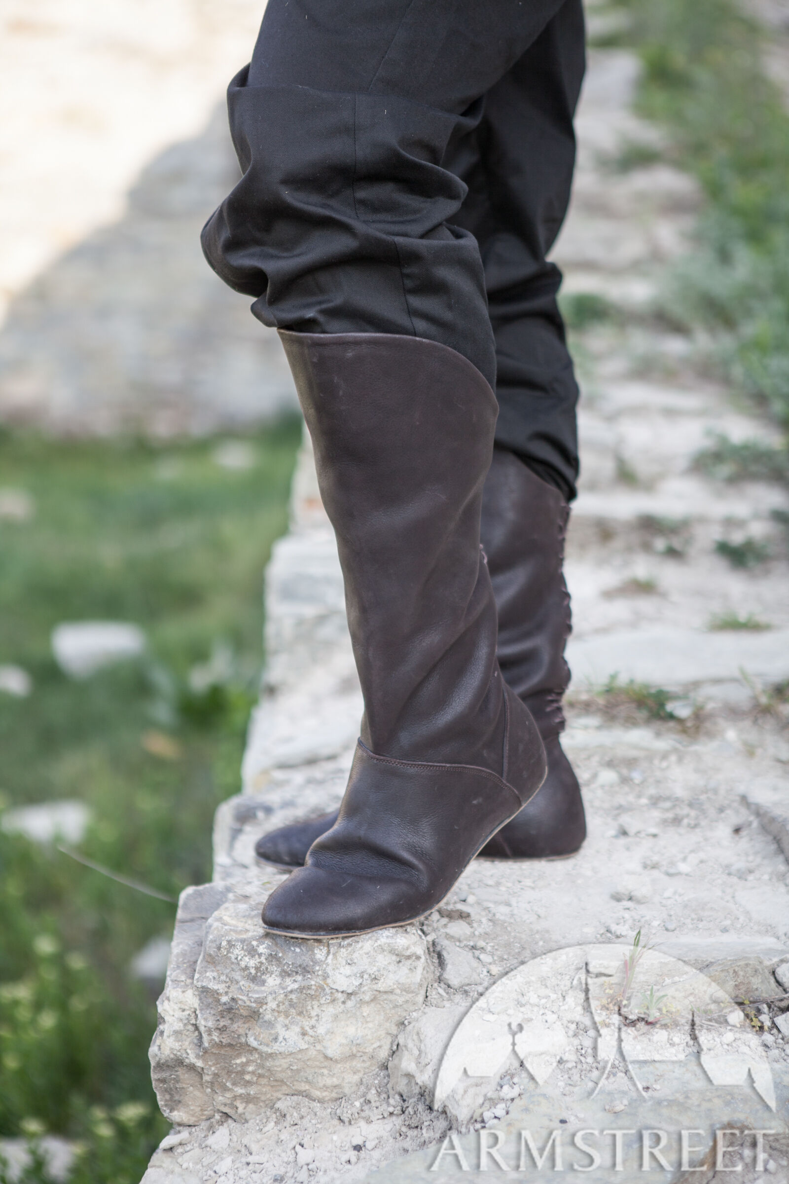 Initialement ces bottes sont une partie de notre collection « Roi de l’Est », mais elles vont convenir à toutes sortes de costumes médiévaux et de fantaisie. Les bottes sont faites de cuir naturel doux mais épais et durable avec un laçage arrière. La partie inférieure des bottes est faite de deux morceaux de cuir, recouvrant et protégeant votre orteil et talon. La partie supérieure est souple et vous permet d’ajuster la botte pour correspondre à votre caractère et le style.