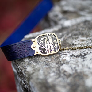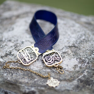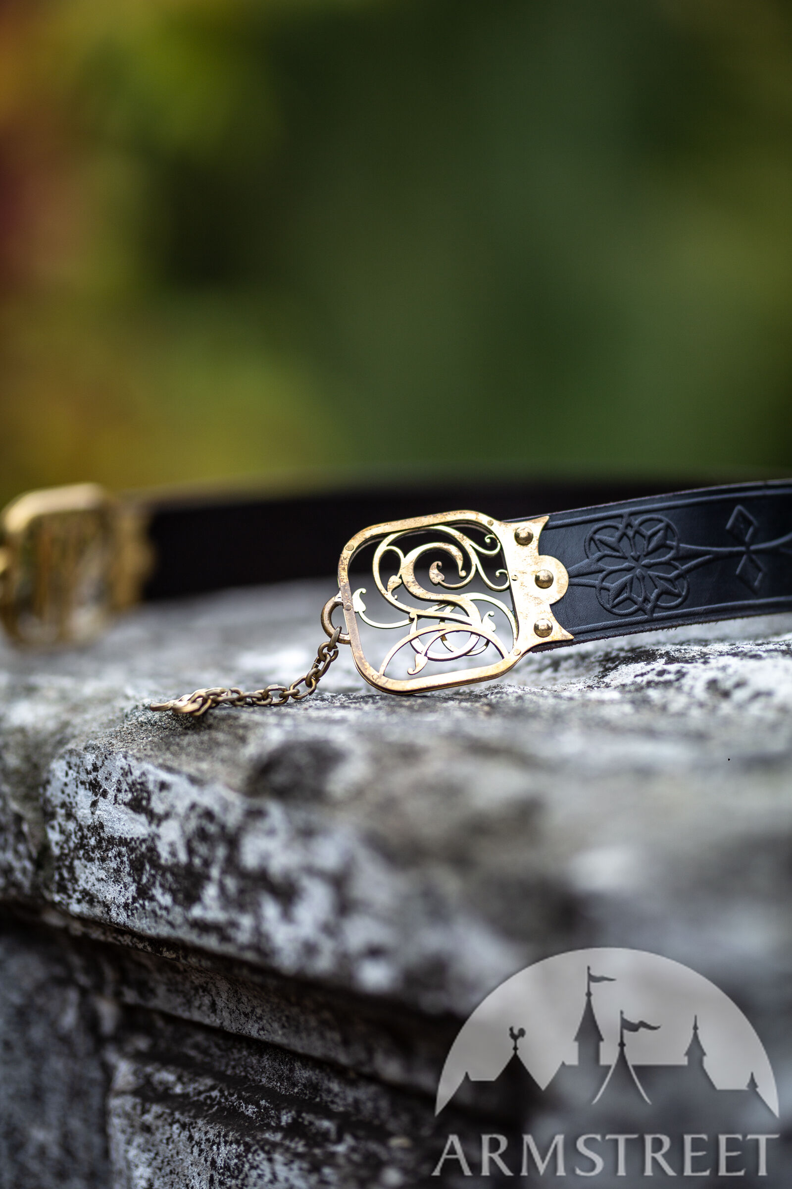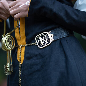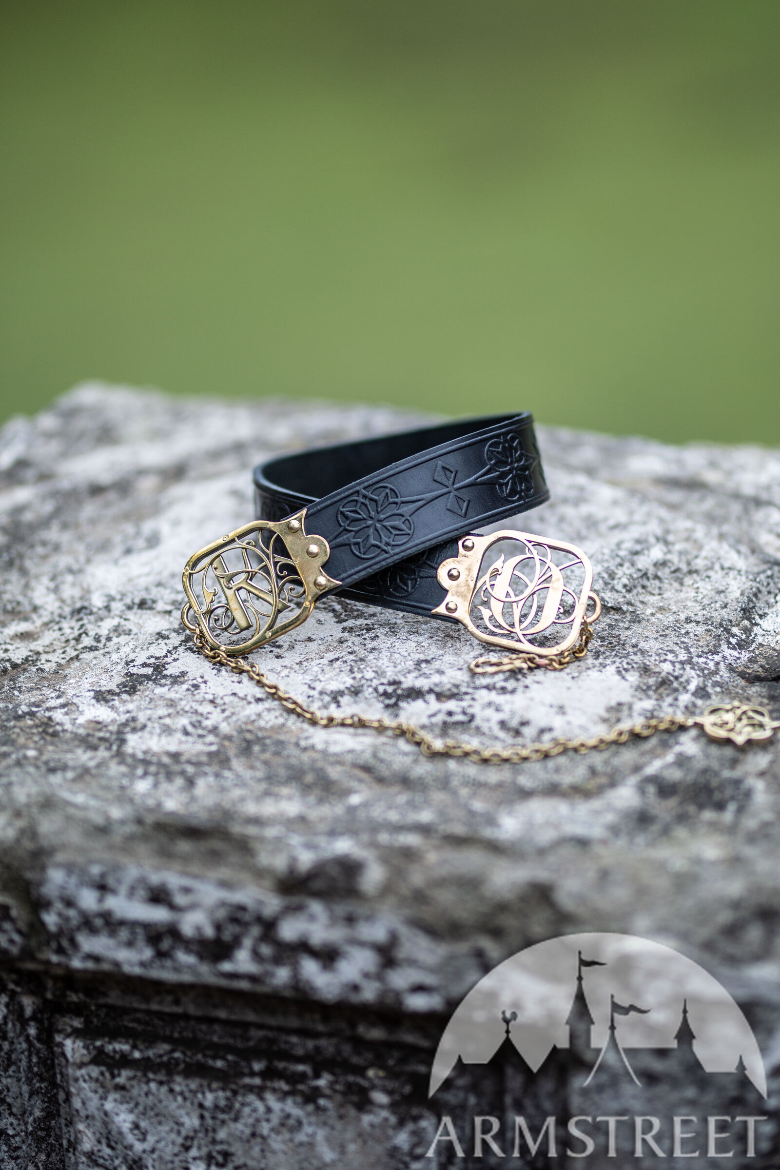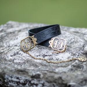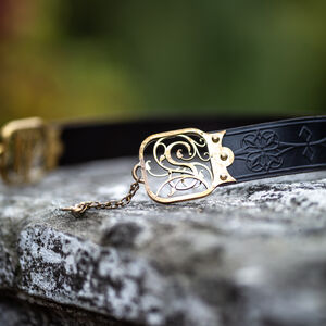 Les raccords de la ceinture sont faits de deux couches de laiton de 1.5 mm d’épaisseur découpé au laser qui sont rivetées dans le cuir. Entre les deux couches de laiton il y a une couche de cuir pour une plus grande durabilité. Chaque raccord est orné d’un magnifique motif cursif qui représente une lettre gothique à votre choix de notre alphabet latin exclusivement créé par nos designers. D’un bout de la ceinture il y a une chaîne, de l’autre un crochet qui permettent de fermer la ceinture. Cette construction permet à la ceinture d’être légèrement réglable, mais si vous la déplacez trop la chaîne ne sera plus au milieu ce qui déformera le plaisir esthétique. En bas de la chaîne il y a un petit médaillon de laiton assorti découpé au laser qui représente le même motif que le gaufrage de la ceinture.
