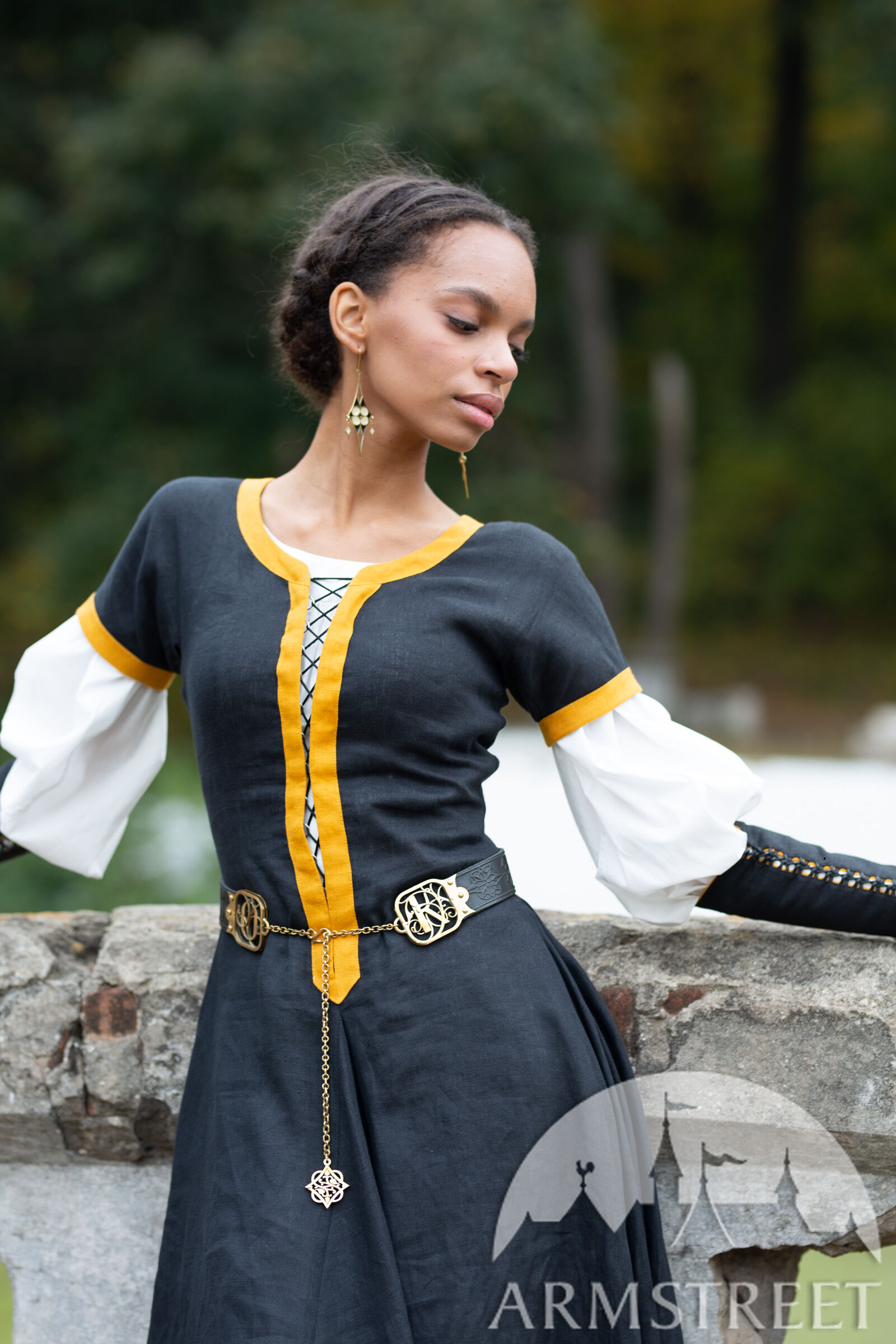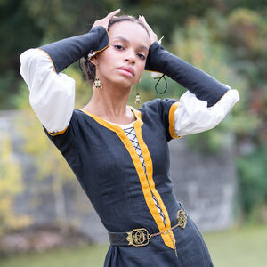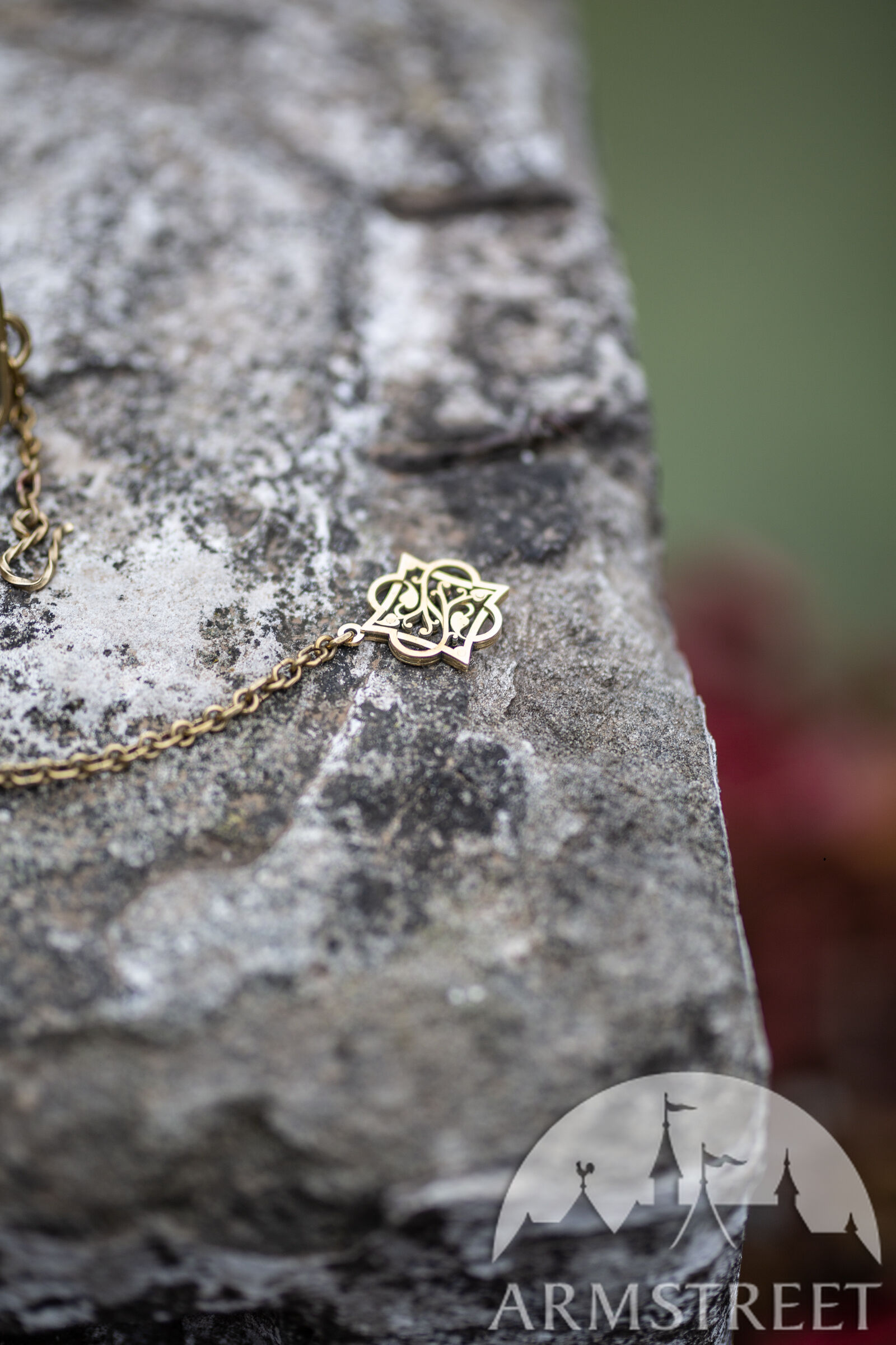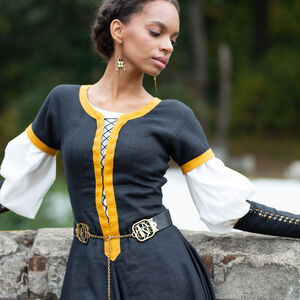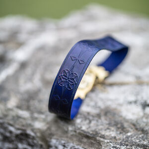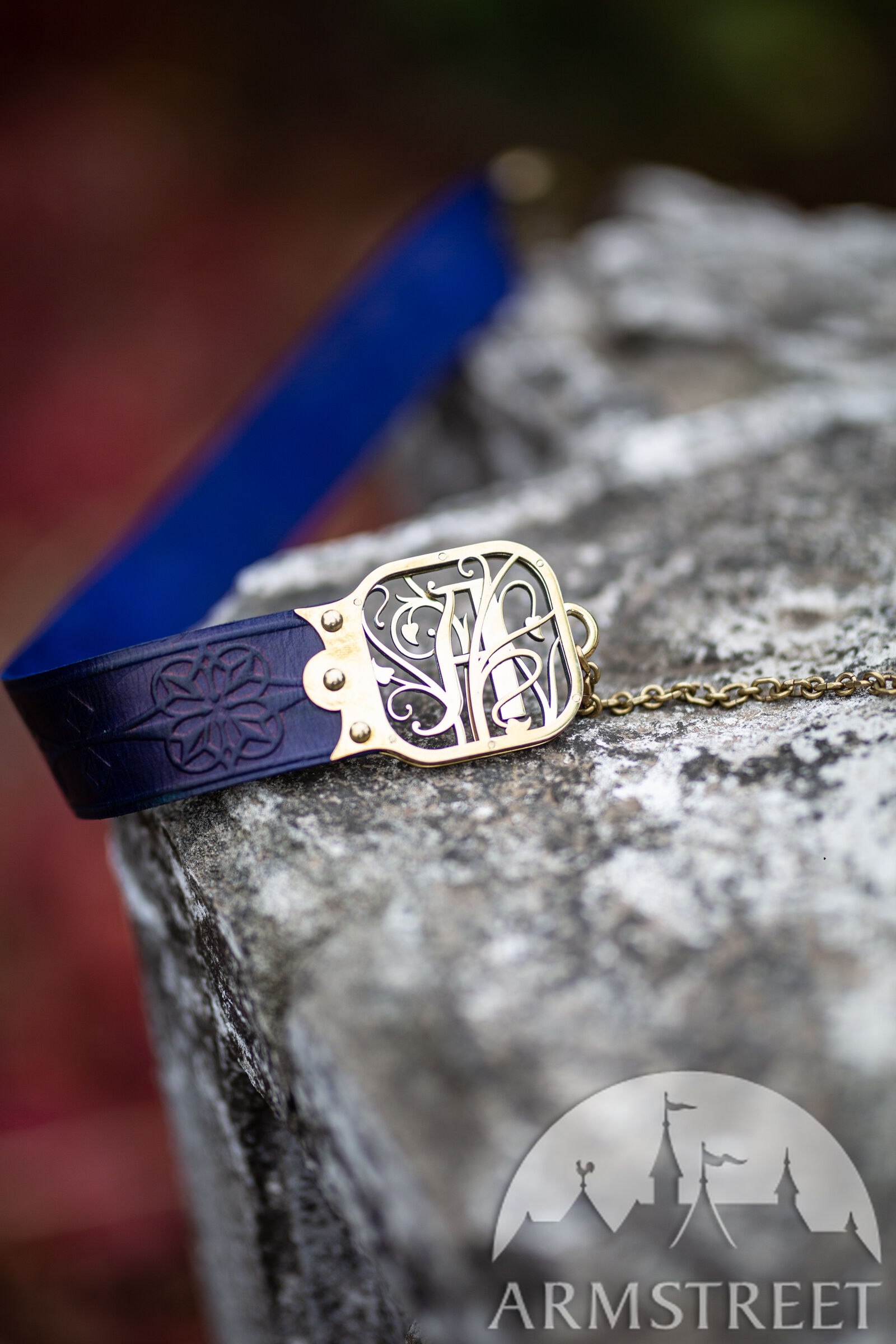 Les raccords de la ceinture sont faits de deux couches de laiton de 1.5 mm d’épaisseur découpé au laser qui sont rivetées dans le cuir. Entre les deux couches de laiton il y a une couche de cuir pour une plus grande durabilité. Chaque raccord est orné d’un magnifique motif cursif qui représente une lettre gothique à votre choix de notre alphabet latin exclusivement créé par nos designers. D’un bout de la ceinture il y a une chaîne, de l’autre un crochet qui permettent de fermer la ceinture. Cette construction permet à la ceinture d’être légèrement réglable, mais si vous la déplacez trop la chaîne ne sera plus au milieu ce qui déformera le plaisir esthétique. En bas de la chaîne il y a un petit médaillon de laiton assorti découpé au laser qui représente le même motif que le gaufrage de la ceinture.
