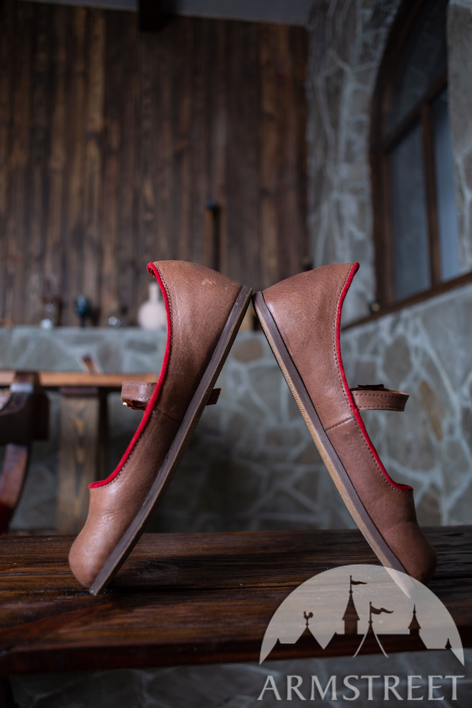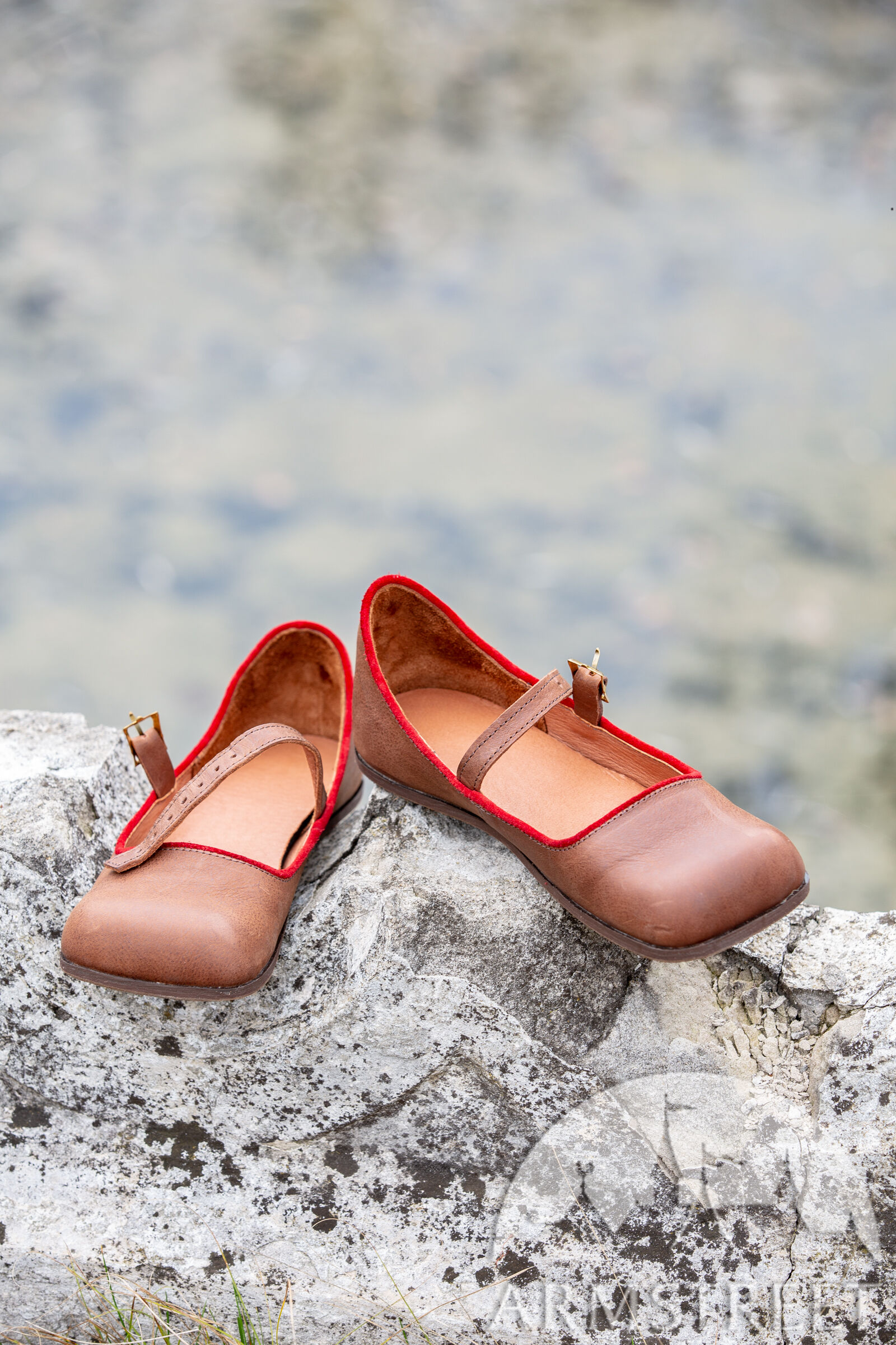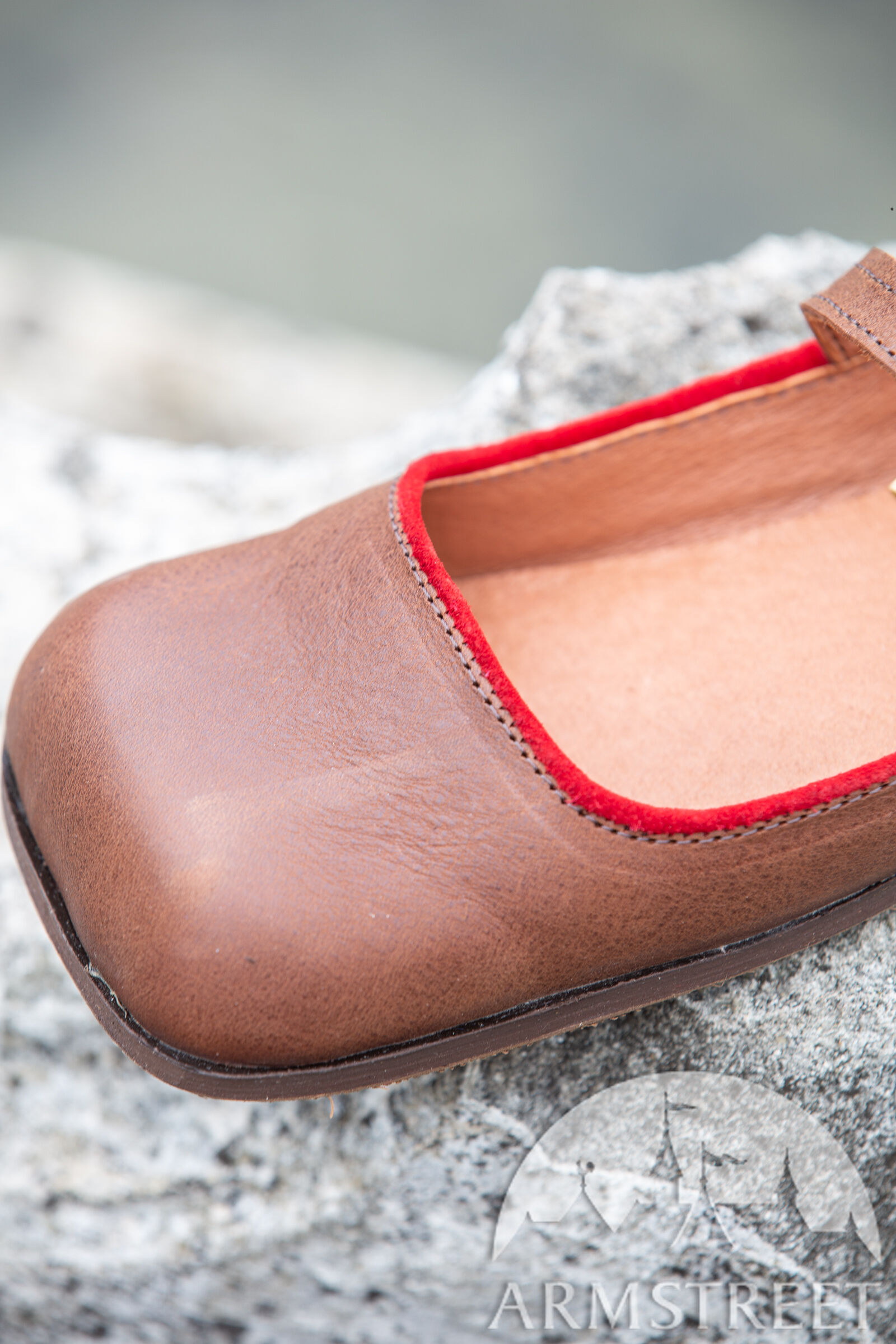 Ces chaussures ont un air médiéval mais elles se distinguent par les aspects du confort moderne. Notre chef cordonnier a fait de grands efforts pour aboutir au résultat qui ressemble les chaussures médiévales mais qui ne sont pas tout à fait plates. C’est là que réside la différence fondamentale entre les chaussures modernes et médiévales : les modèles moyenâgeux étaient pour la plupart complètement plats dépourvus de tout talon.