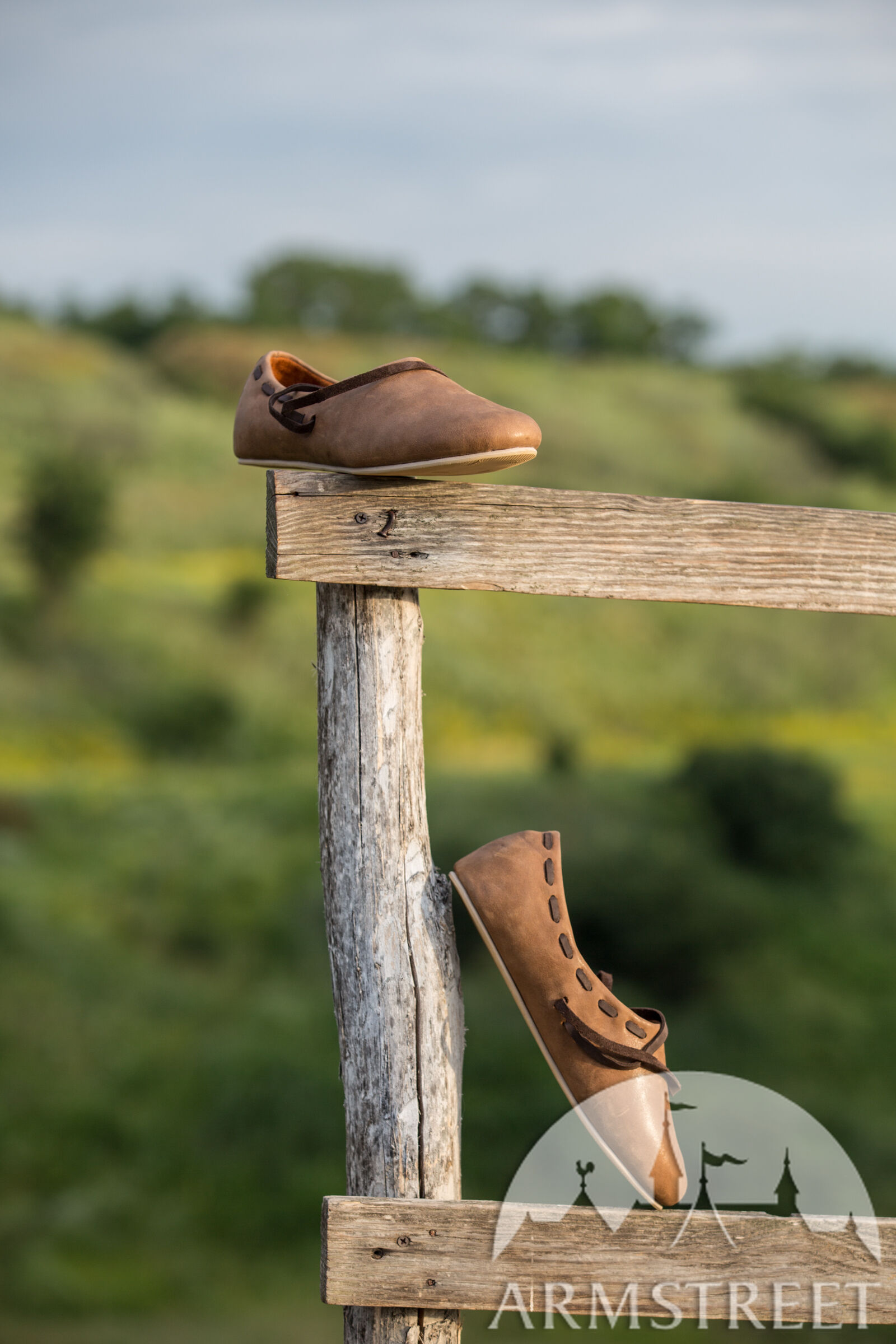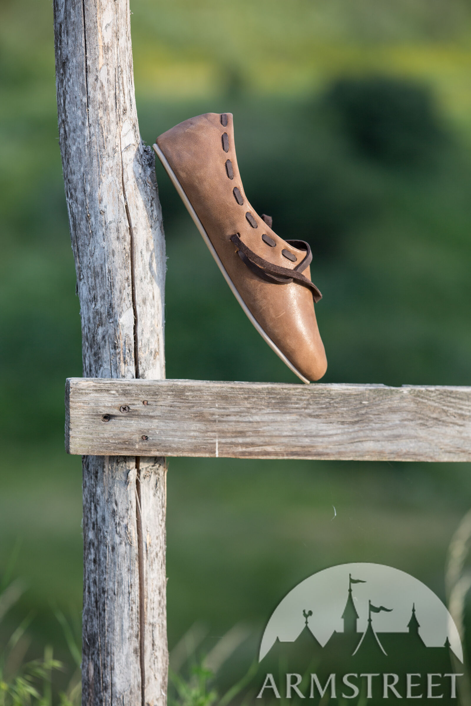 Pour créer ce modèle, on s’est inspiré par l’imagerie du XVème siècle. Par contre, ce type de chaussures était aussi répandu au Moyen- ge, que vous pouvez certainement les porter avec toute tenue style médiéval. Nous tirons une grande fierté du fait, qu’on est expert en cordonnerie. Nous avons déployé de grands efforts pour fusionner l’aspect de l'époque médiévale et le confort moderne. La semelle extérieure est faite de , mais couvert de la couche quasi invisible de caoutchouc de protection. Le talon orthopédique fait une différence énorme en termes de confort et santé.