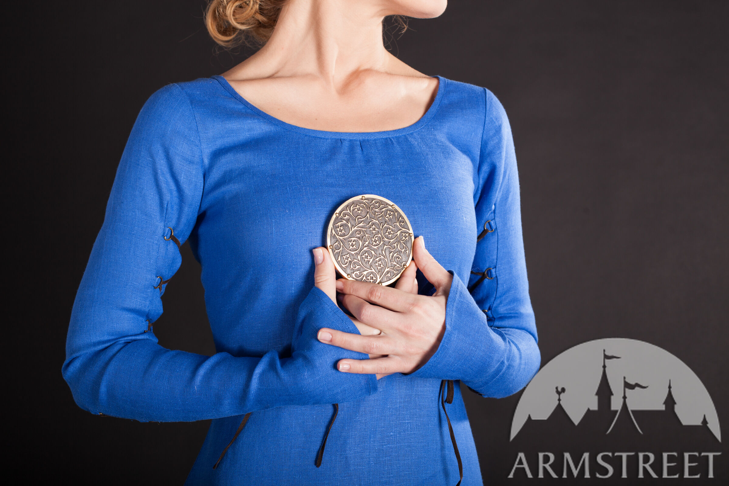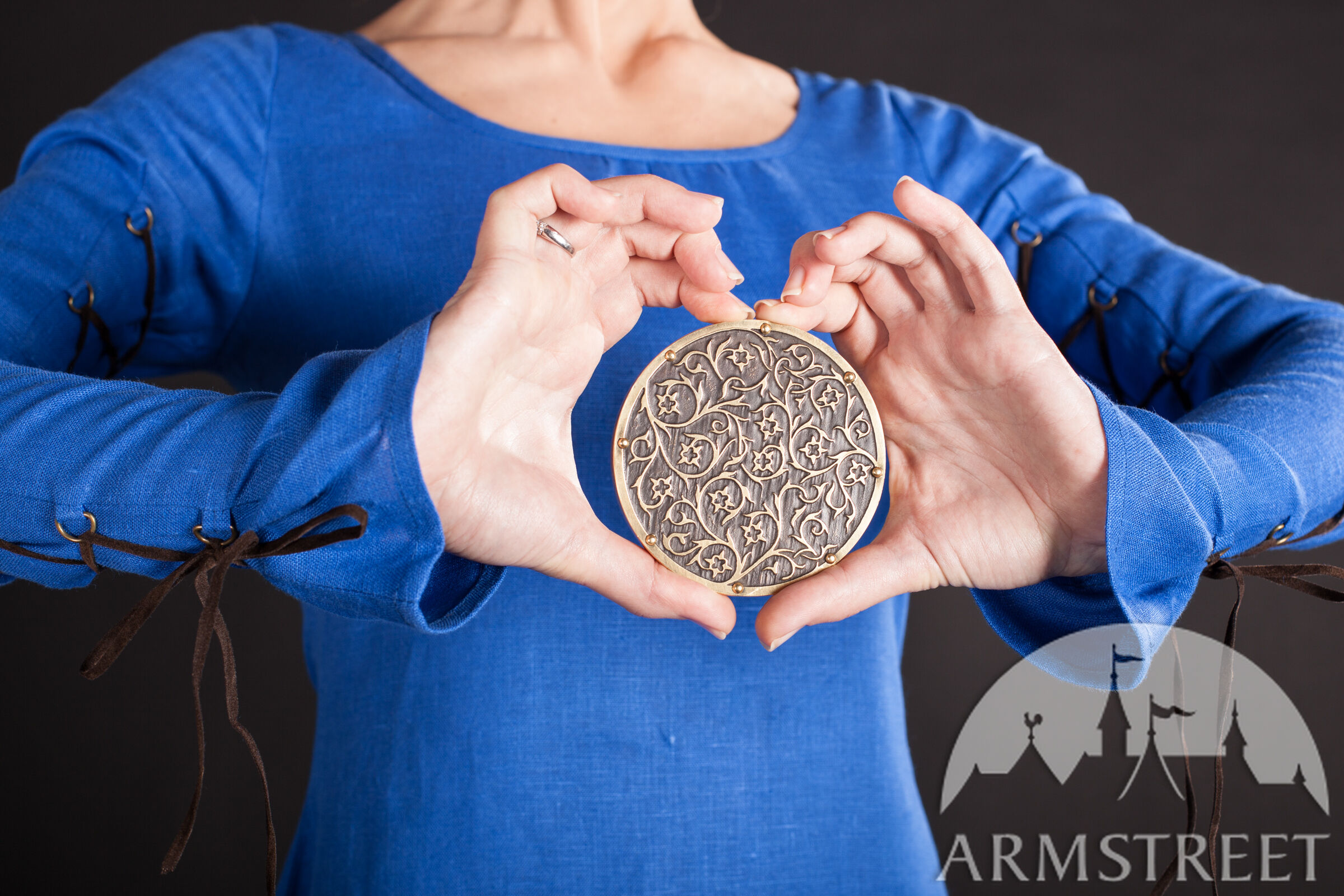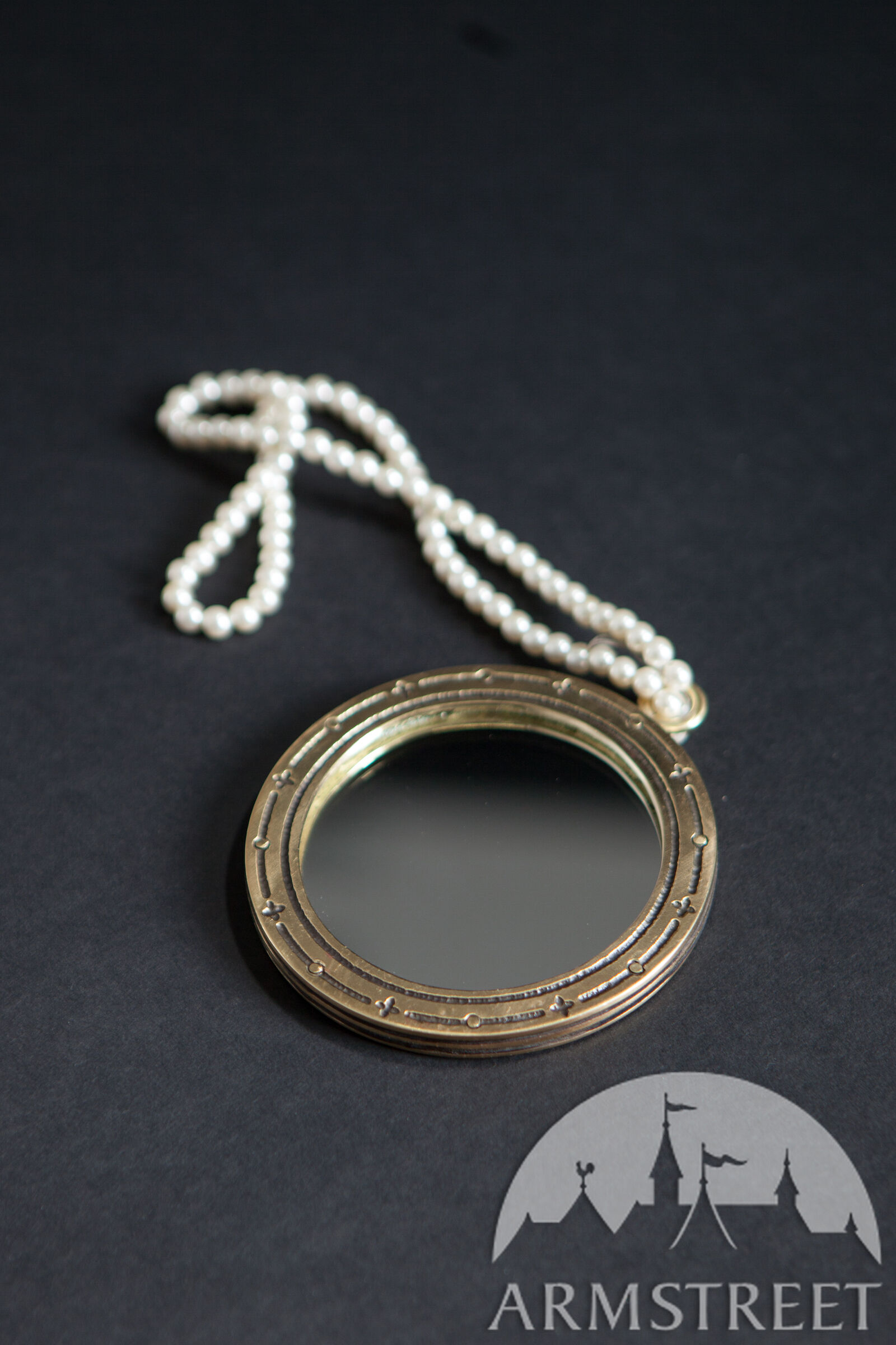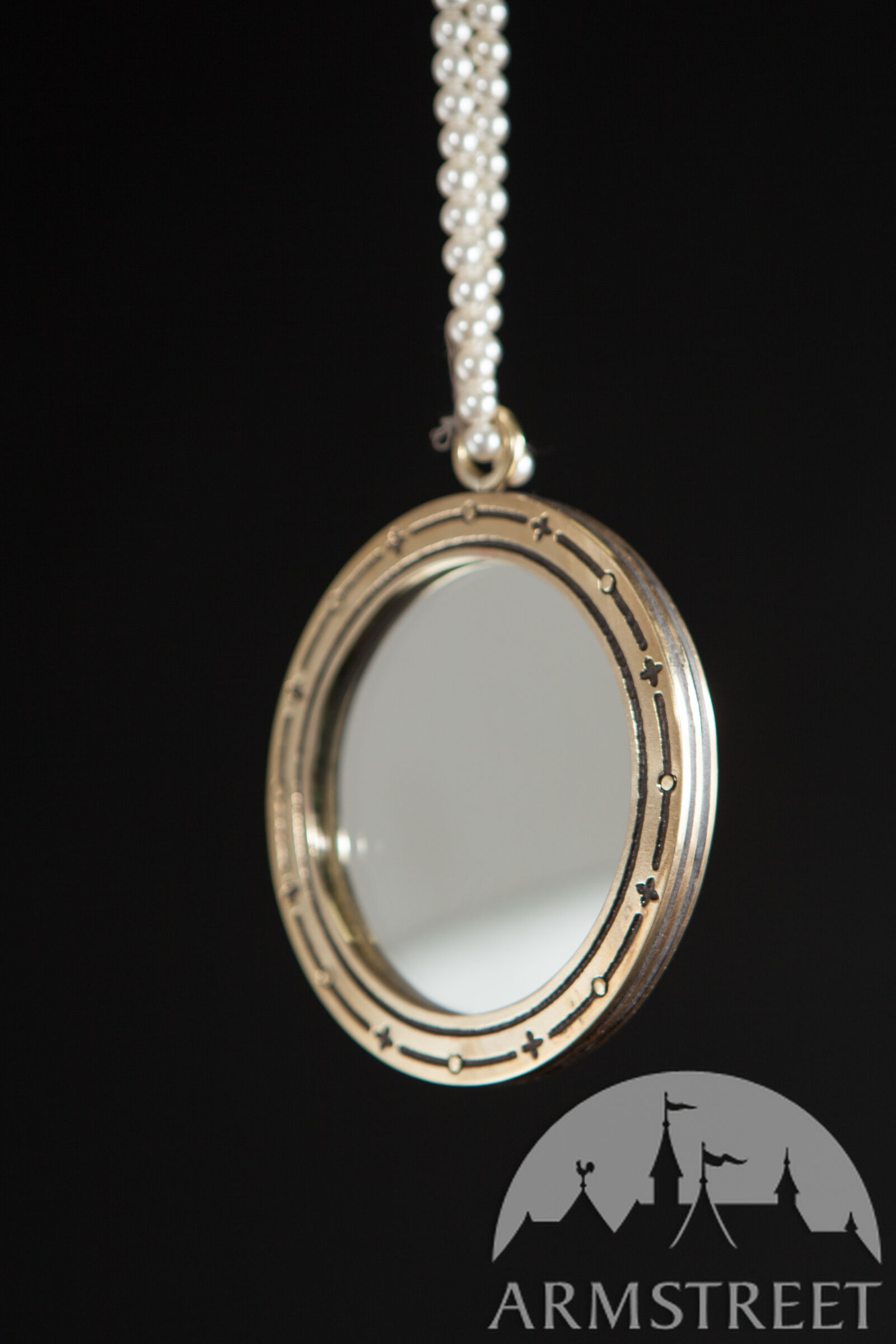 Le verso de miroir est décoré de l’image de licorne couché parmi les fleurs. La princesse sait ce qui est le licorne, parce qu’elle l’a vu dans ses rêves ! Le noircissement de laiton donne au miroir le look sophistiqué. Le petit anneau par-dessus permet de passer un lacet et porter le miroir sur la ceinture. C’est facile d’imaginer cette pierre précieuse d’accessoir sur le boudoir de princesse. Il peut être votre miroir de vanité ou vous accompagner en voyages aux médiévales.