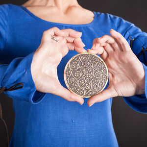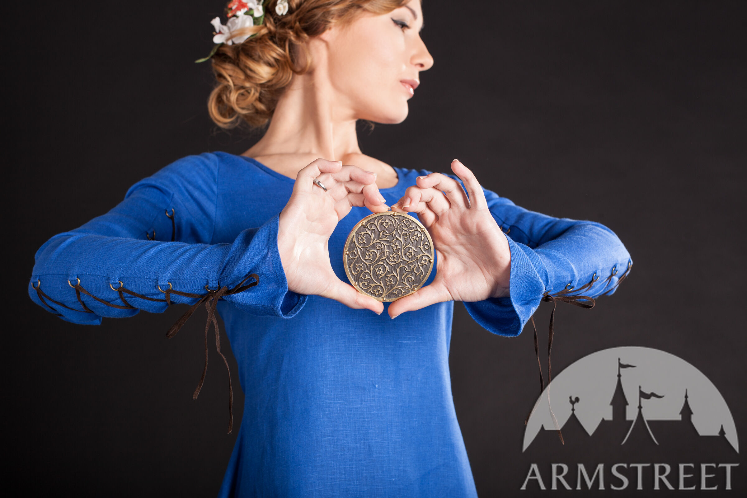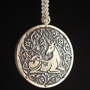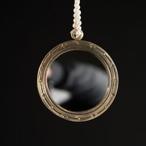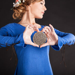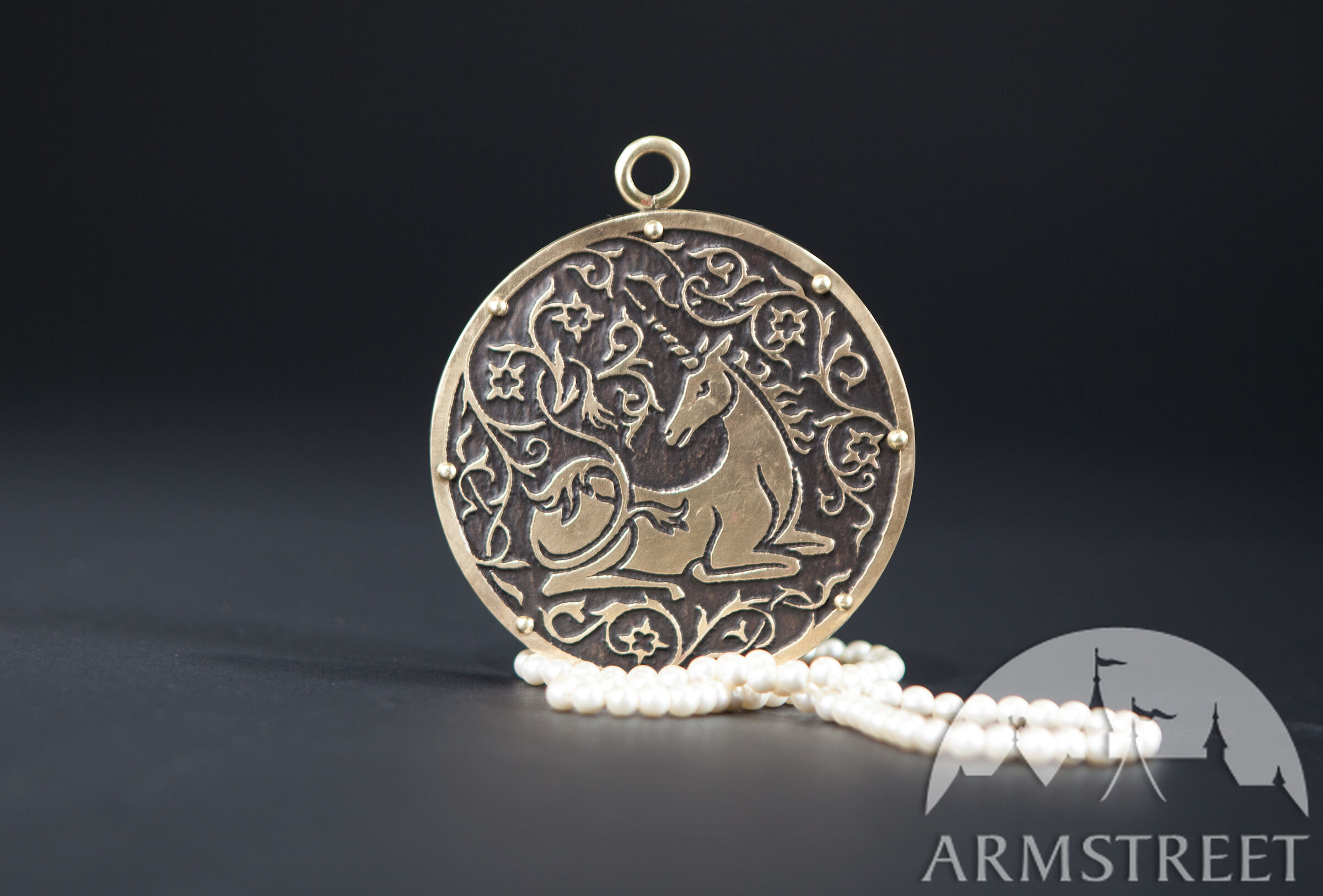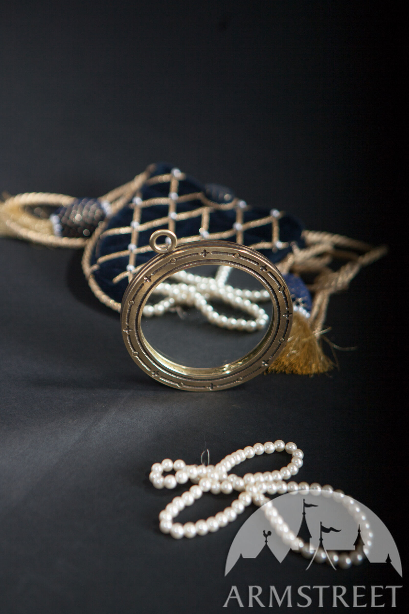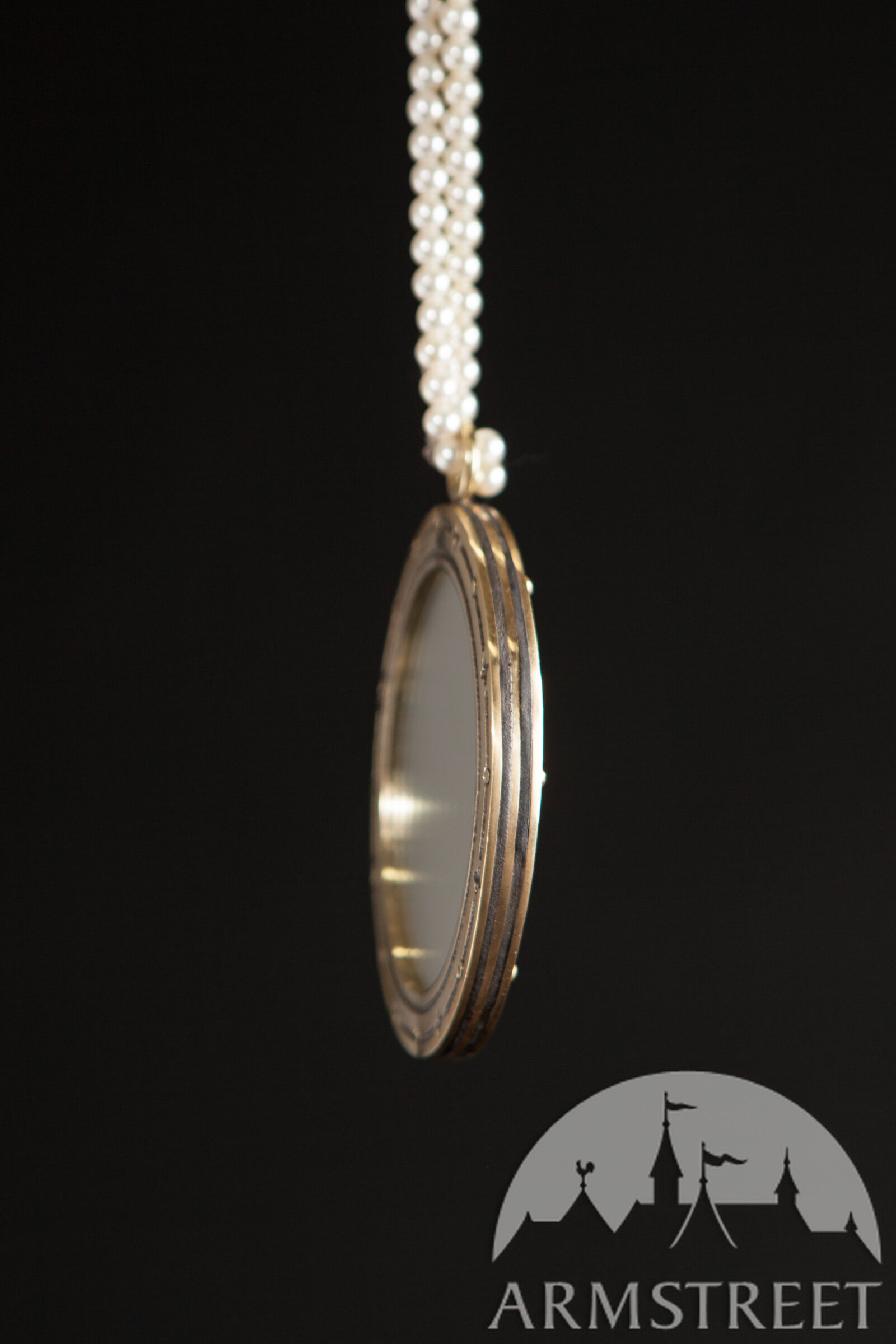 Le verso de miroir est décoré de l’image de licorne couché parmi les fleurs. La princesse sait ce qui est le licorne, parce qu’elle l’a vu dans ses rêves ! Le noircissement de laiton donne au miroir le look sophistiqué. Le petit anneau par-dessus permet de passer un lacet et porter le miroir sur la ceinture. C’est facile d’imaginer cette pierre précieuse d’accessoir sur le boudoir de princesse. Il peut être votre miroir de vanité ou vous accompagner en voyages aux médiévales.