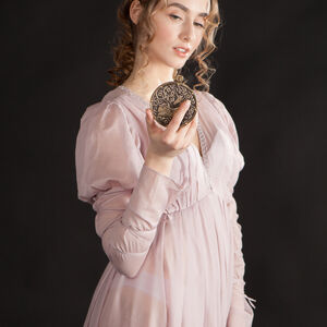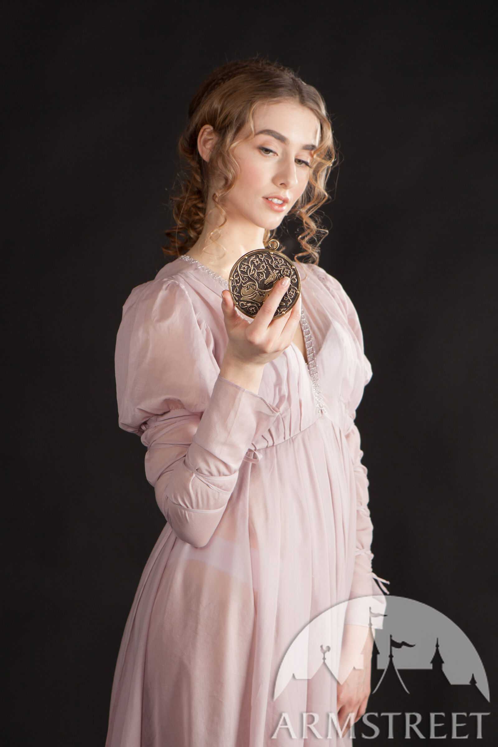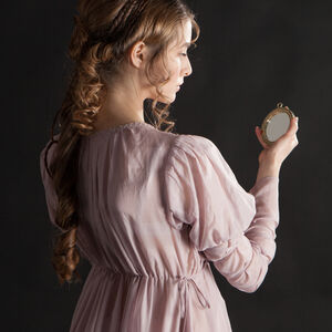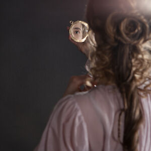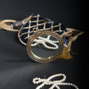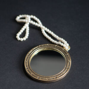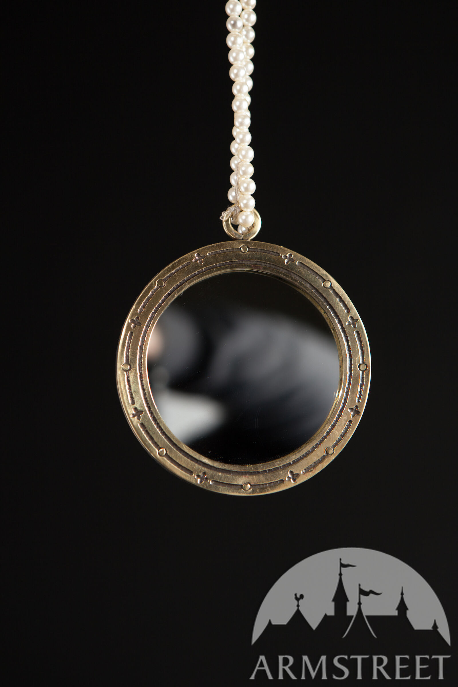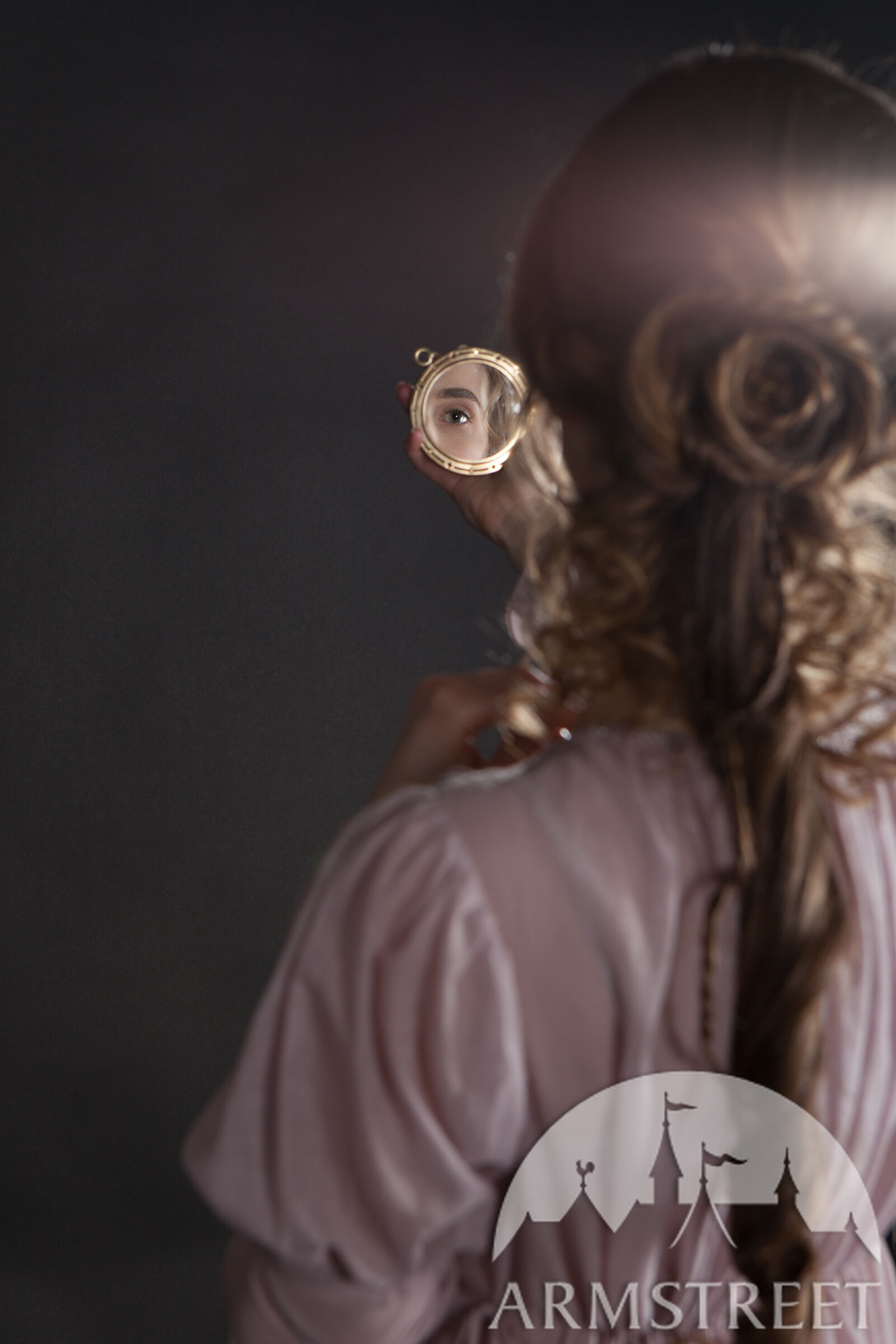 Que c’est beau, ce boudoir médiéval ! Il garde fidèlement tous les secrets de princesses – et les choses les plus nécessaires : peignes en ivoire, parfums et bien sur Son Majesté le Miroir. Mais même quand la Princesse quitte la chambre, elle veut rester assurée qu’elle est toute belle grâce à son miroir de poche.