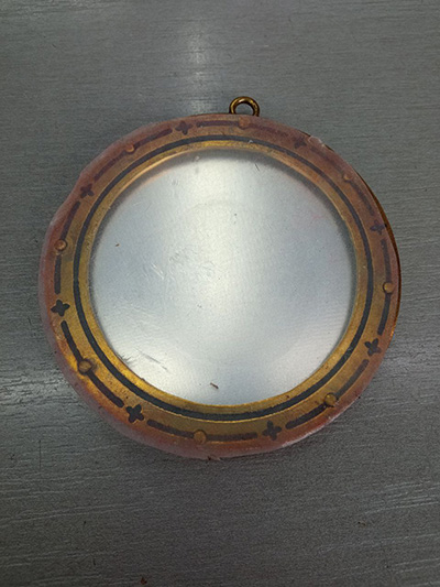Nous avons confectionnés ce miroir inspirés par le jour de la St. Valentin. Le miroir est vissé dans un boîtier métallique rond et fixé avec huit rivets en laiton. Le miroir est clair et reflète les chose d’une façon fidèle. Son diamètre est de 9 cm. Les lignes de contour sont décorés de petits motifs. Il y a trois couches de laiton, incrustés par deux couches de cuir sombre pareilles à la couleur noircie de laiton.