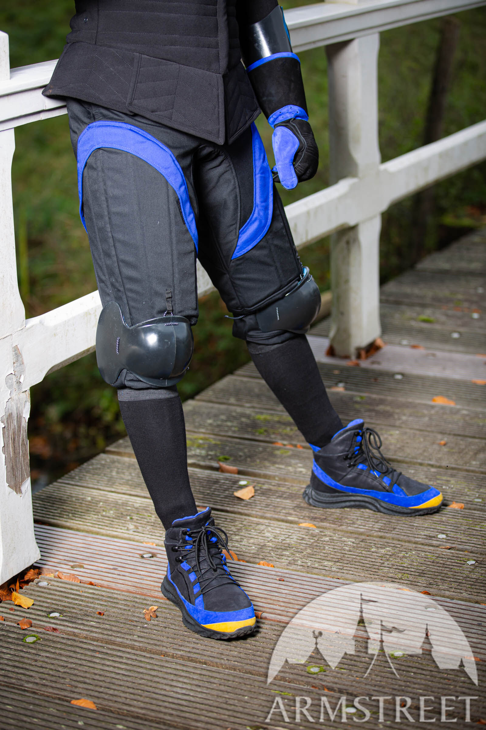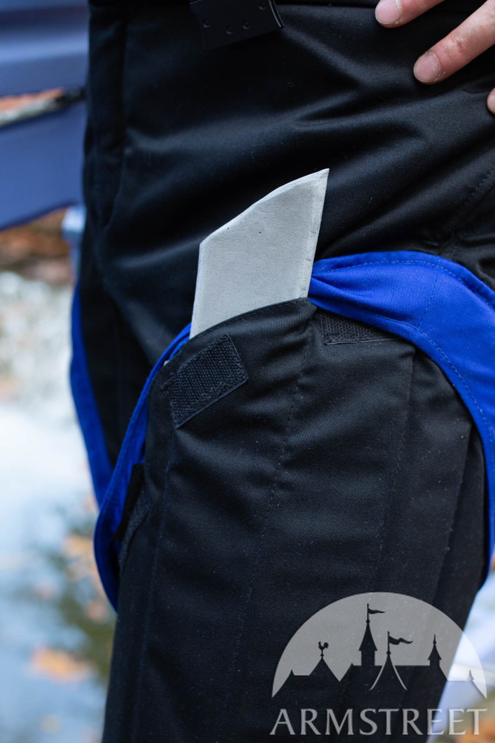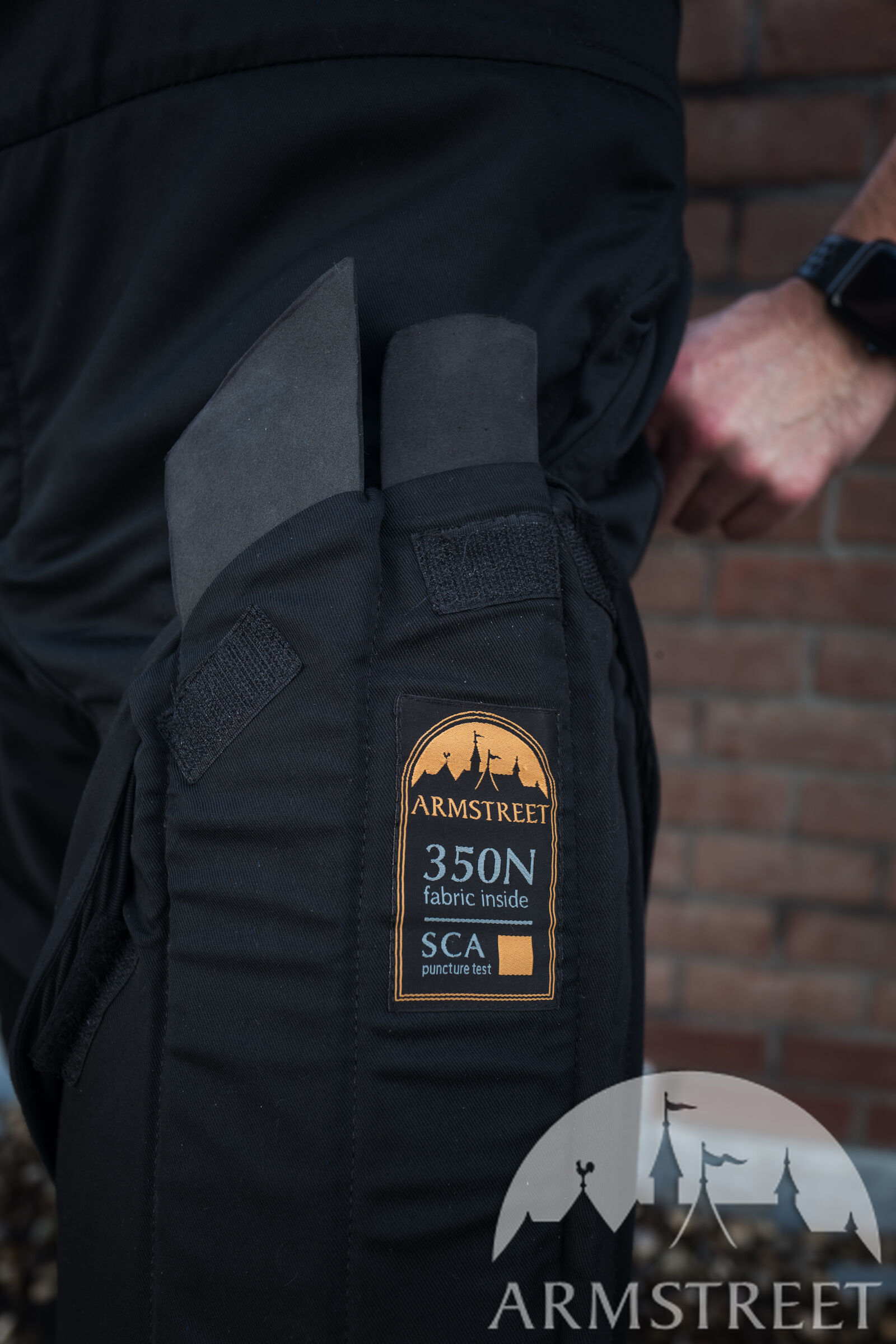 Protection. Un équilibre raisonnable entre flexibilité et protection est généralement l’objectif principal de tout fabricant d’équipement – nous sommes allés encore plus loin et avons réuni les deux sans faire de compromis. Issues de notre expérience en matière de fabrication d'armures, les poches externes couvrent la majeure partie de la zone des cuisses, avec des sections remplies de plaques EVA. Ces plaques offrent déjà une protection supplémentaire essentielle mais peuvent également être retirées pour des disciplines de contact plus légères comme les petites épées ou la rapière légère. Elles peuvent être remplacées par des plaques plus dures si vous souhaitez encore plus de protection pour l'épée longue à contact complet et le sabre lourd. Nos échantillons de test ont déjà participé à une douzaine d'événements internationaux et ont participé à plusieurs finales au sabre et à l'épée longue. Nous sommes donc satisfaits des commentaires et des performances. La construction de ce pantalon comprend une couche de tissu classé 350N à l'intérieur.