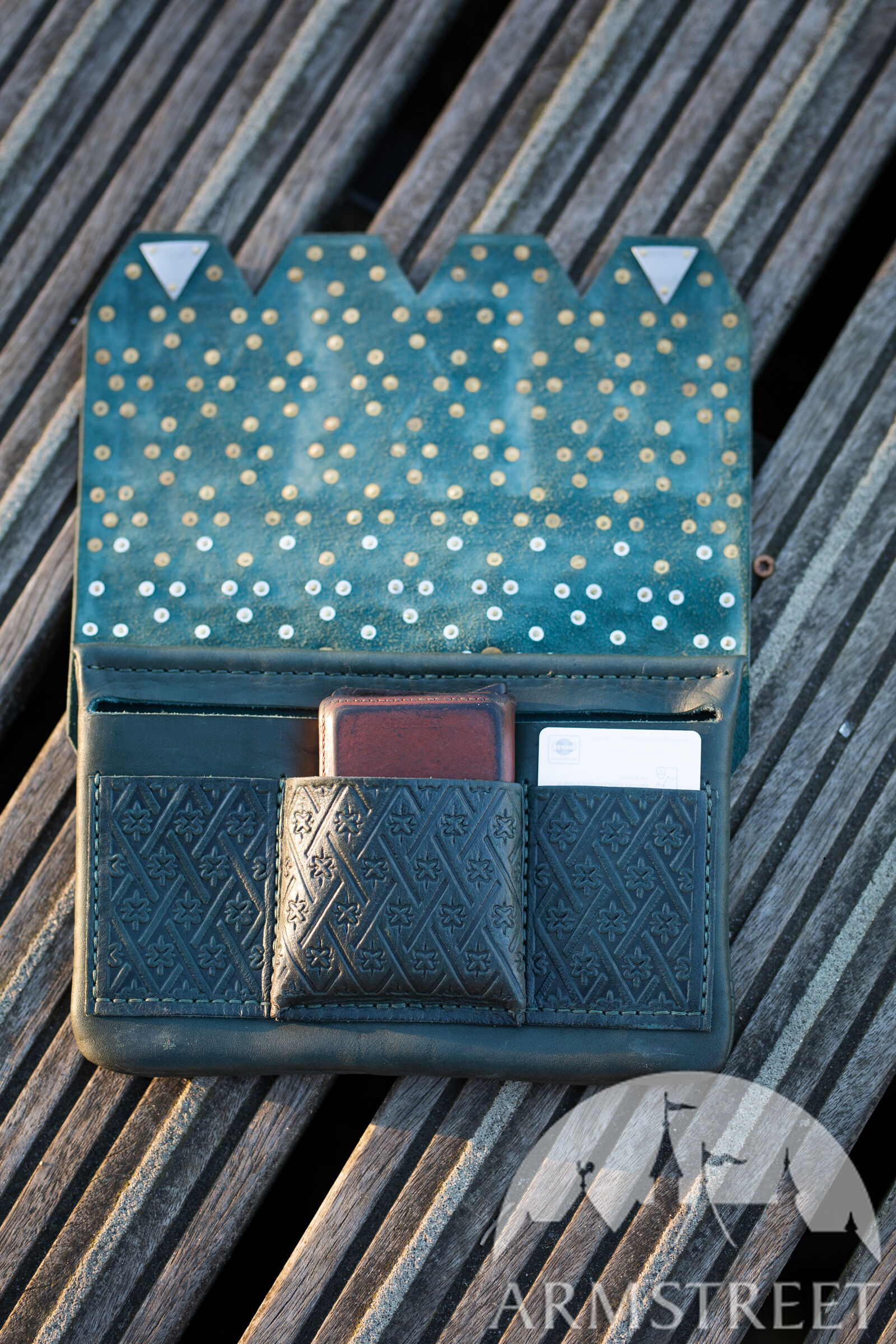 Le rabat de devant est généreusement décoré de nombreuses montures de laiton gravées de motif original. Elles sont complétées d’un dessin gaufré assorti et d’un nombre de rivets en laiton qui sont fonctionnels et en même temps très jolis ! La pochette est attachée à la ceinture à l’aide de deux jolis crochets en laiton.