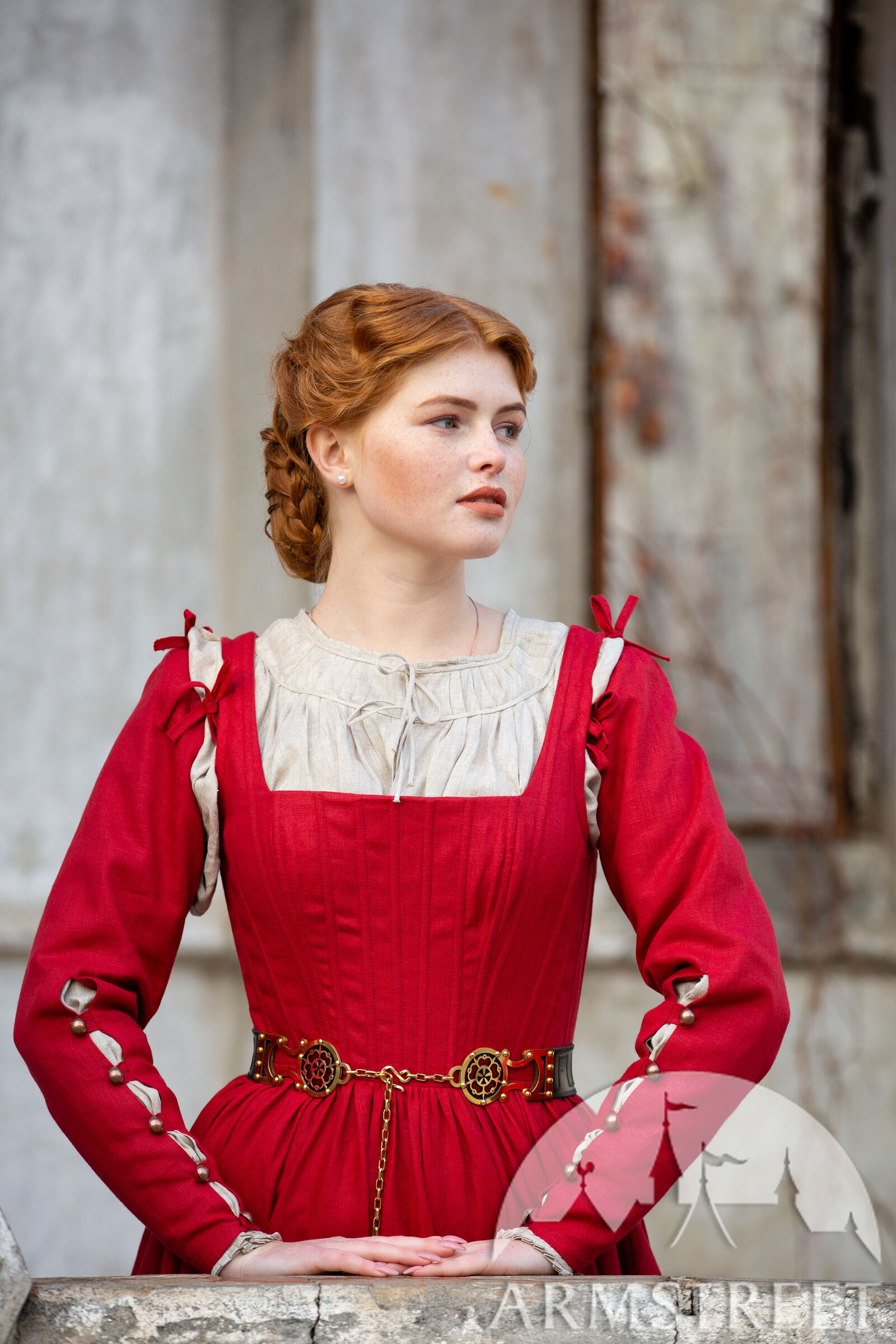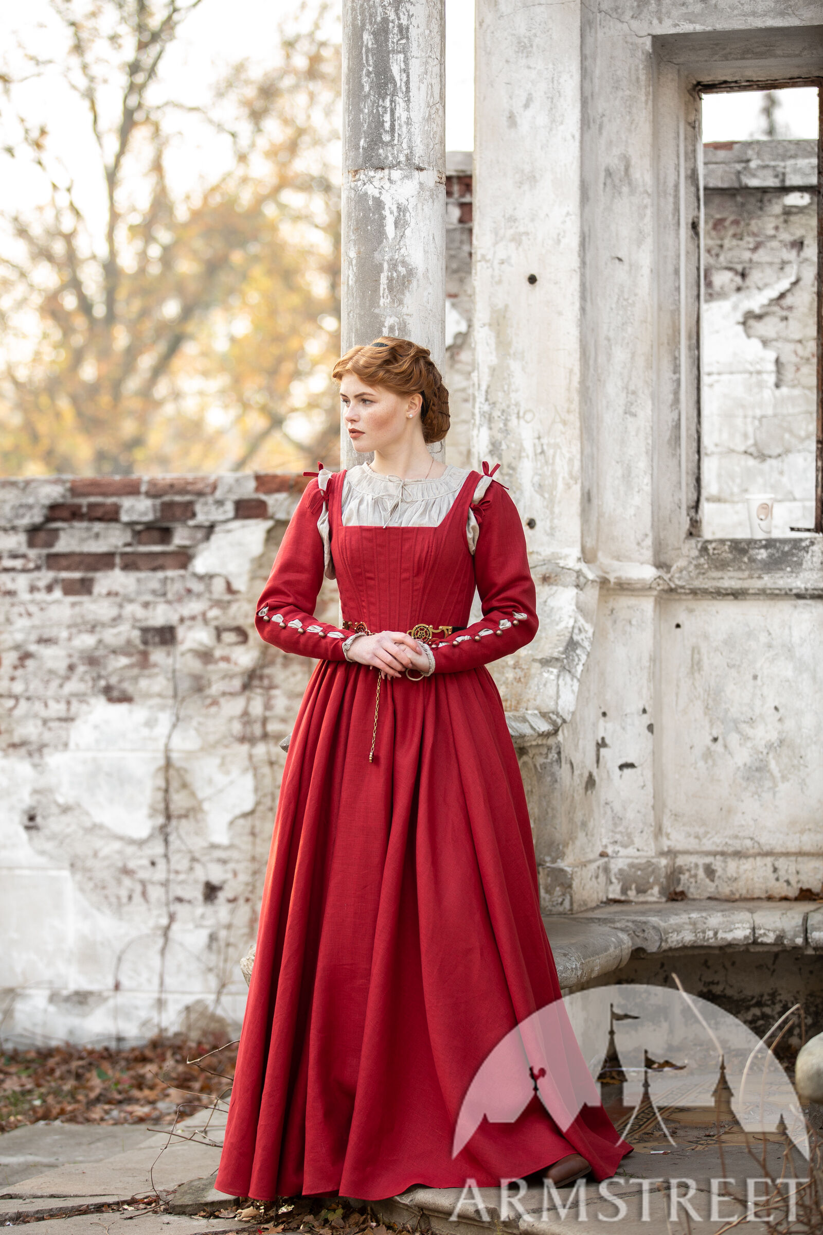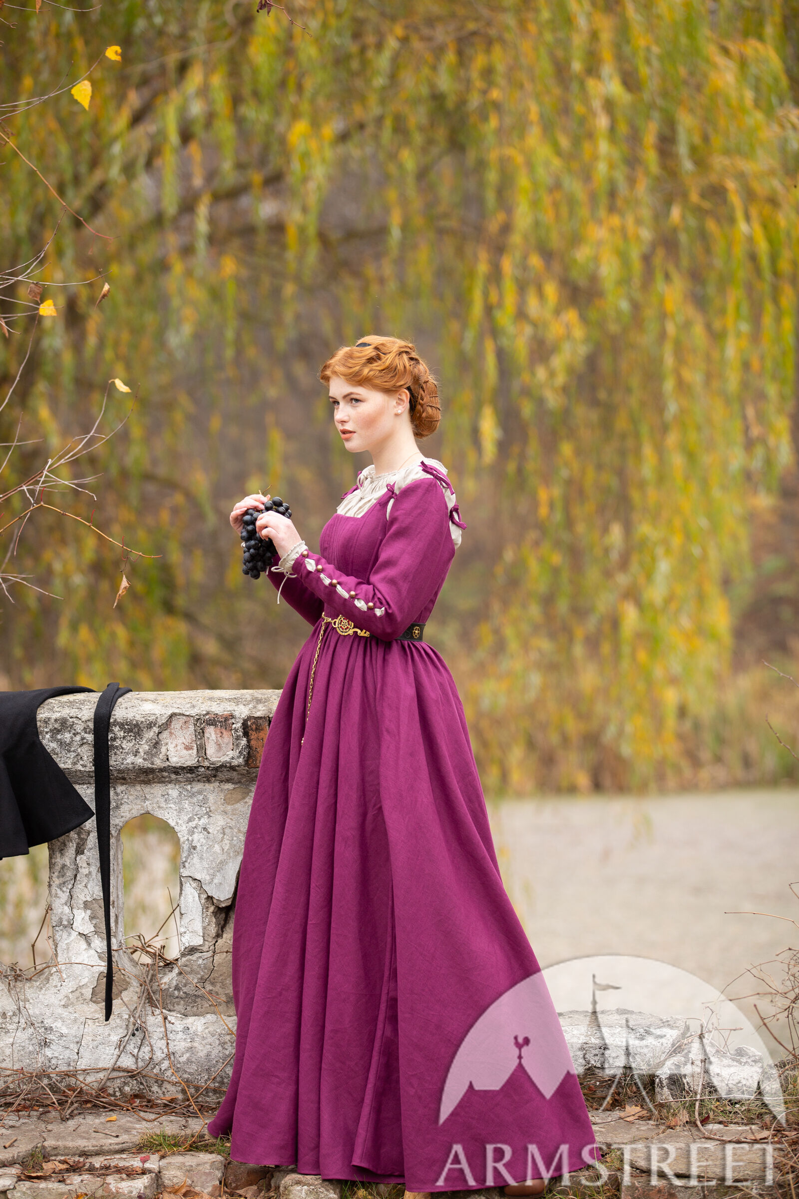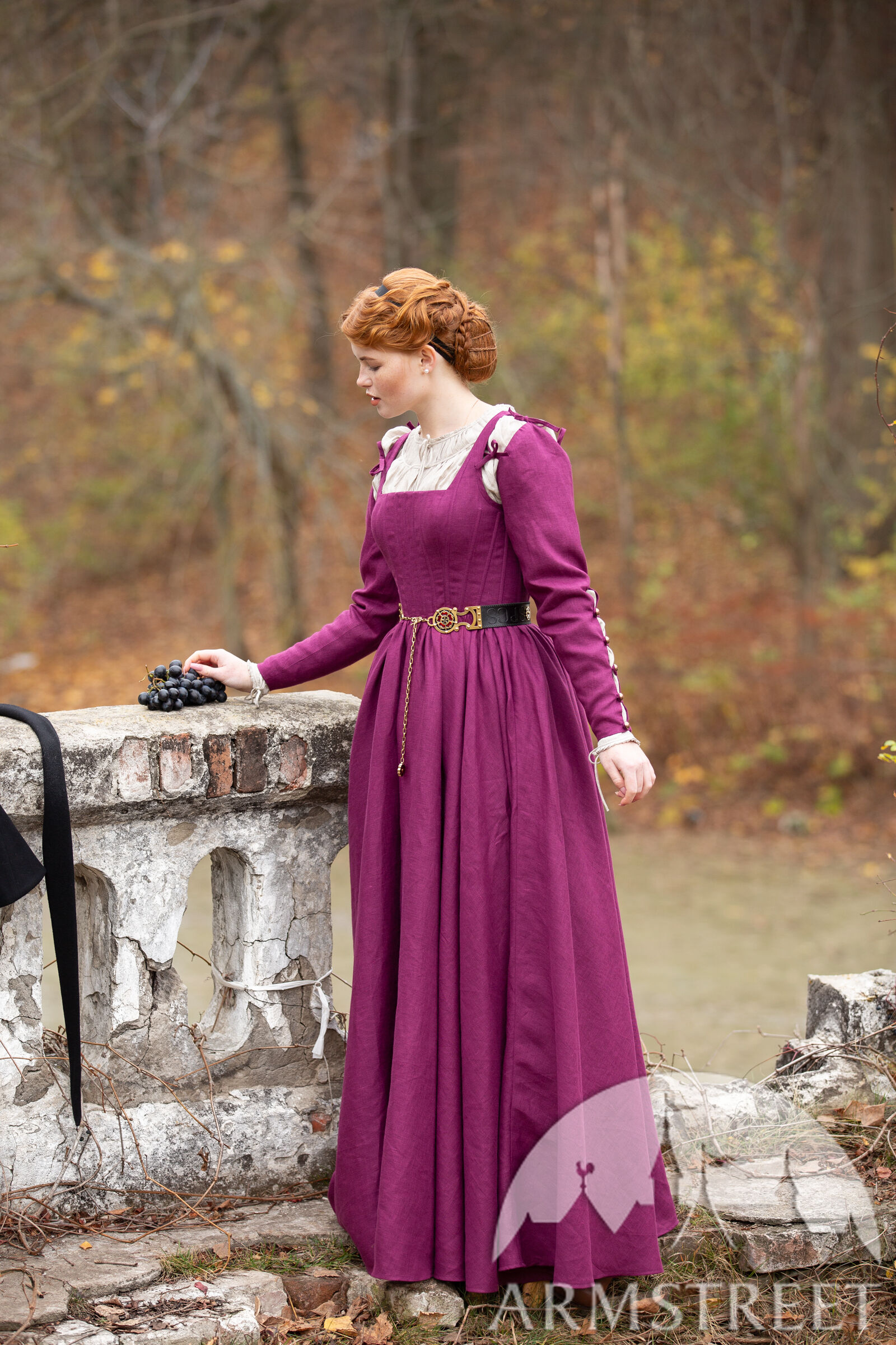 Cette robe a été largement inspirée par le 16e siècle notamment par les tableaux de Woensam. Nous avons constaté l’évolution des tenues basiques de XIV-XV s., elles sont devenues plus structurées avec une ligne de taille plus remontée. Ce type de vêtements seraient portés par une femme de milieu supérieur puisqu’il est difficile de serrer le laçage sur le dos soi-même alors elle a dû avoir une servante ou une domestique. La base de la robe est pourtant luxueusement simple en vous laissant beaucoup d’espace que vous êtes libre de personnaliser à la manière qui convient le mieux à votre personnage. Et qui sait – peut-être votre personnage de paysanne sera assez habile pour serrer elle-même le laçage de dos !