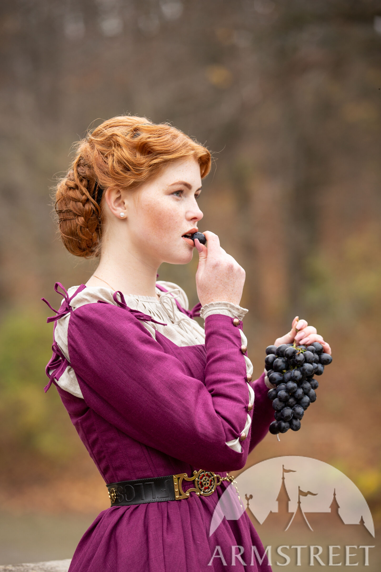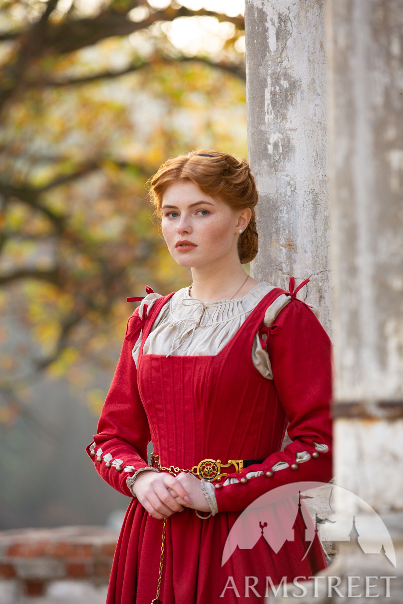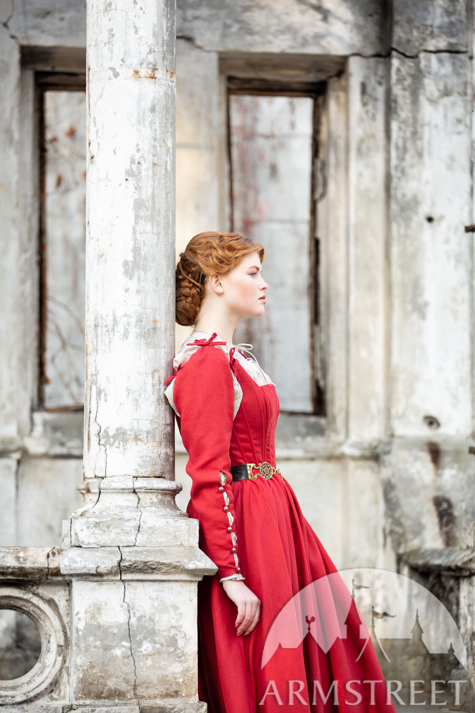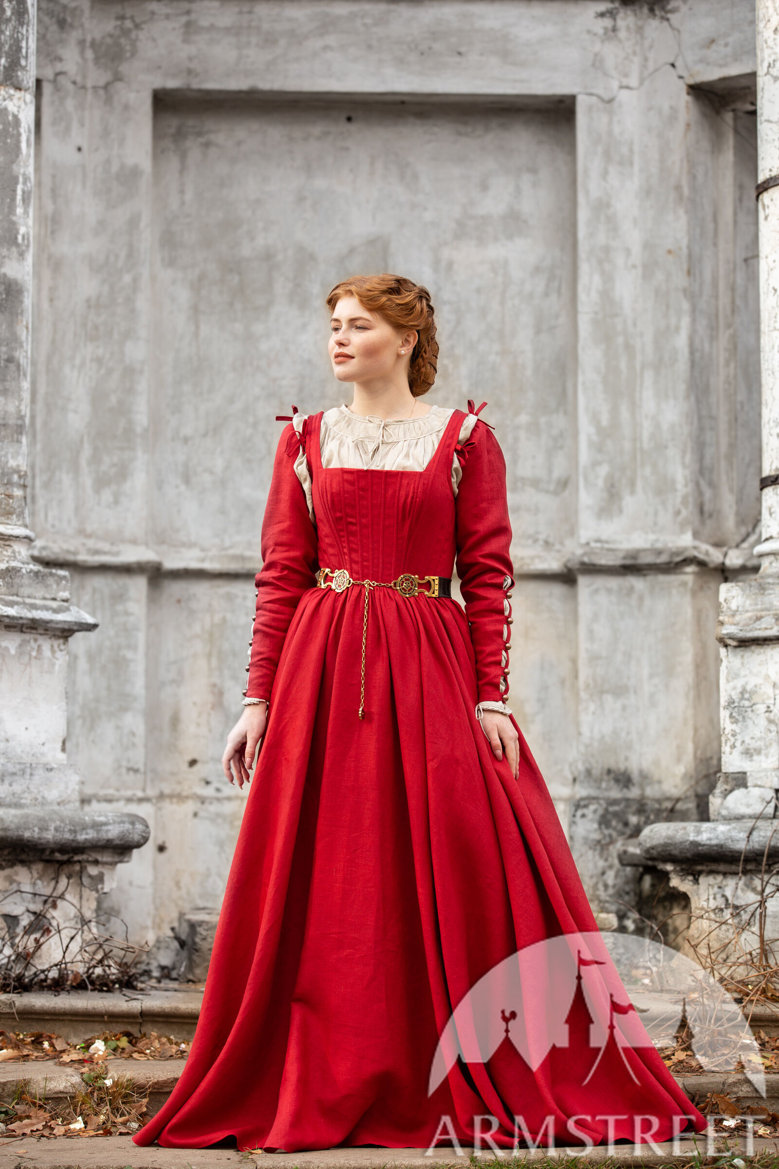 Cette robe a été largement inspirée par le 16e siècle notamment par les tableaux de Woensam. Nous avons constaté l’évolution des tenues basiques de XIV-XV s., elles sont devenues plus structurées avec une ligne de taille plus remontée. Ce type de vêtements seraient portés par une femme de milieu supérieur puisqu’il est difficile de serrer le laçage sur le dos soi-même alors elle a dû avoir une servante ou une domestique. La base de la robe est pourtant luxueusement simple en vous laissant beaucoup d’espace que vous êtes libre de personnaliser à la manière qui convient le mieux à votre personnage. Et qui sait – peut-être votre personnage de paysanne sera assez habile pour serrer elle-même le laçage de dos !